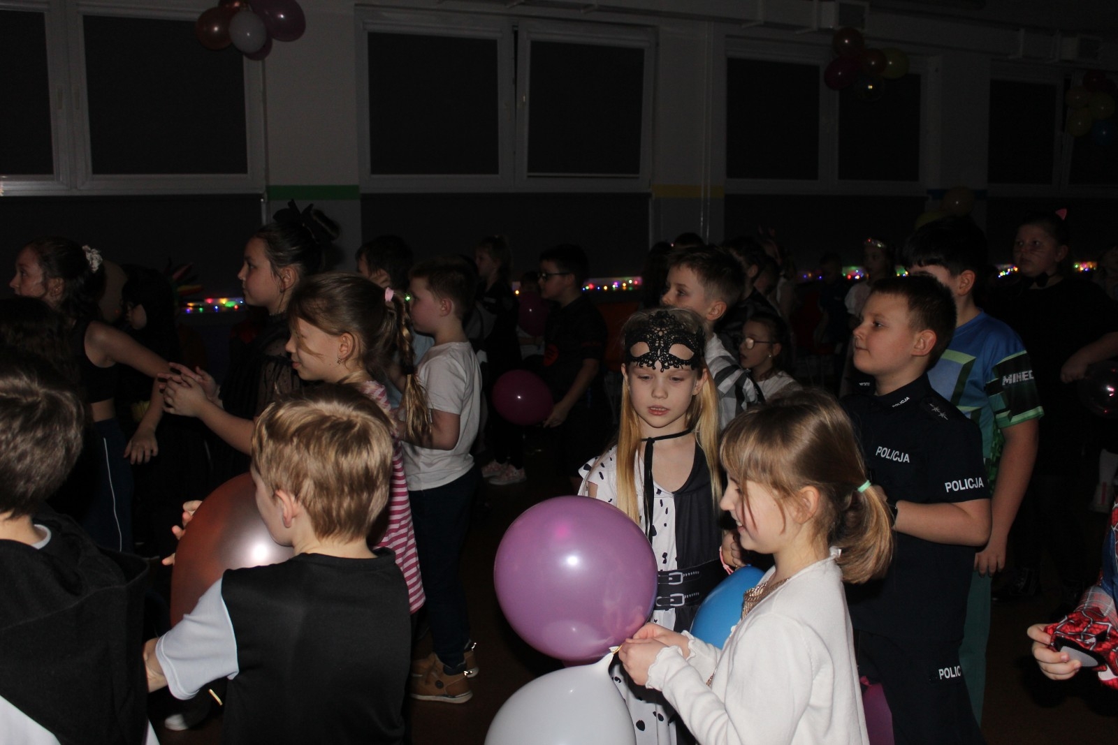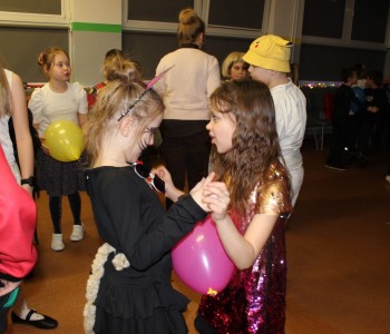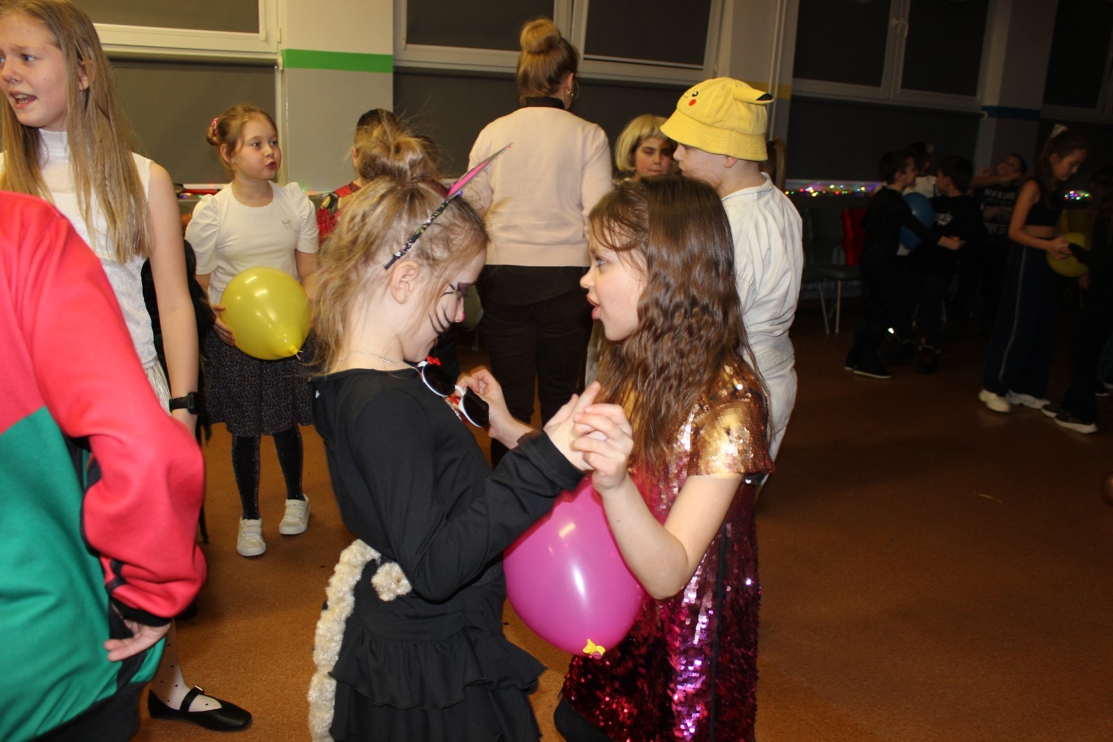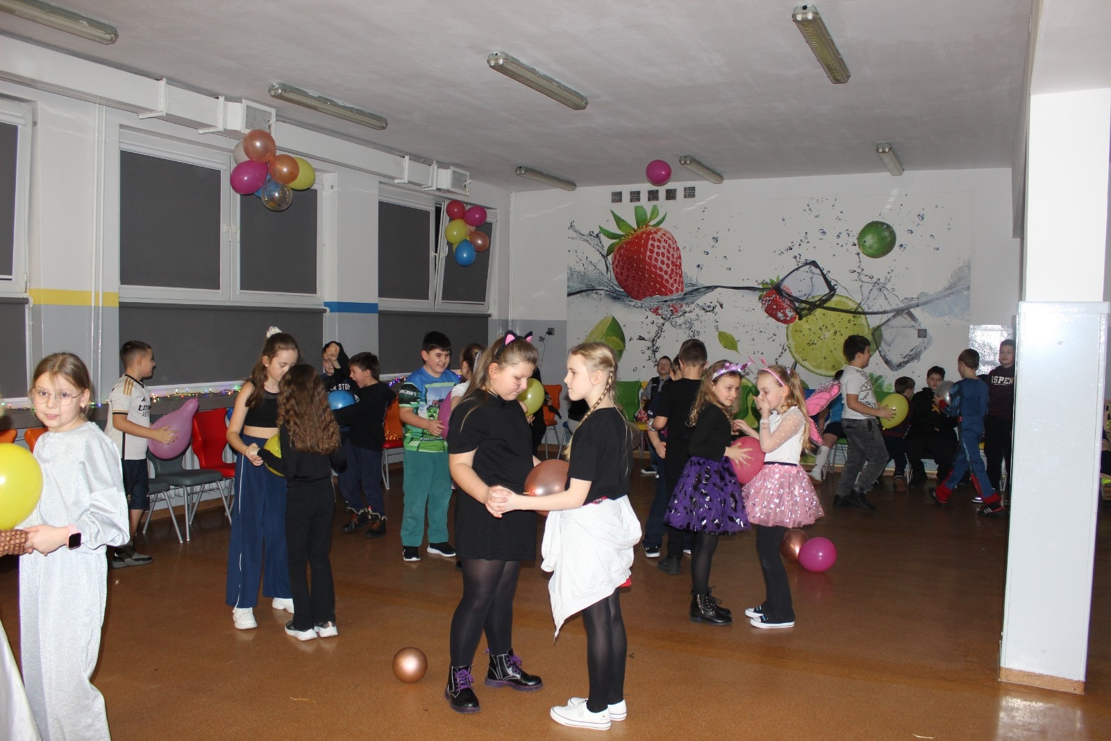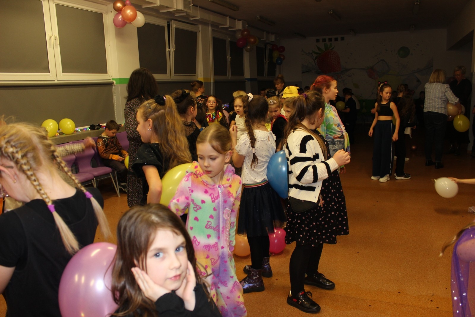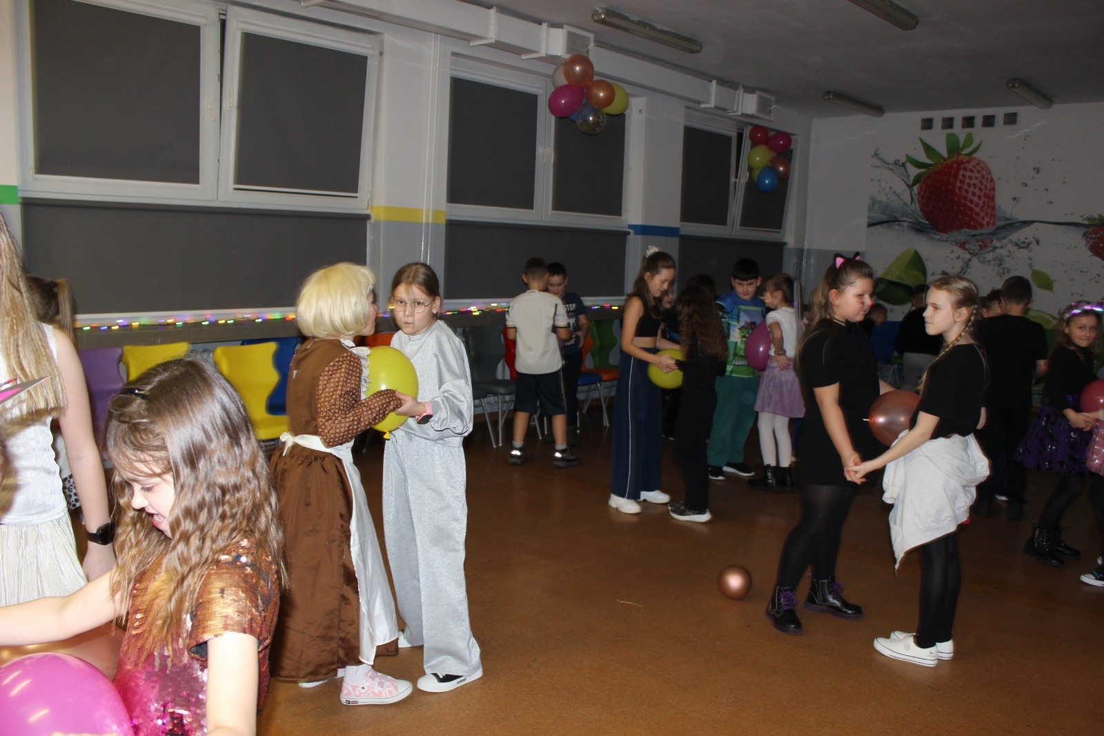 Szkolna stołówka zamieniła się w salę do tańca, przystrojoną kolorowymi balonami. Dzieci przybyły tłumnie, przebrane w różnorodne stroje. Było dużo śmiechu, tańców, a także balonowe tango czy taneczny wąż.