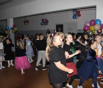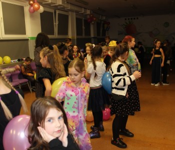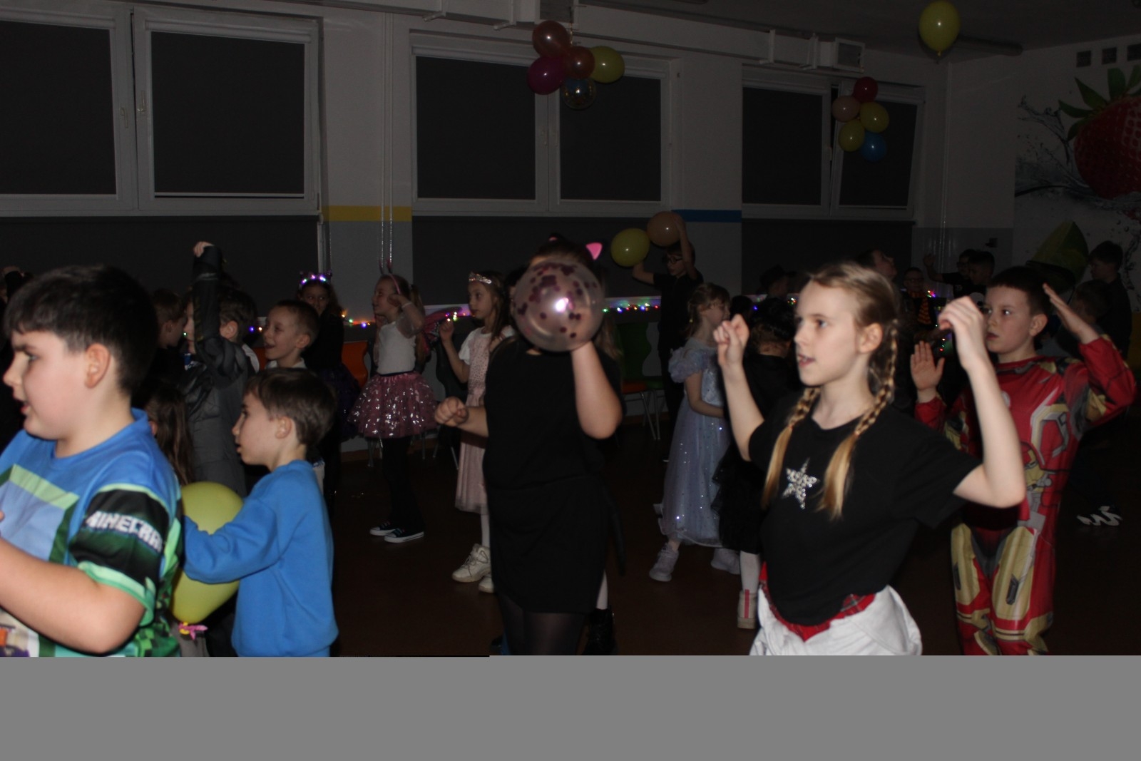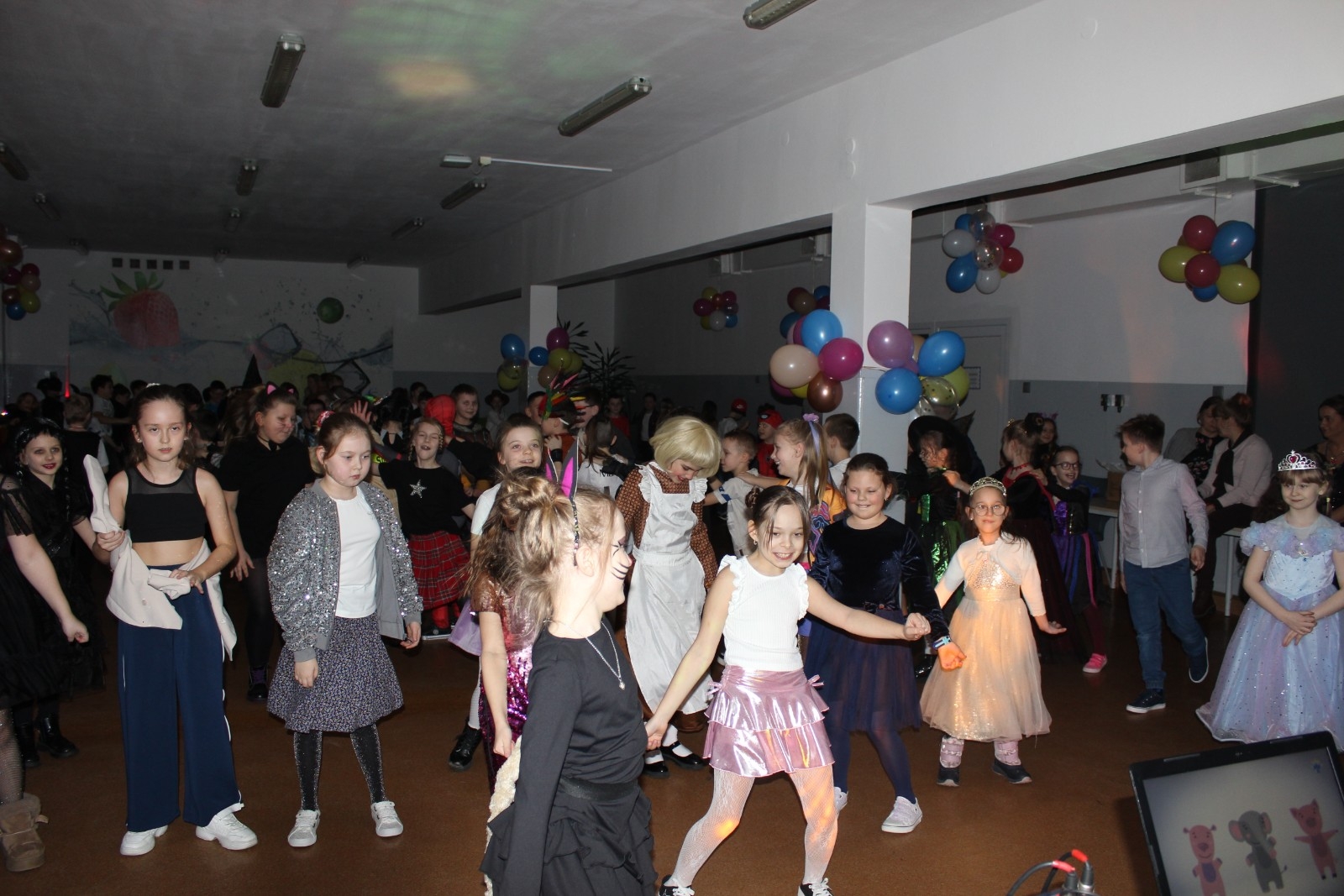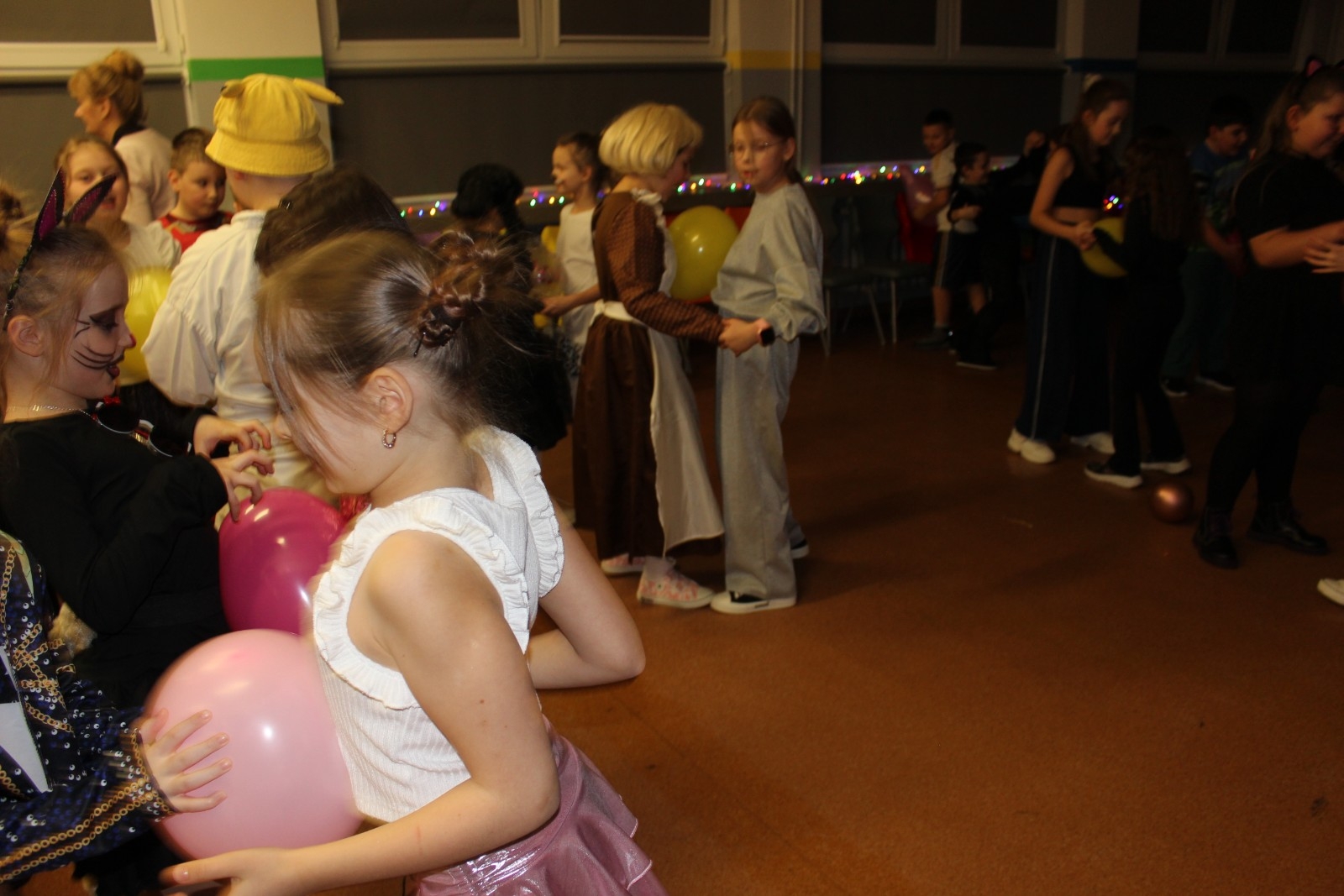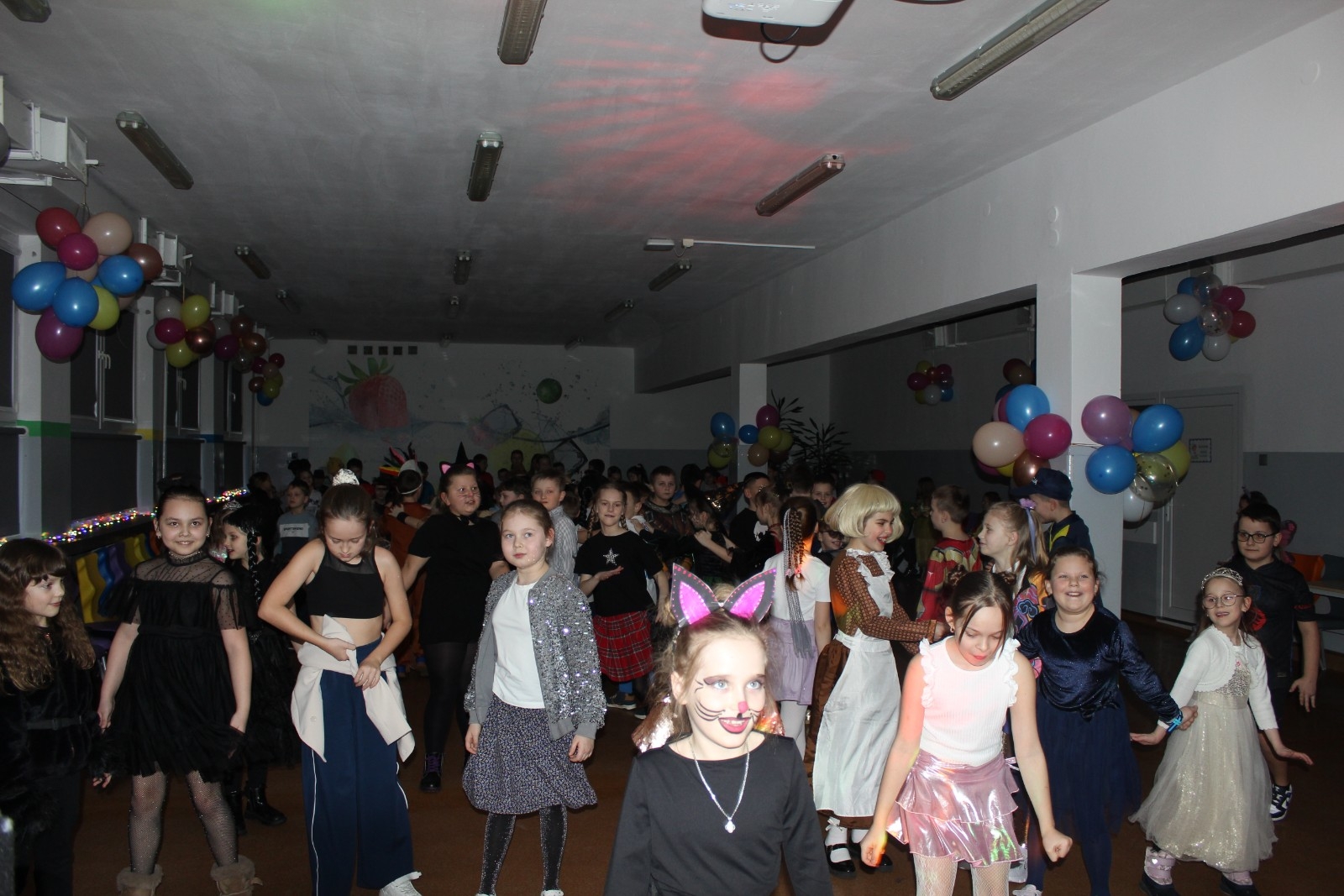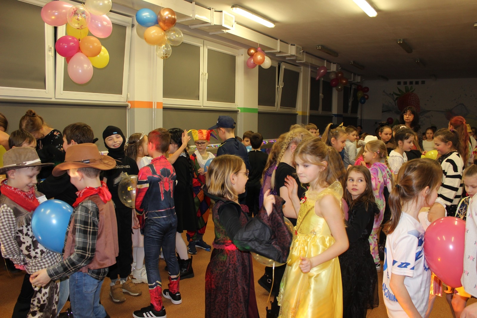 Szkolna stołówka zamieniła się w salę do tańca, przystrojoną kolorowymi balonami. Dzieci przybyły tłumnie, przebrane w różnorodne stroje. Było dużo śmiechu, tańców, a także balonowe tango czy taneczny wąż.