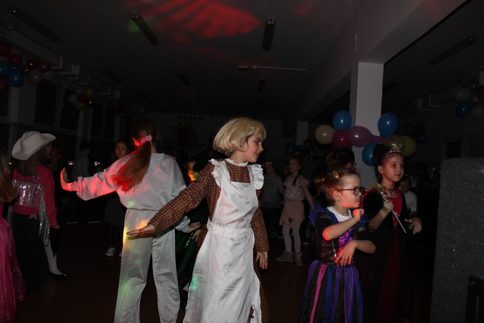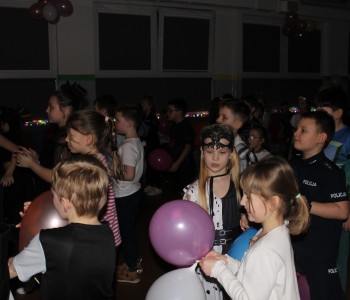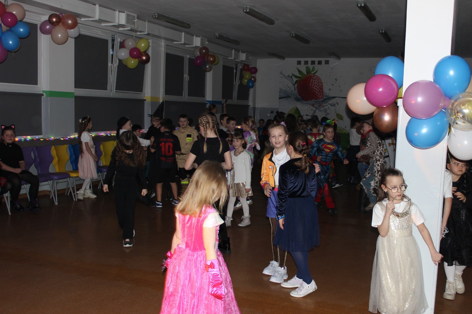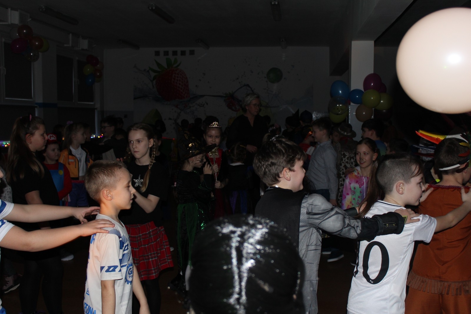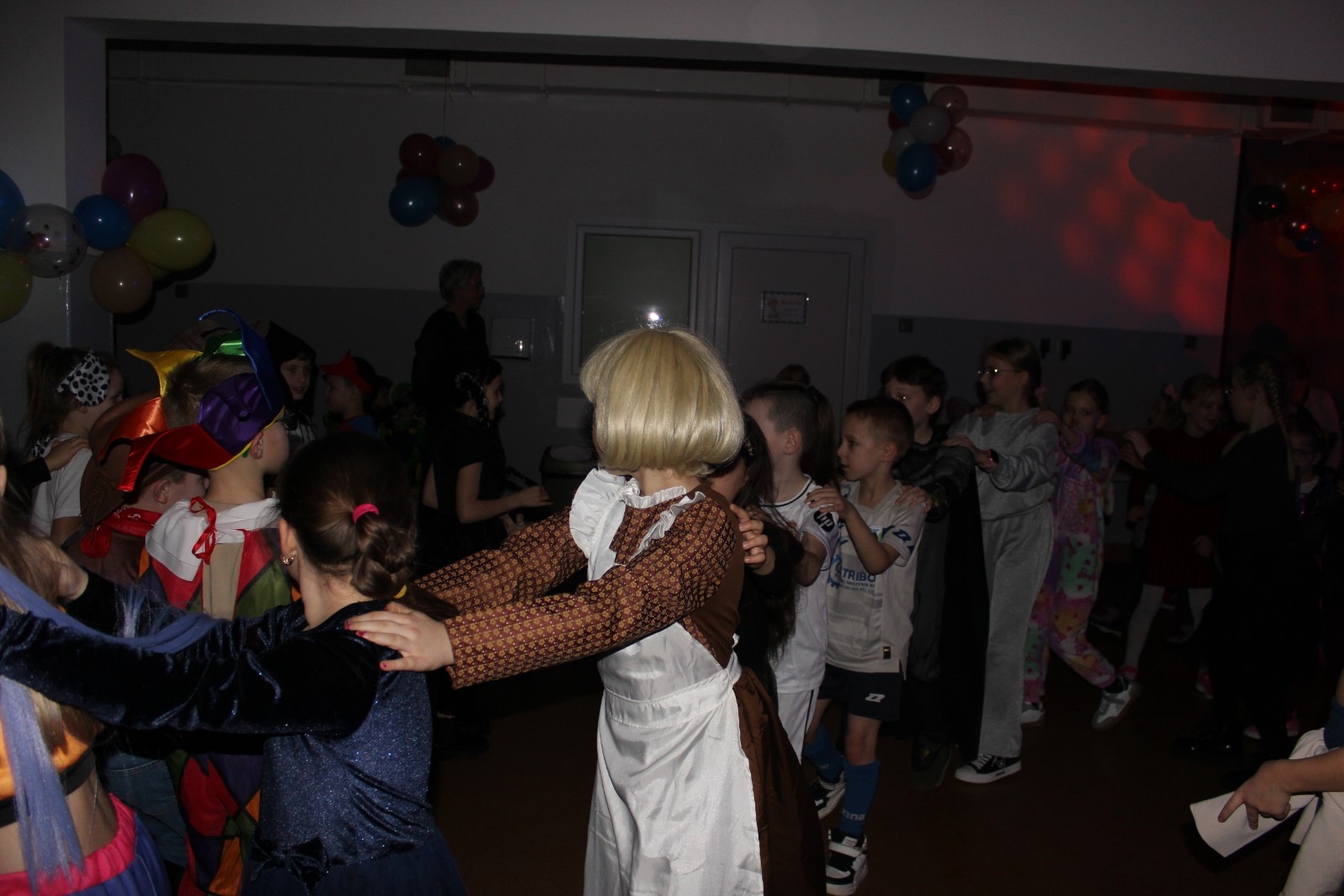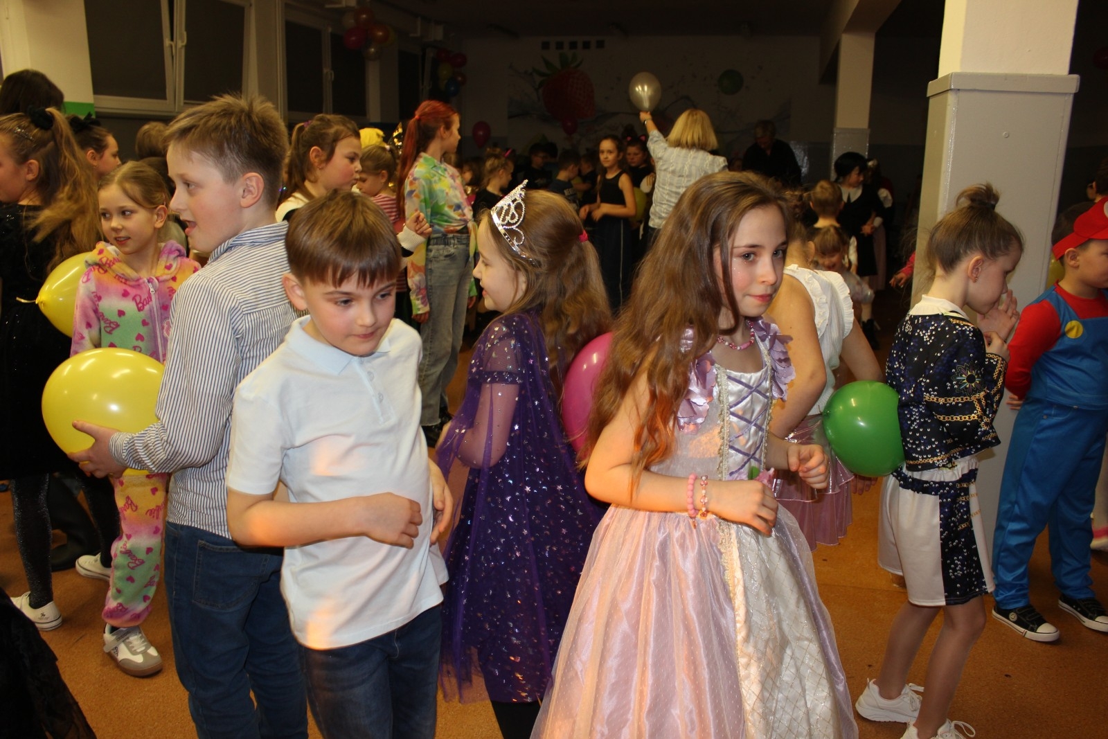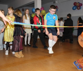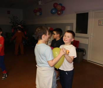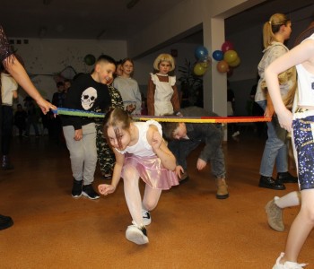 Szkolna stołówka zamieniła się w salę do tańca, przystrojoną kolorowymi balonami. Dzieci przybyły tłumnie, przebrane w różnorodne stroje. Było dużo śmiechu, tańców, a także balonowe tango czy taneczny wąż.