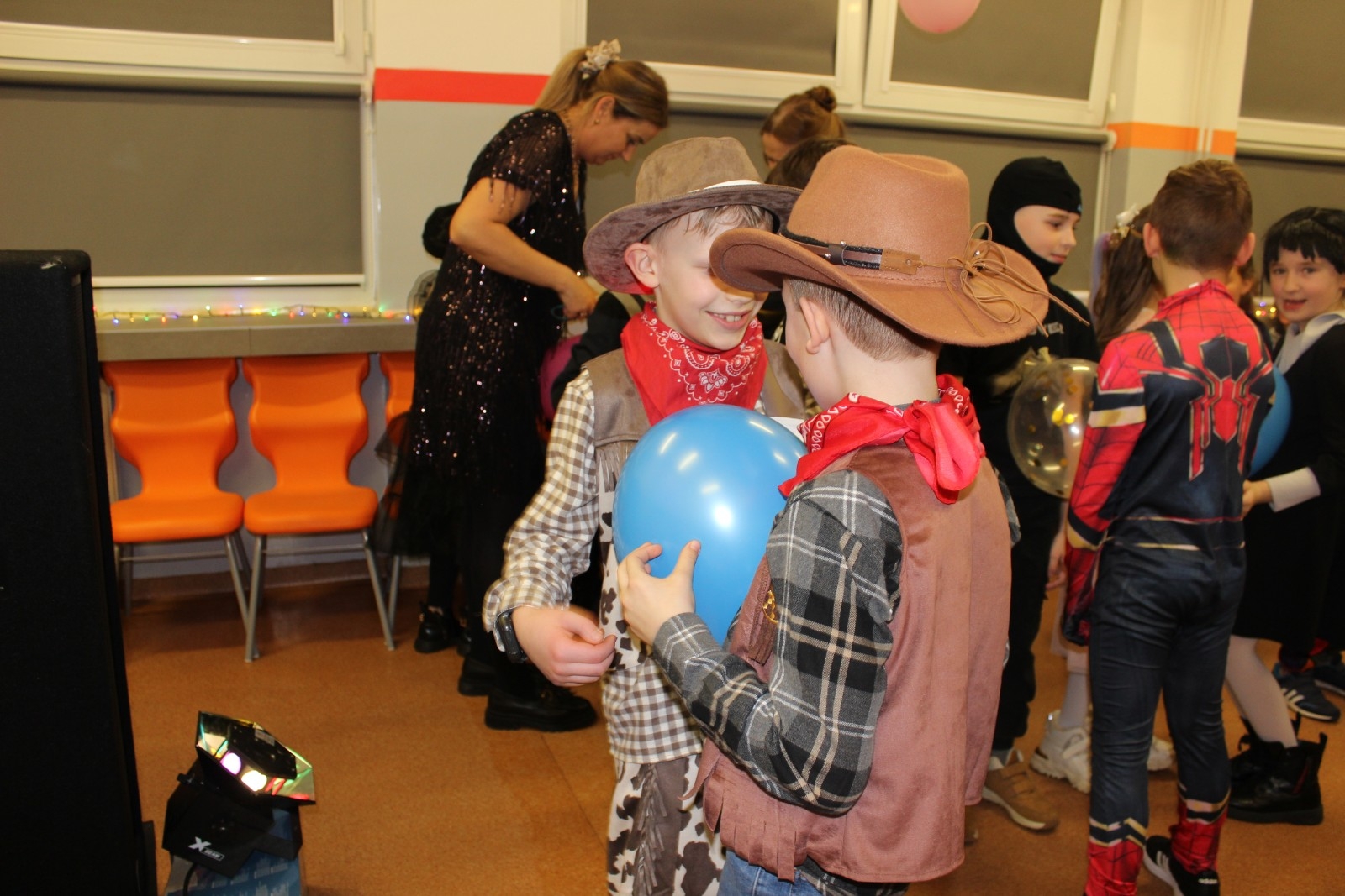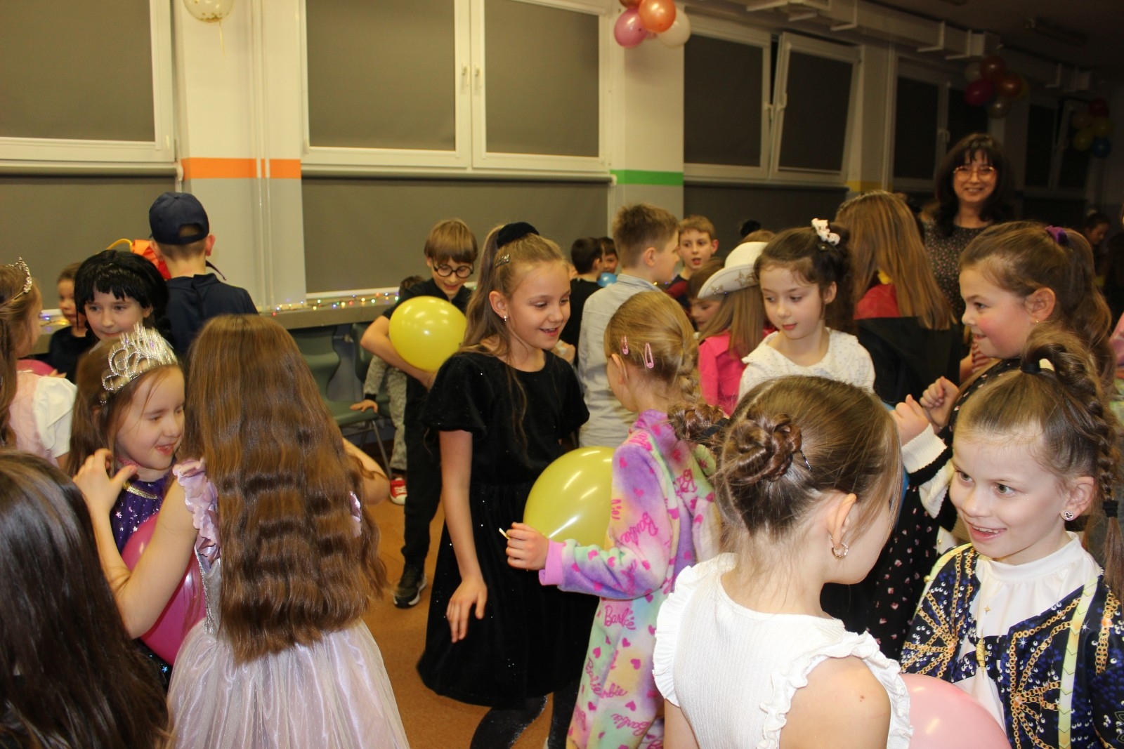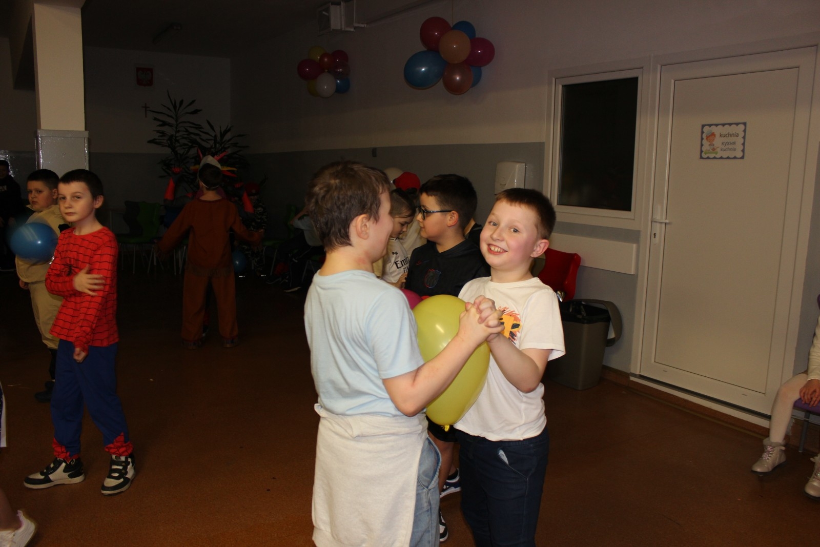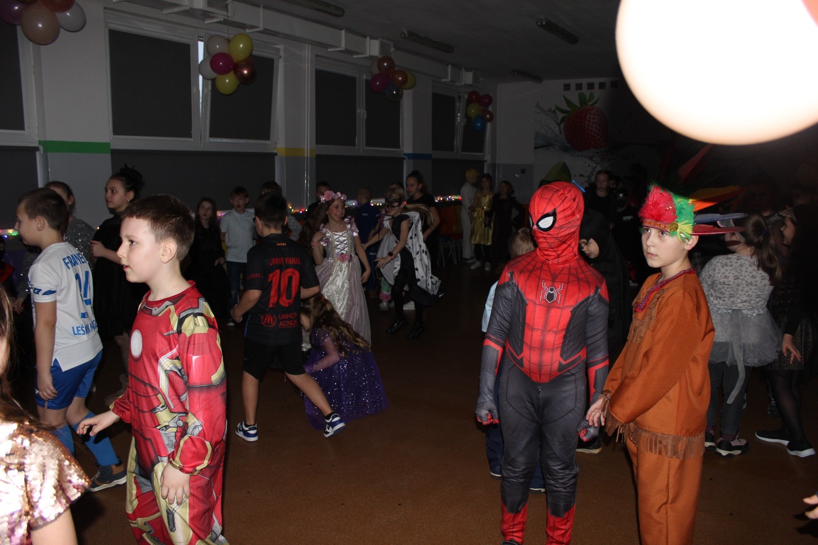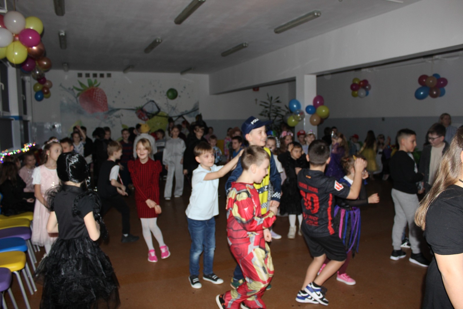 Szkolna stołówka zamieniła się w salę do tańca, przystrojoną kolorowymi balonami. Dzieci przybyły tłumnie, przebrane w różnorodne stroje. Było dużo śmiechu, tańców, a także balonowe tango czy taneczny wąż.