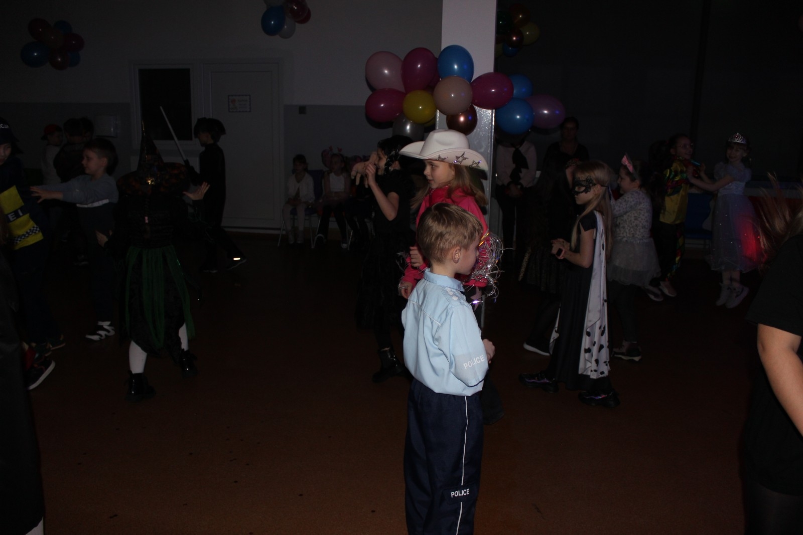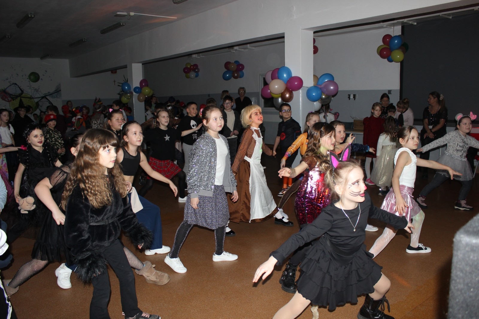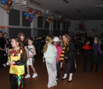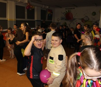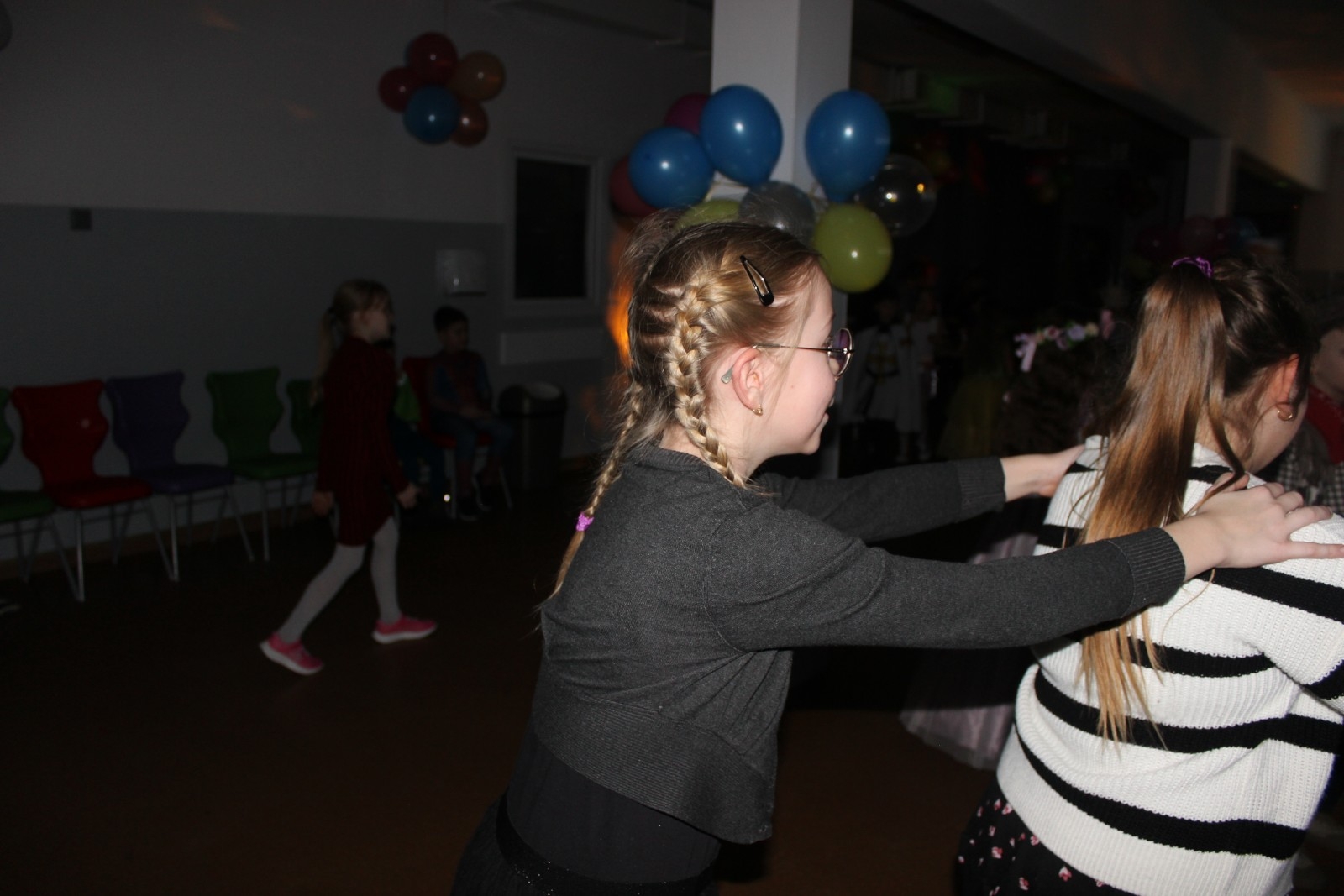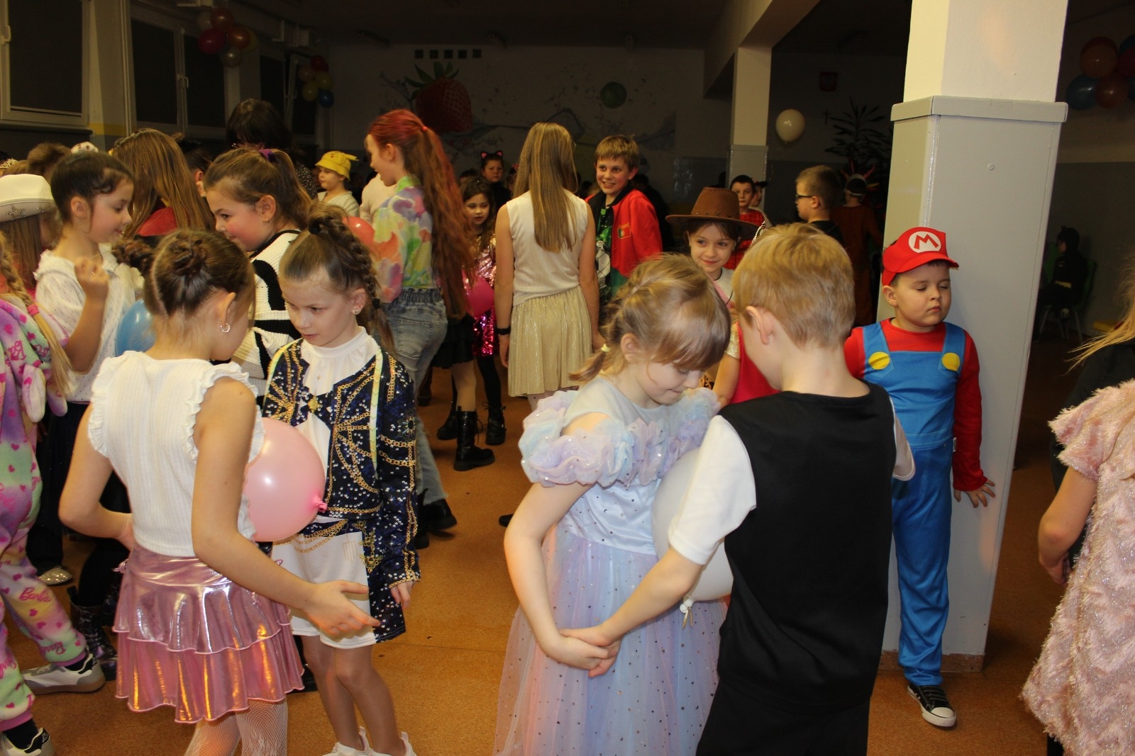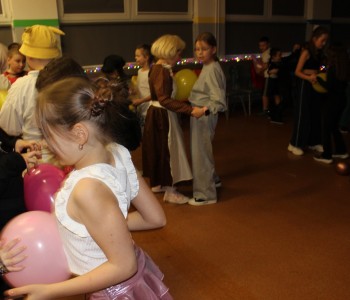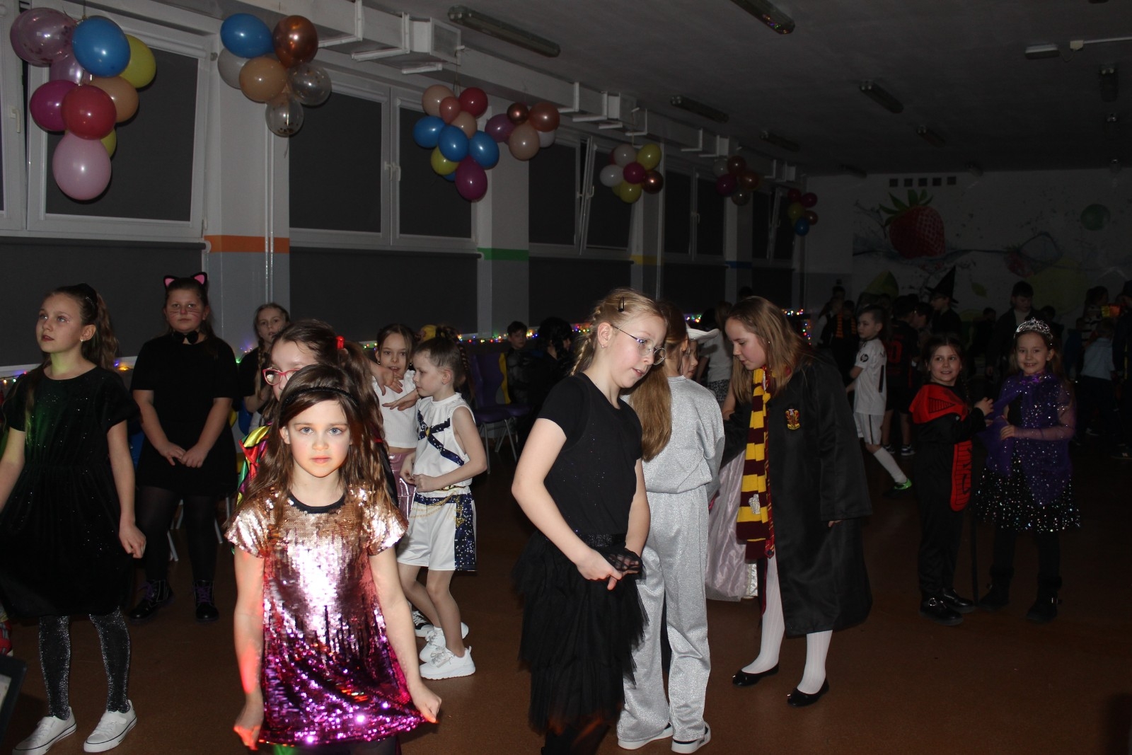 Szkolna stołówka zamieniła się w salę do tańca, przystrojoną kolorowymi balonami. Dzieci przybyły tłumnie, przebrane w różnorodne stroje. Było dużo śmiechu, tańców, a także balonowe tango czy taneczny wąż.