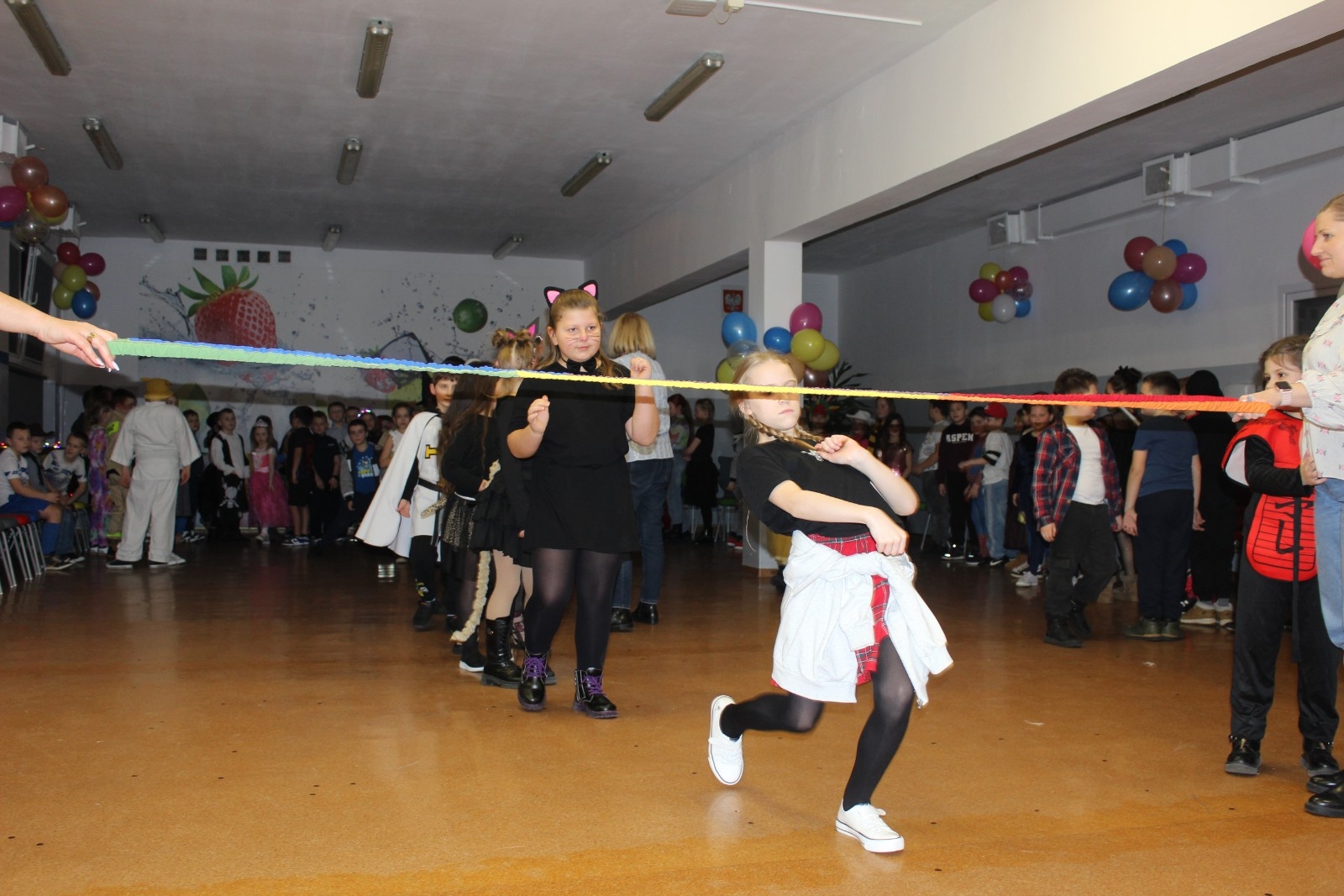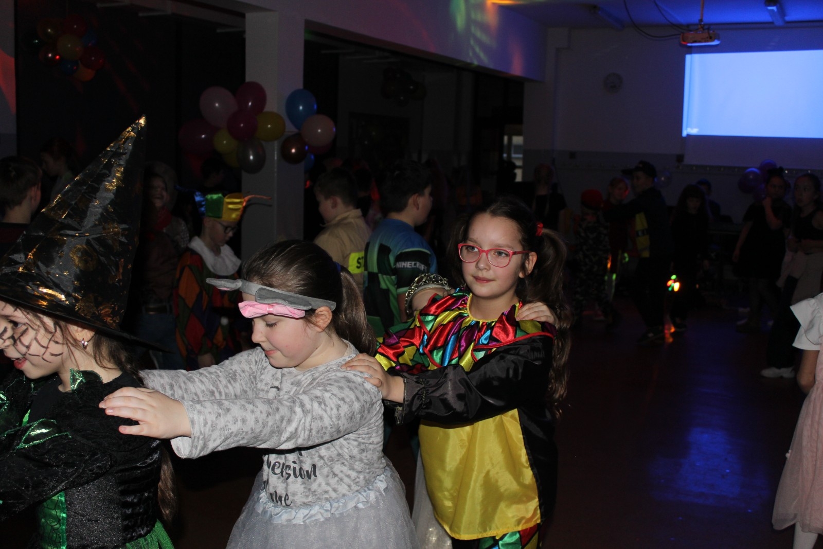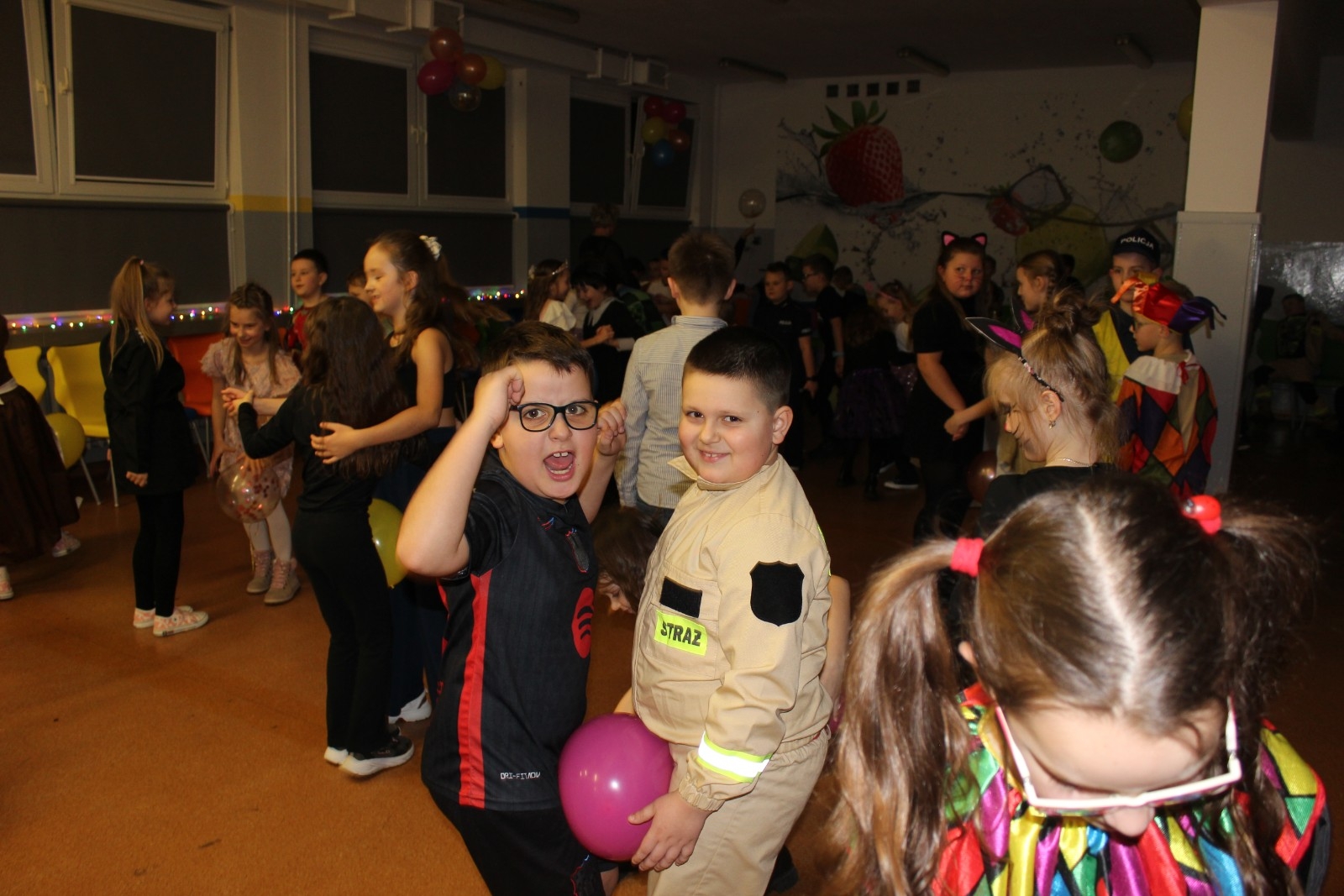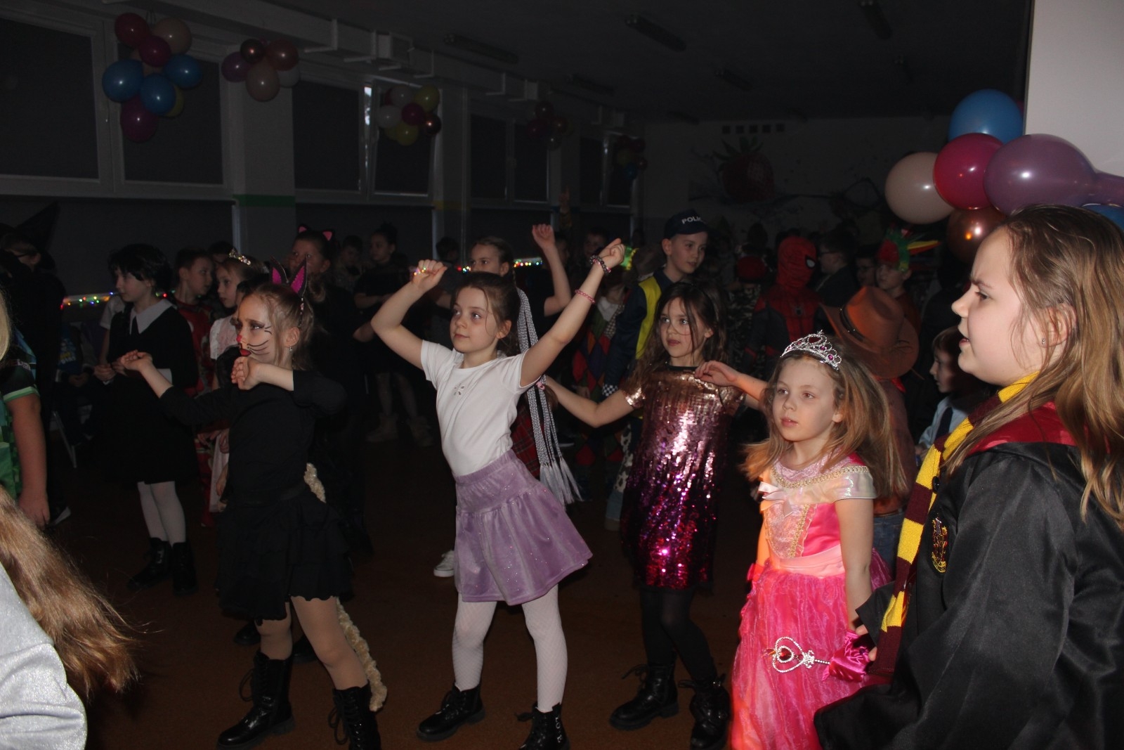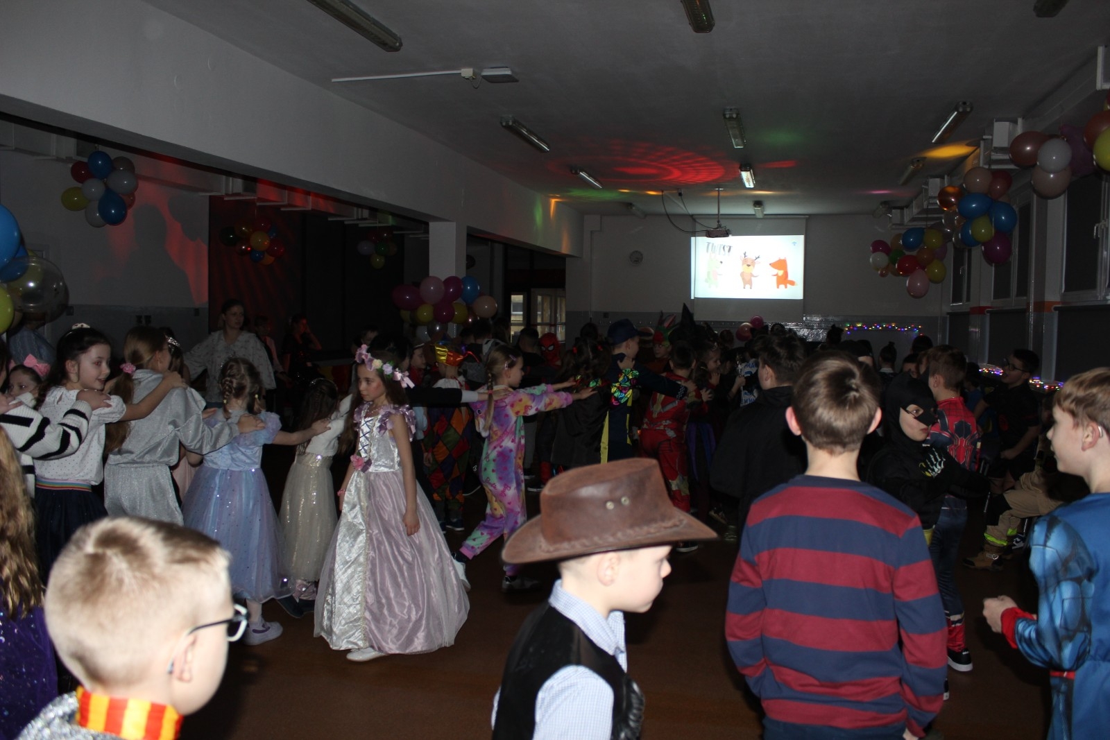 Szkolna stołówka zamieniła się w salę do tańca, przystrojoną kolorowymi balonami. Dzieci przybyły tłumnie, przebrane w różnorodne stroje. Było dużo śmiechu, tańców, a także balonowe tango czy taneczny wąż.