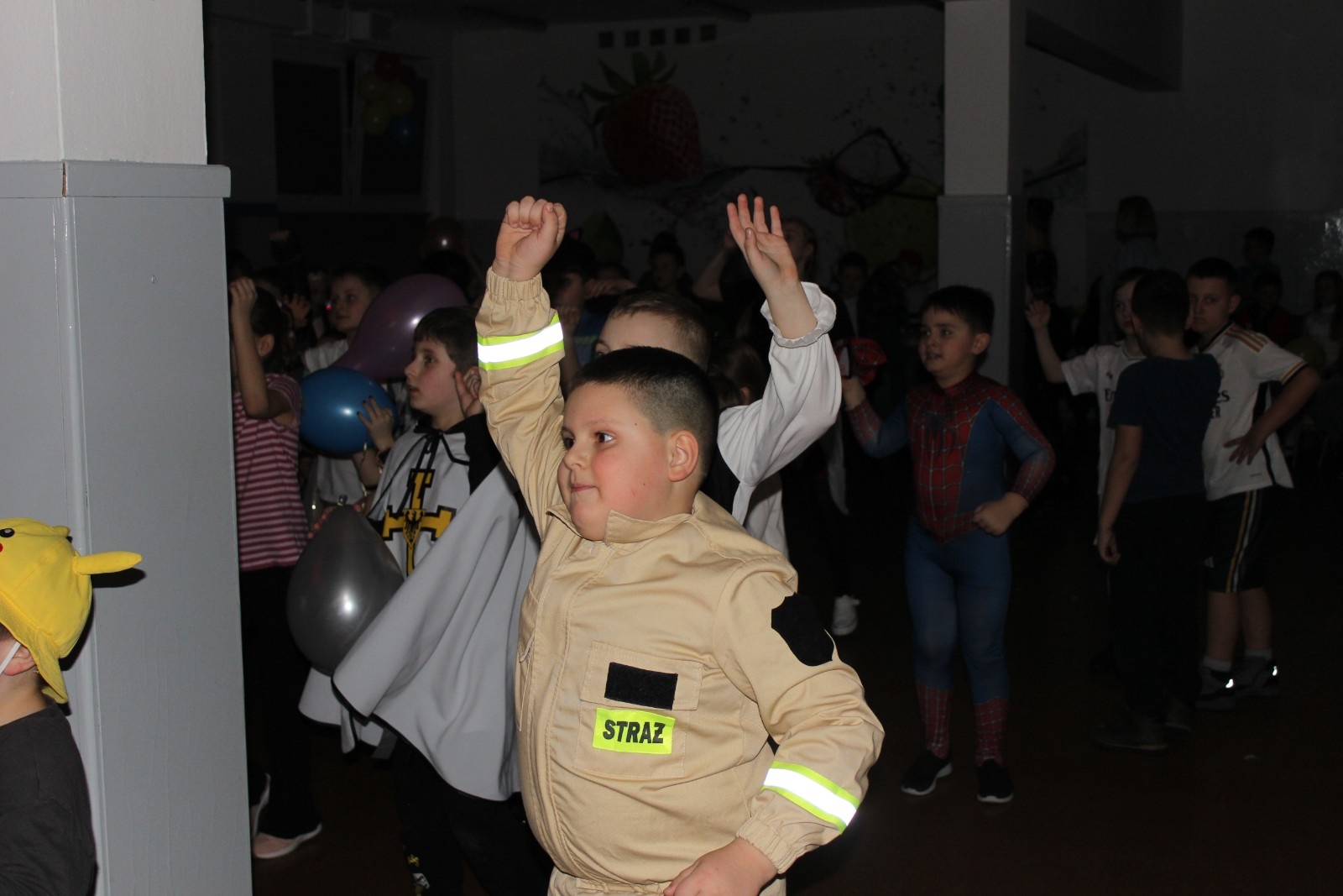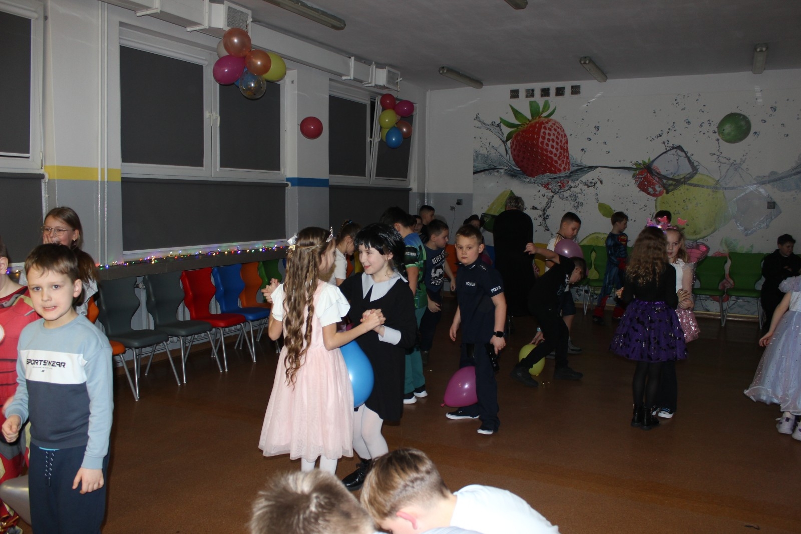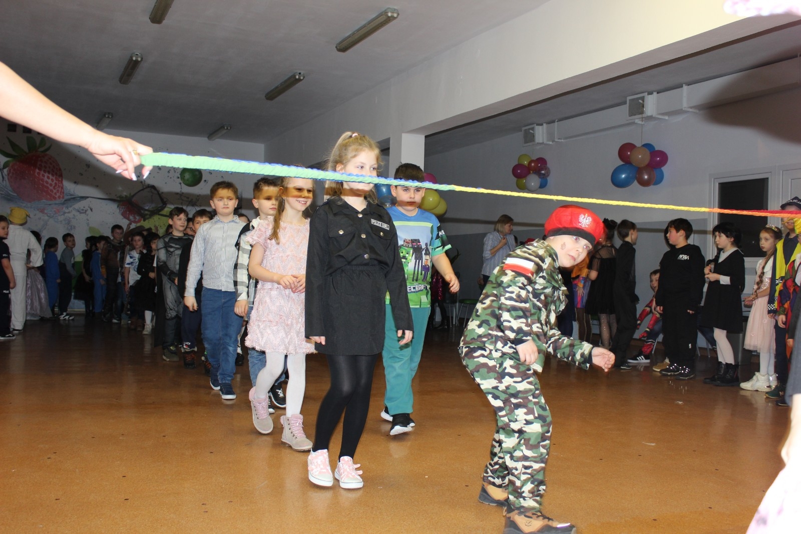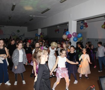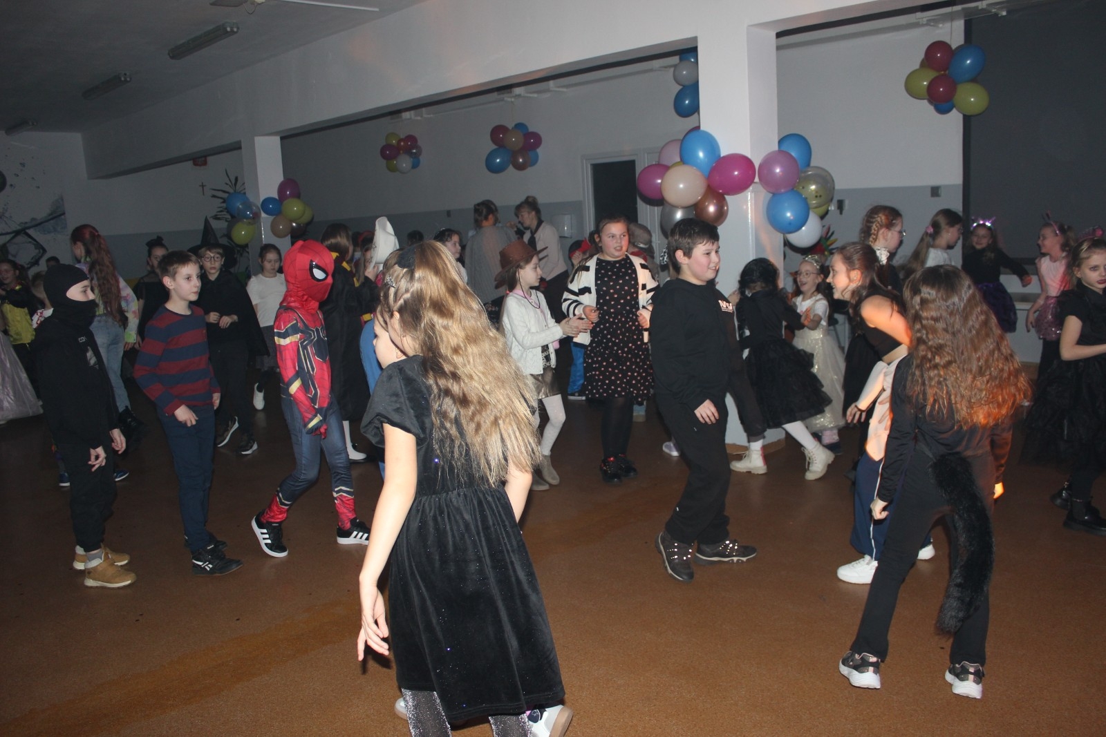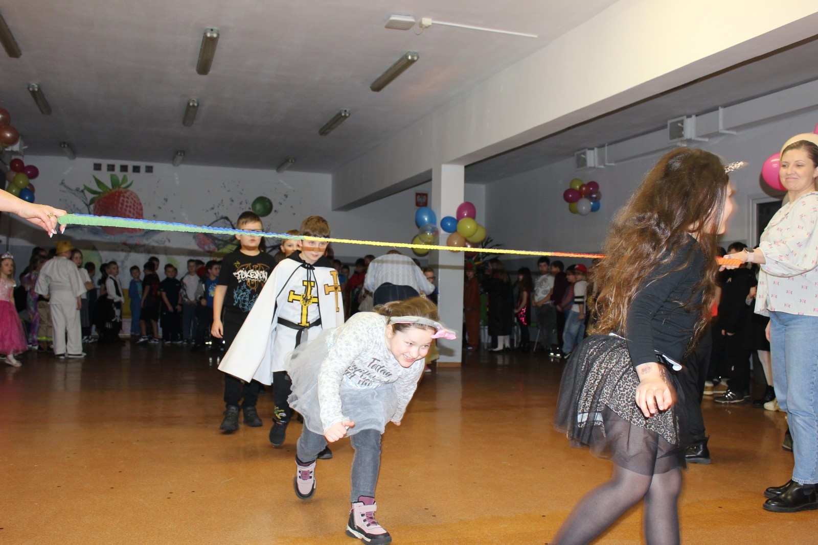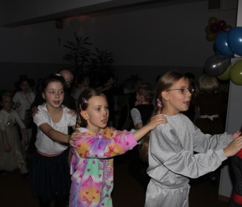 Szkolna stołówka zamieniła się w salę do tańca, przystrojoną kolorowymi balonami. Dzieci przybyły tłumnie, przebrane w różnorodne stroje. Było dużo śmiechu, tańców, a także balonowe tango czy taneczny wąż.