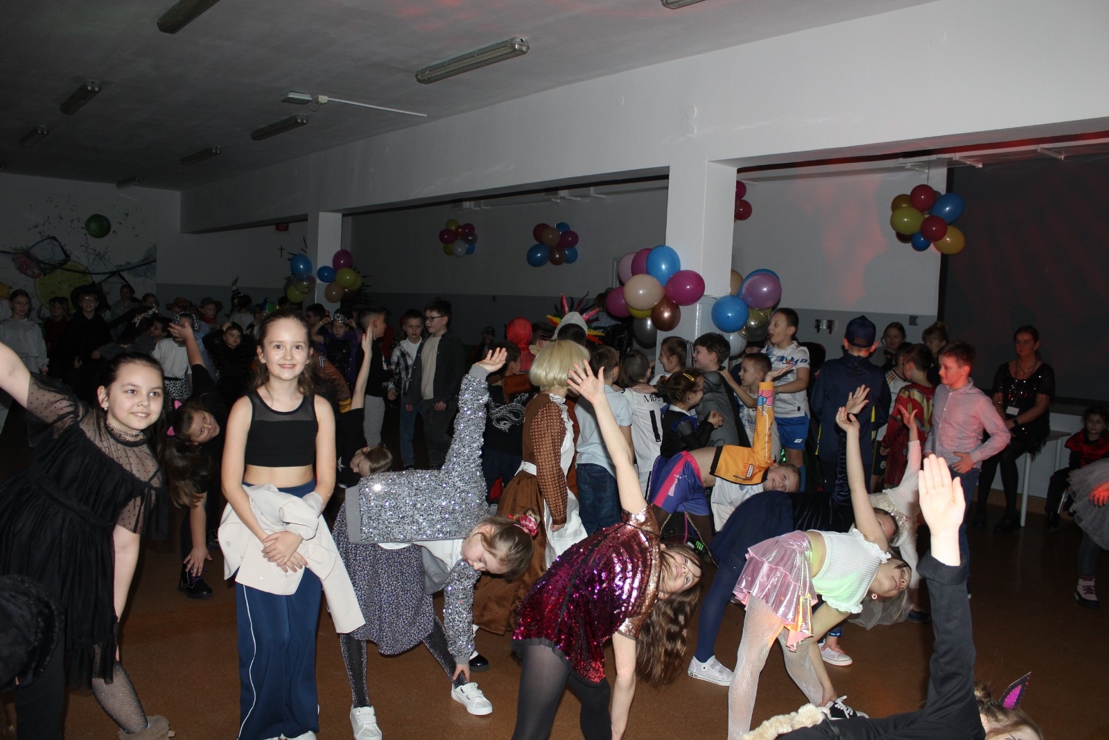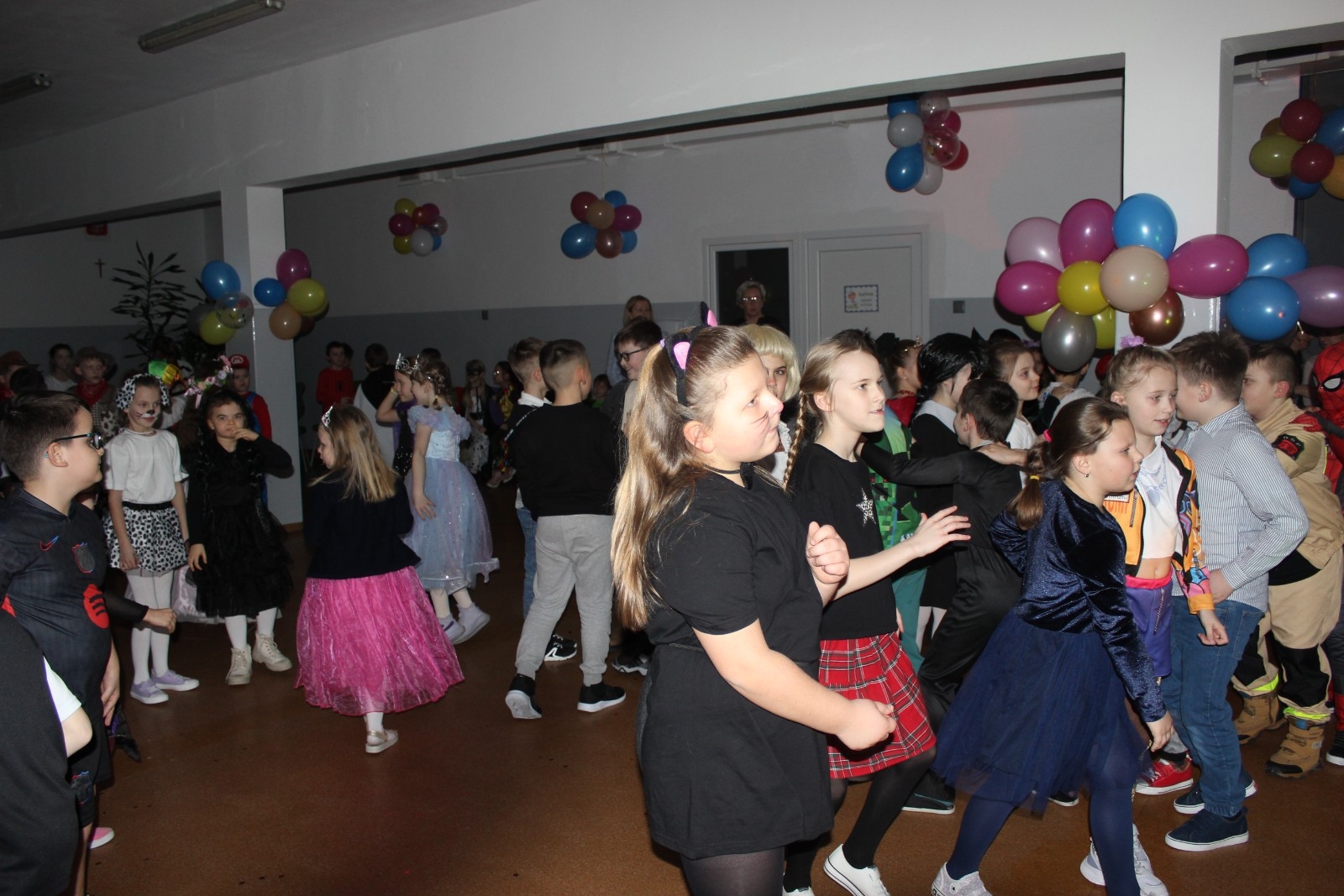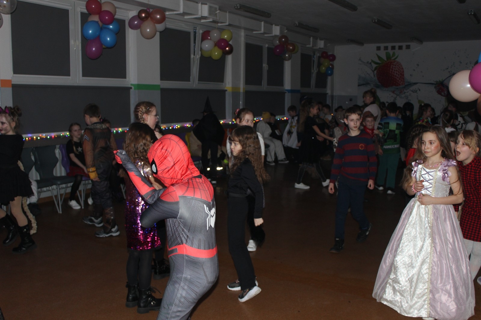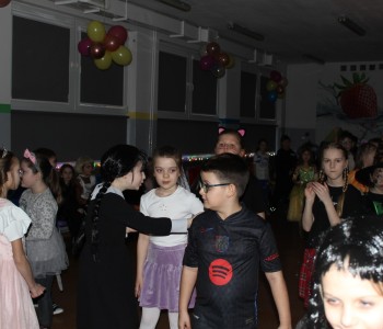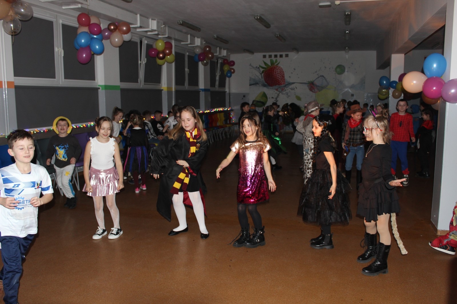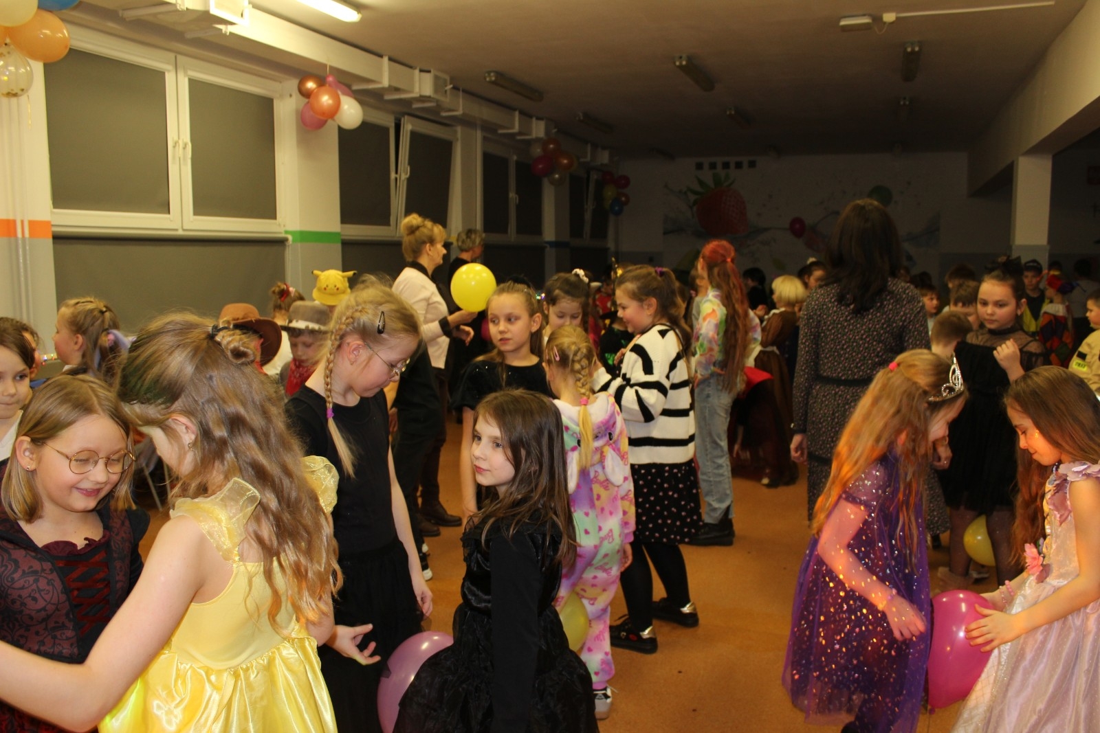 Szkolna stołówka zamieniła się w salę do tańca, przystrojoną kolorowymi balonami. Dzieci przybyły tłumnie, przebrane w różnorodne stroje. Było dużo śmiechu, tańców, a także balonowe tango czy taneczny wąż.