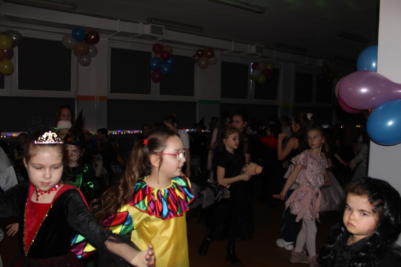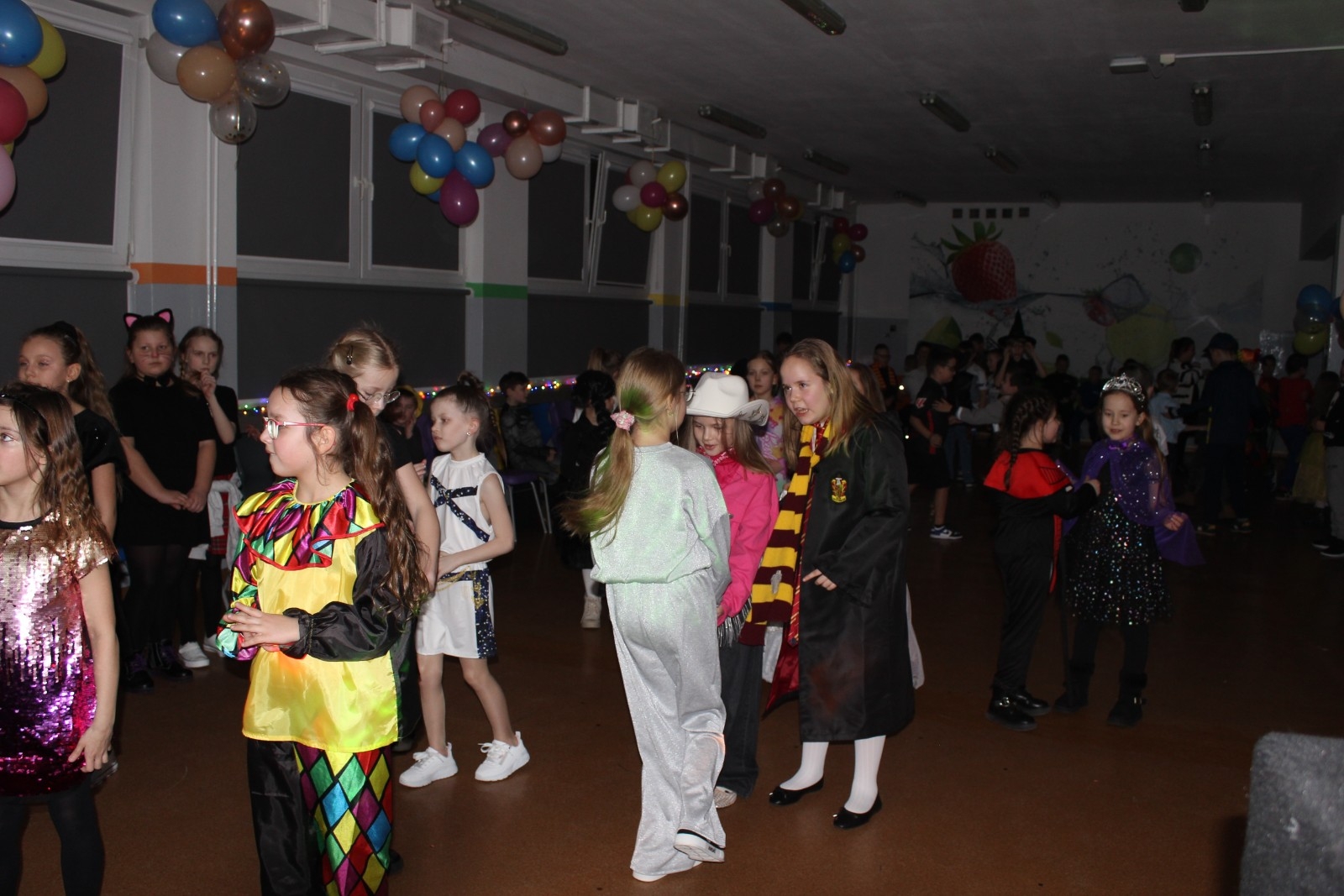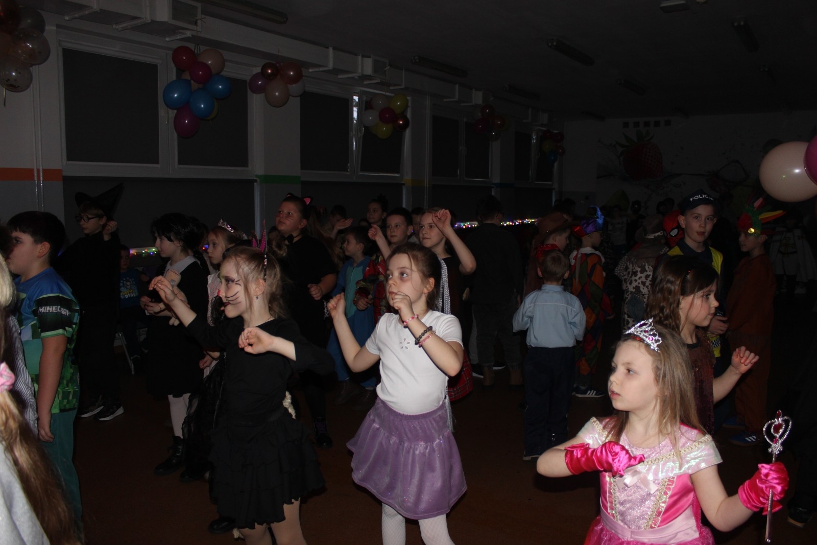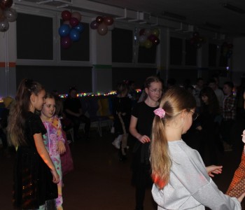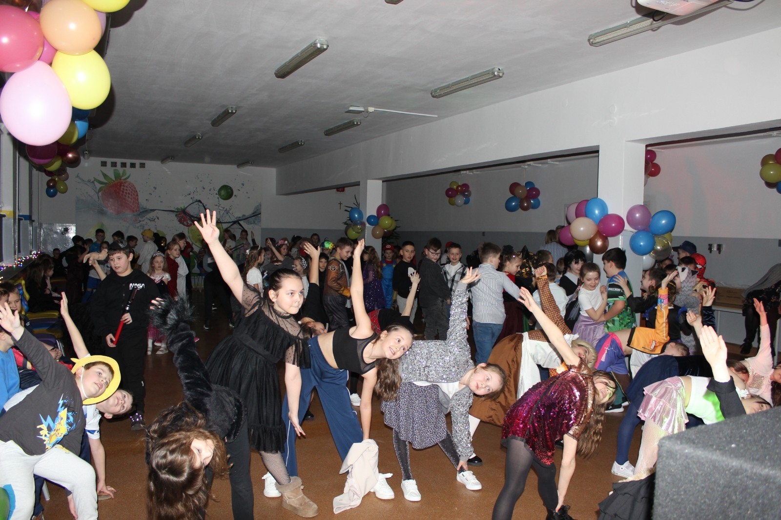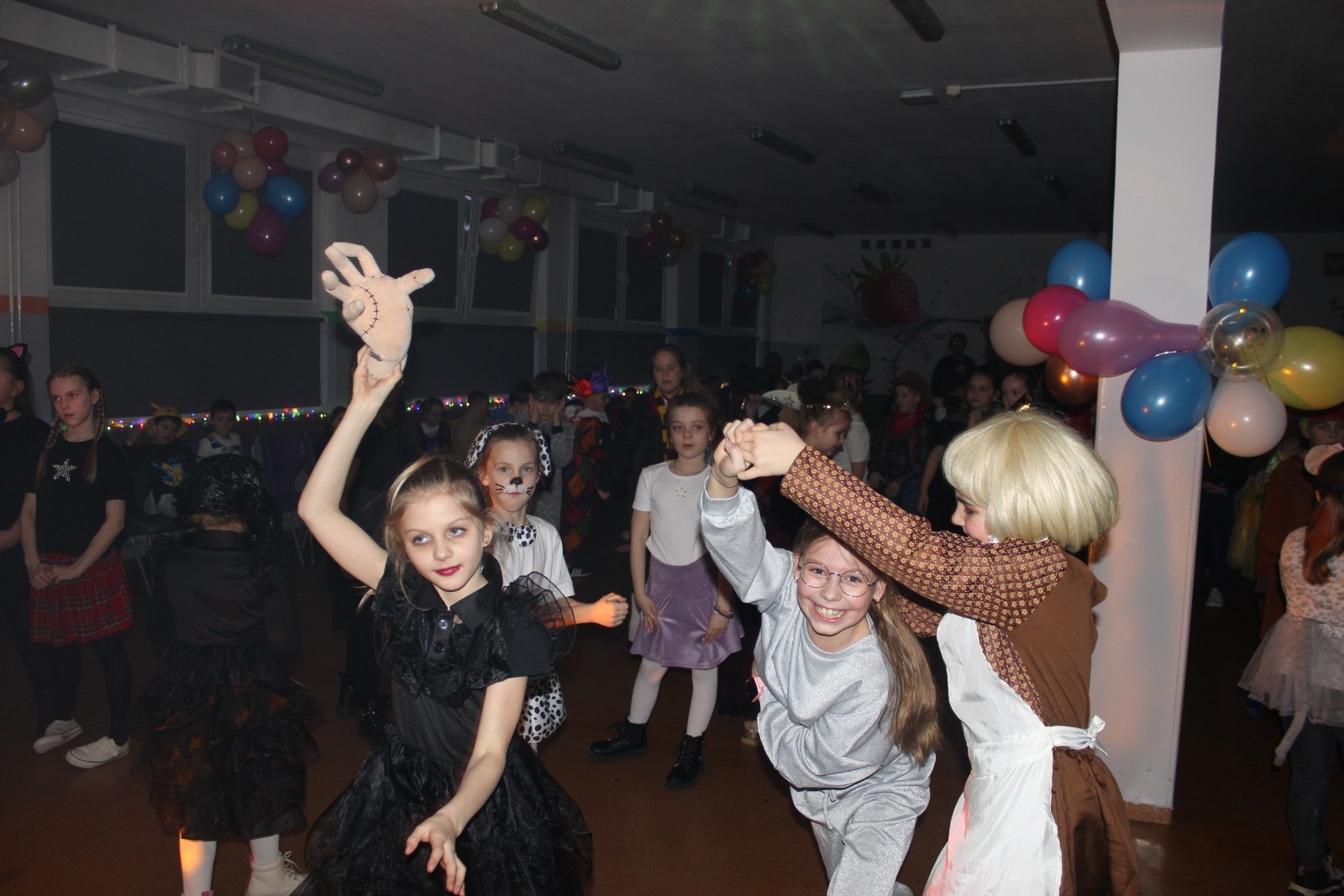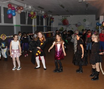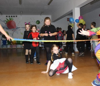 Szkolna stołówka zamieniła się w salę do tańca, przystrojoną kolorowymi balonami. Dzieci przybyły tłumnie, przebrane w różnorodne stroje. Było dużo śmiechu, tańców, a także balonowe tango czy taneczny wąż.