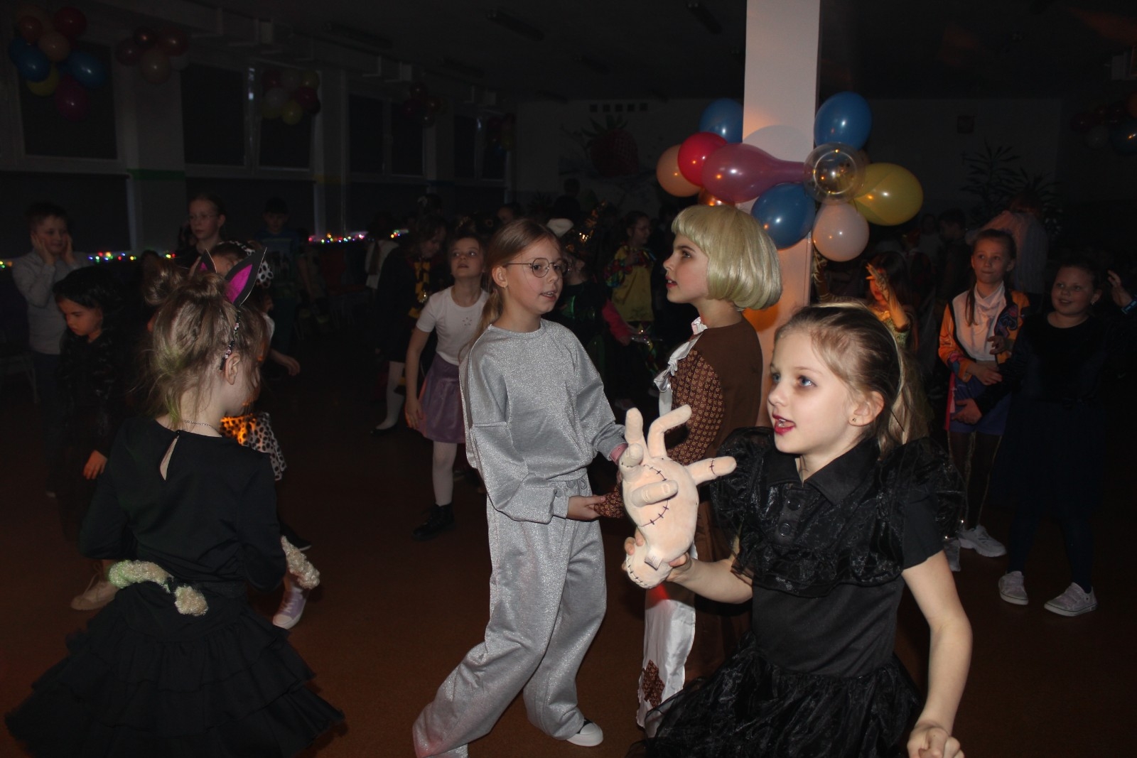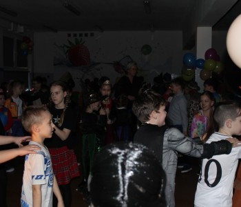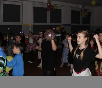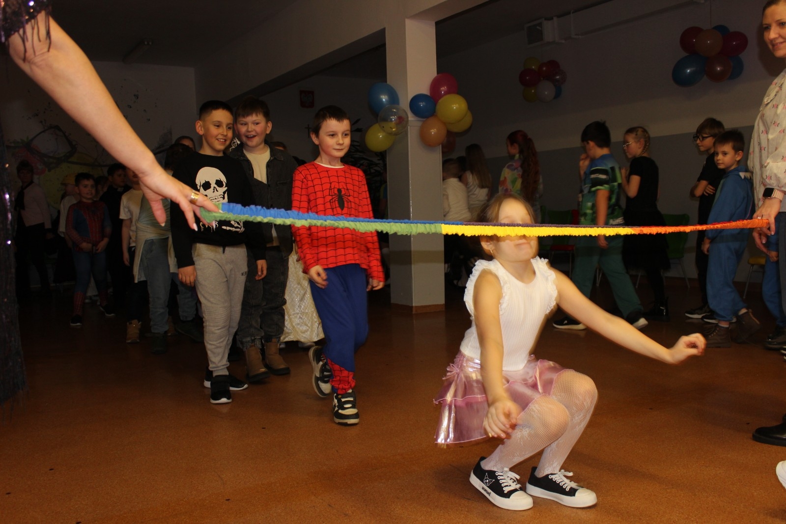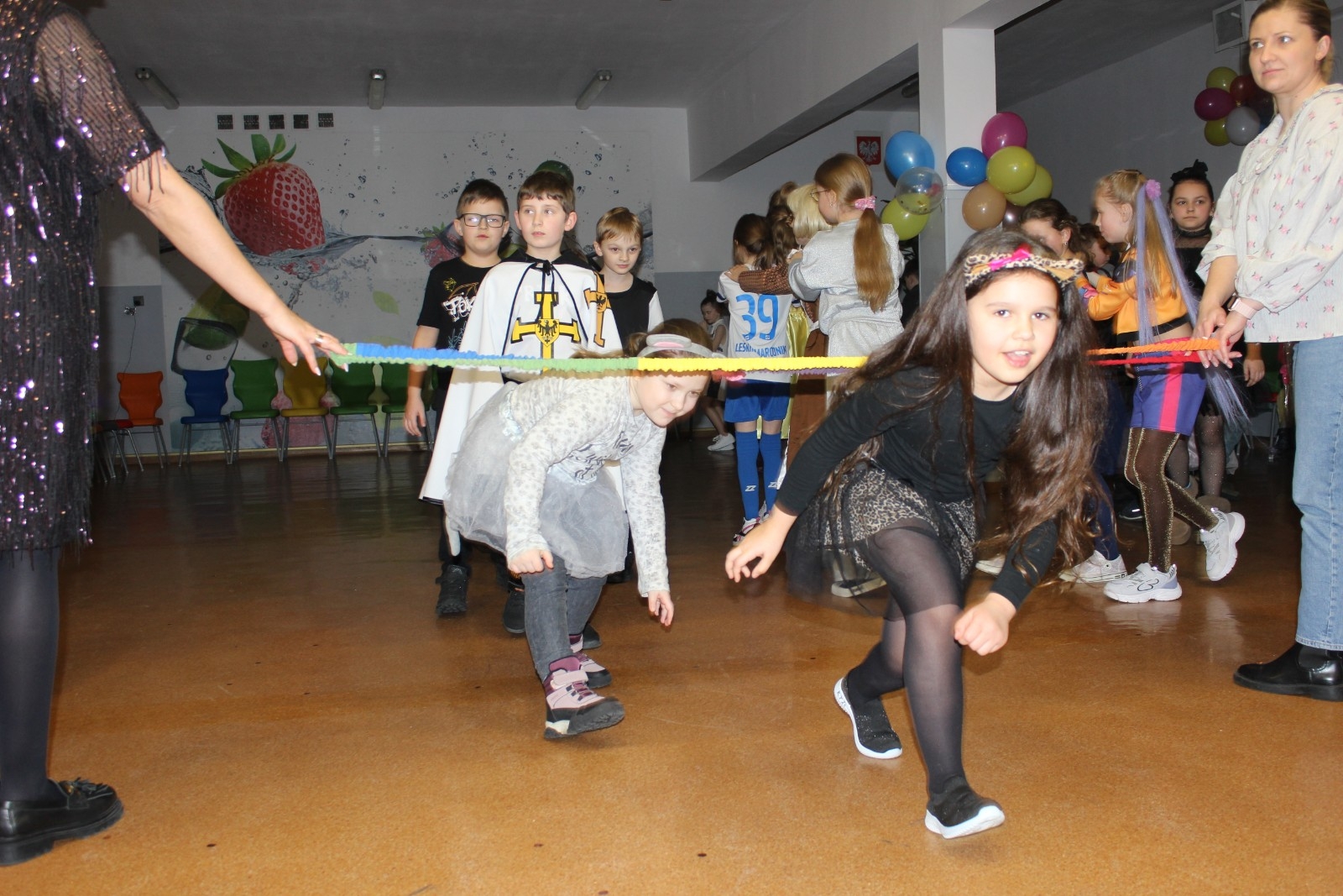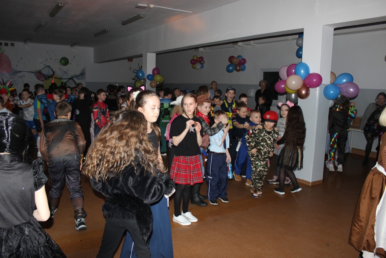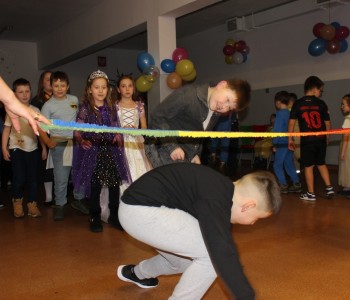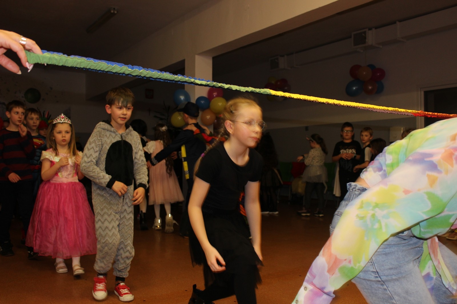 Szkolna stołówka zamieniła się w salę do tańca, przystrojoną kolorowymi balonami. Dzieci przybyły tłumnie, przebrane w różnorodne stroje. Było dużo śmiechu, tańców, a także balonowe tango czy taneczny wąż.