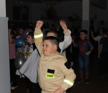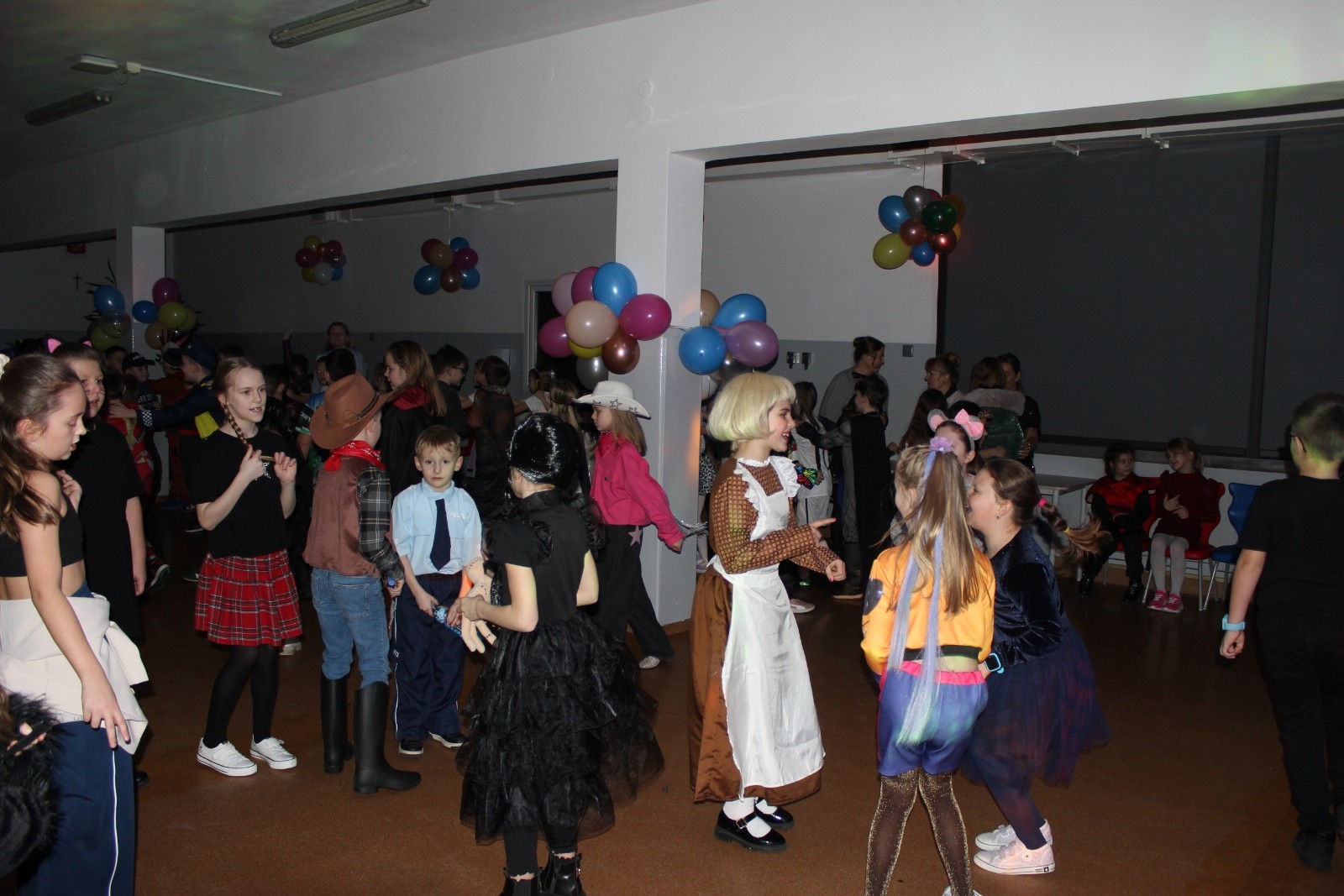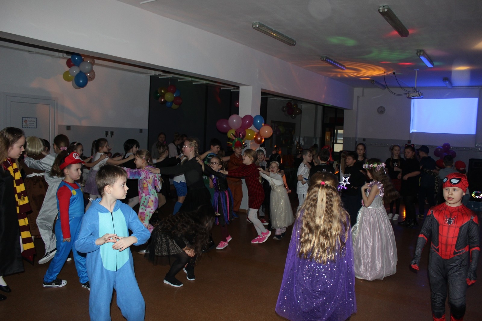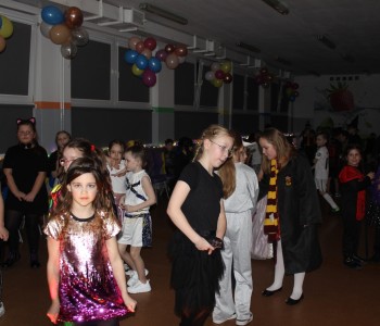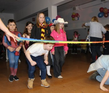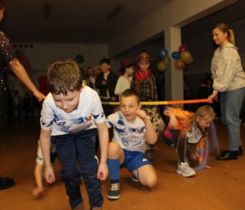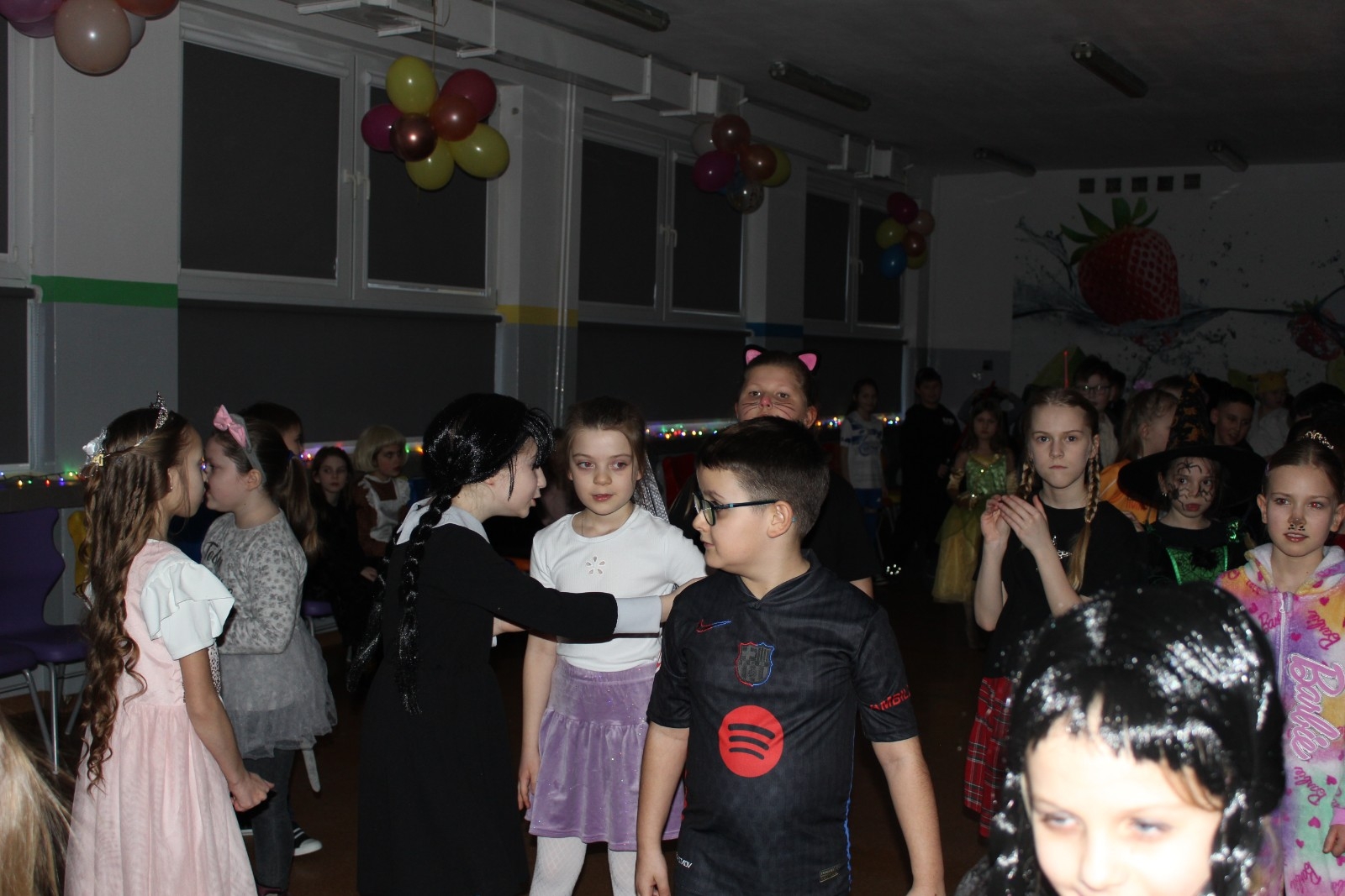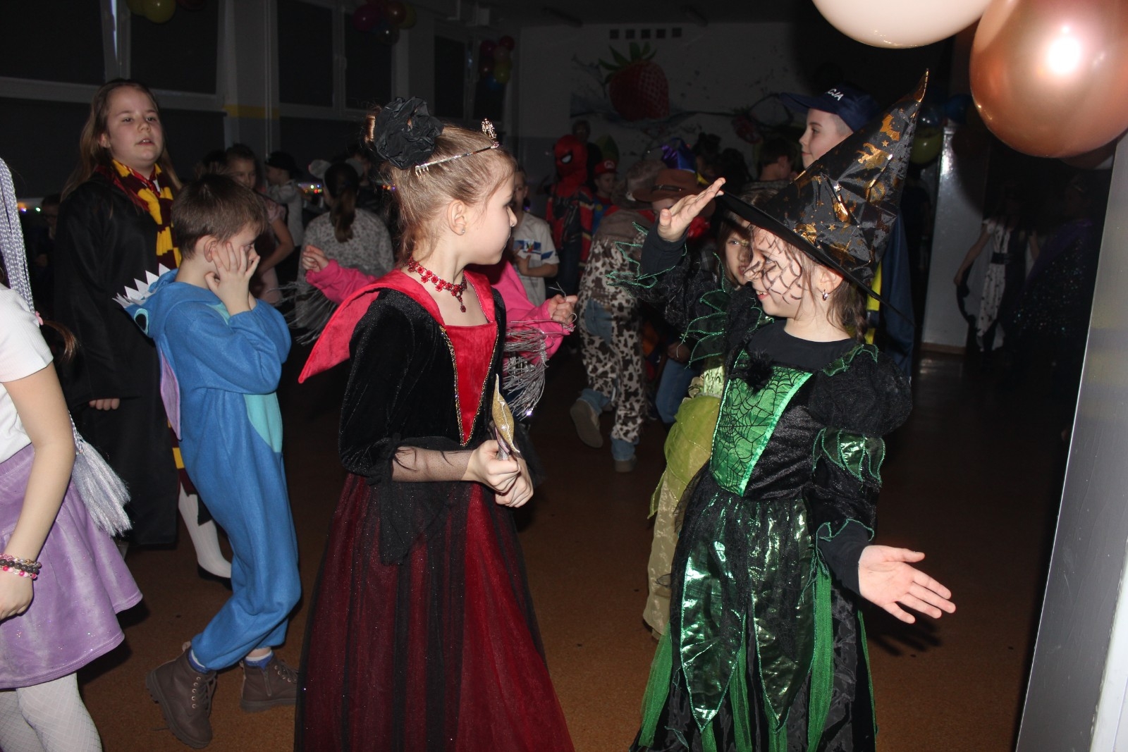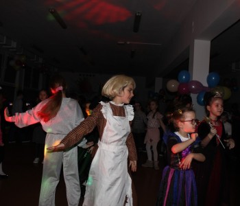 Szkolna stołówka zamieniła się w salę do tańca, przystrojoną kolorowymi balonami. Dzieci przybyły tłumnie, przebrane w różnorodne stroje. Było dużo śmiechu, tańców, a także balonowe tango czy taneczny wąż.