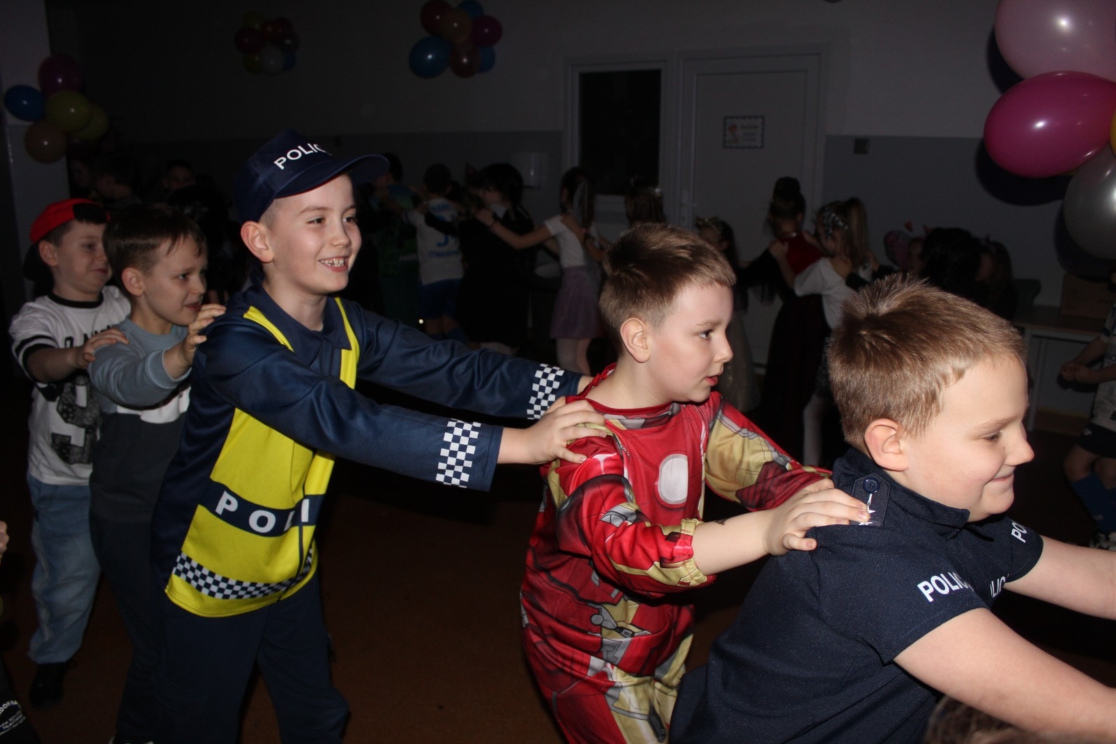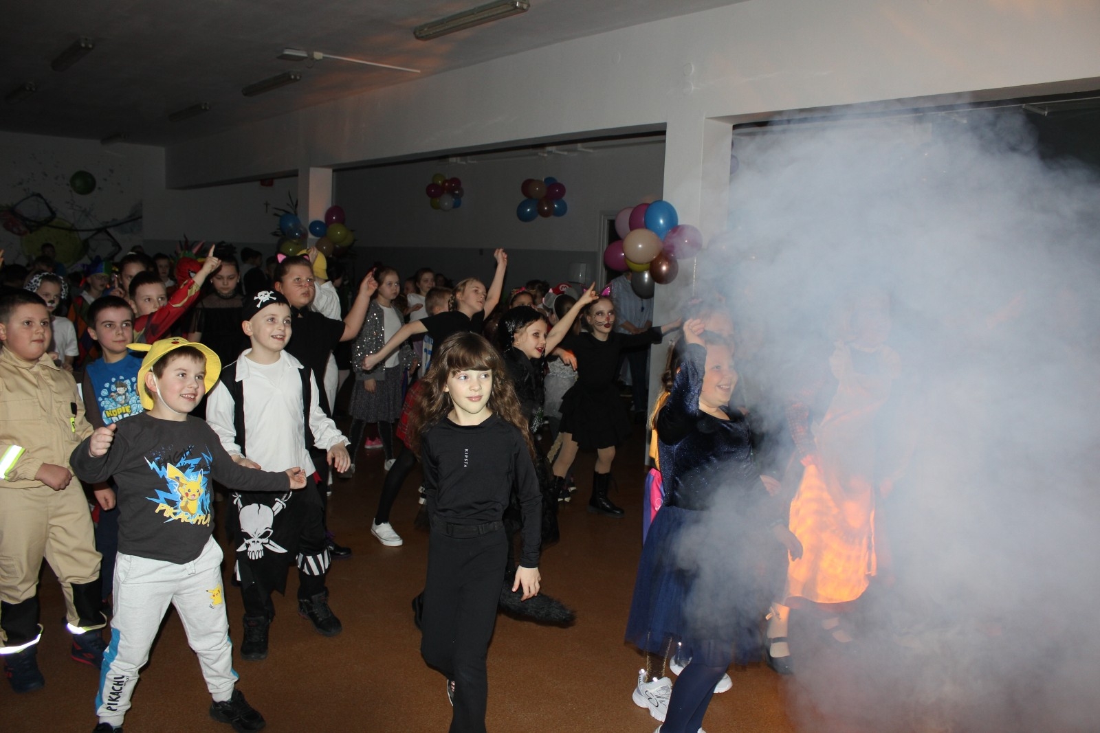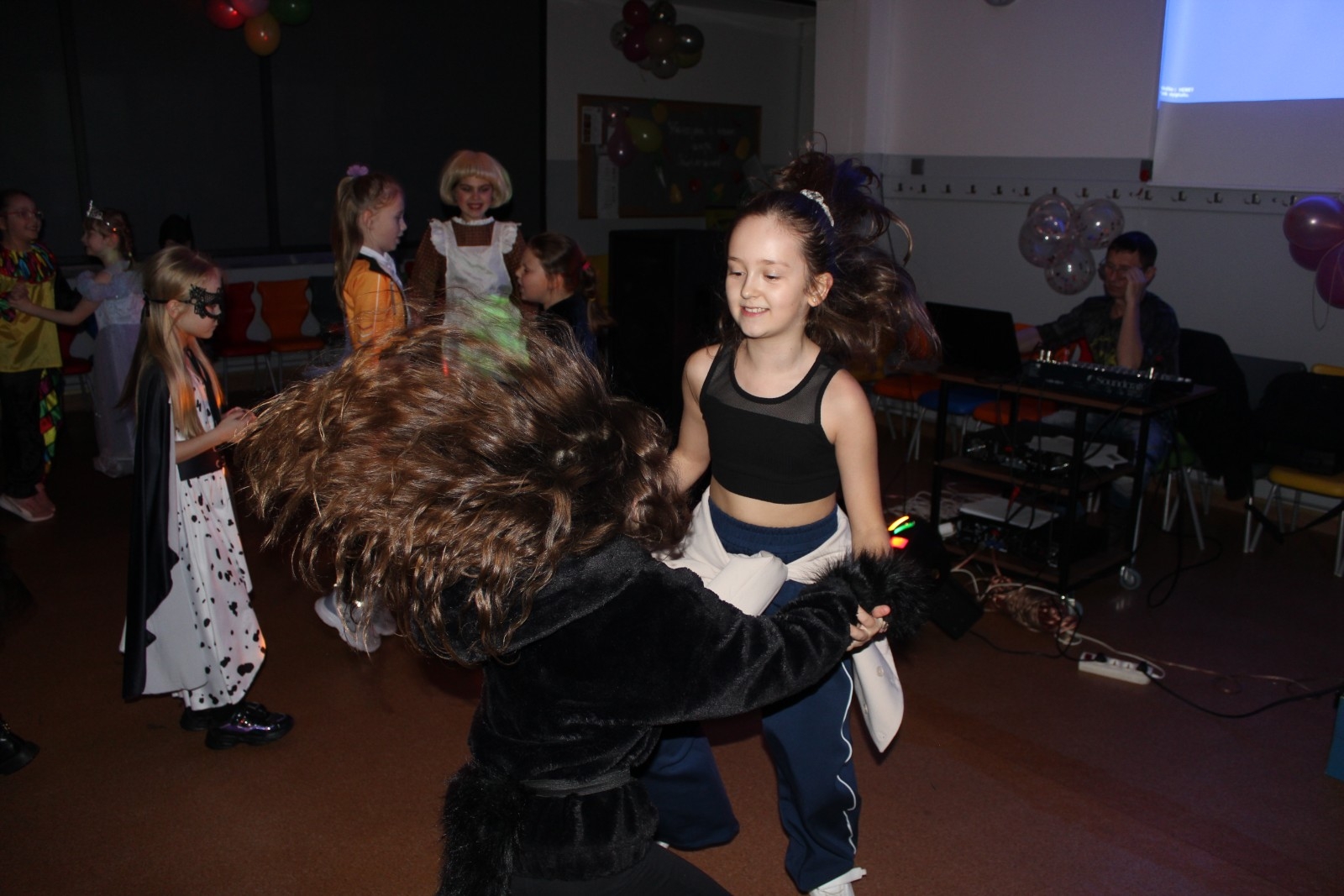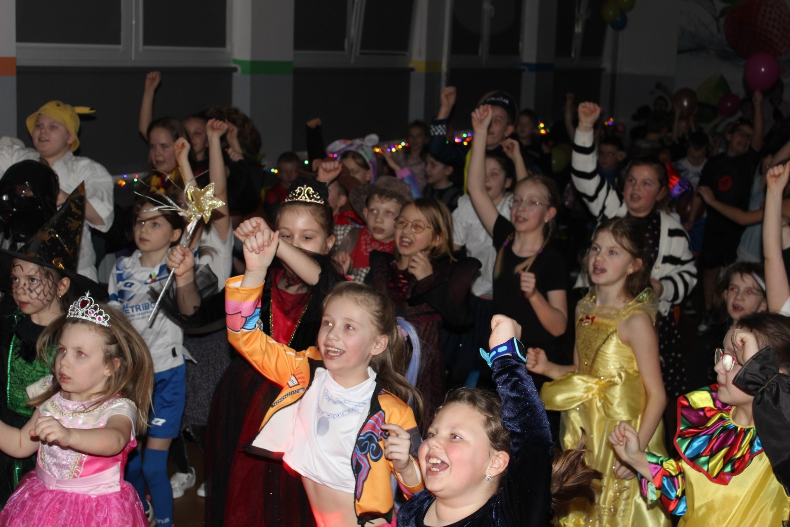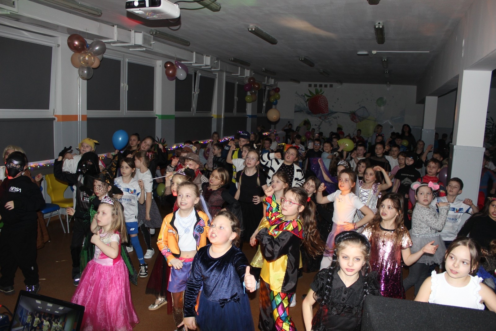 Szkolna stołówka zamieniła się w salę do tańca, przystrojoną kolorowymi balonami. Dzieci przybyły tłumnie, przebrane w różnorodne stroje. Było dużo śmiechu, tańców, a także balonowe tango czy taneczny wąż.
