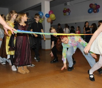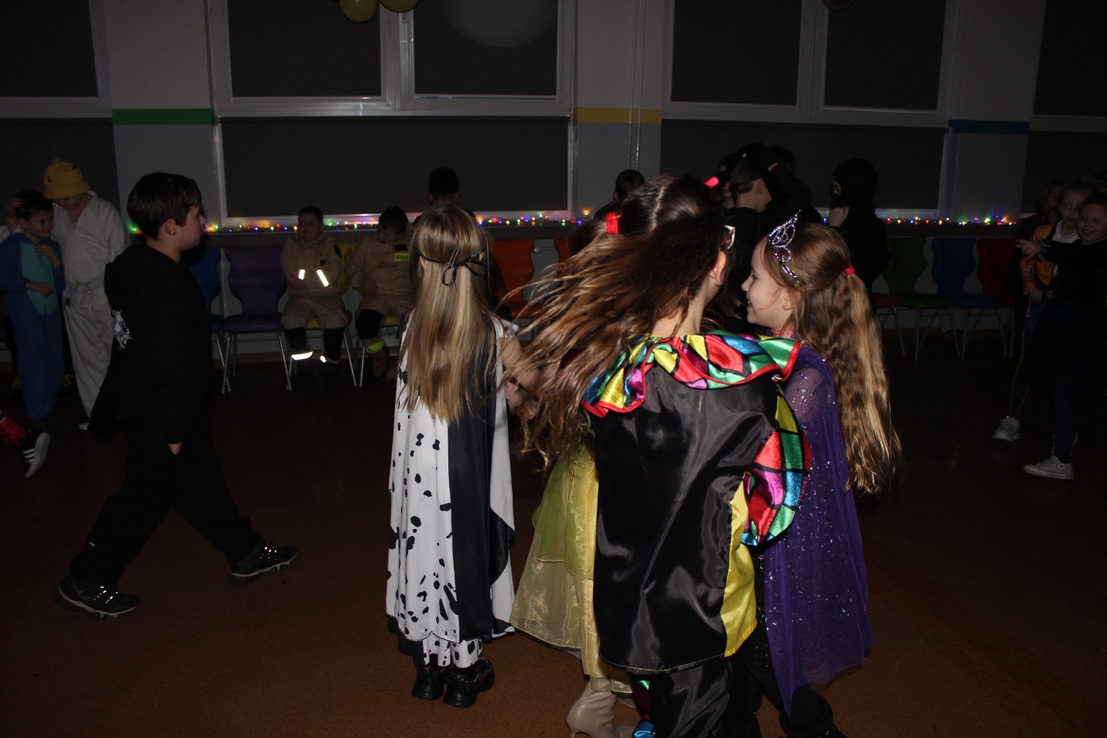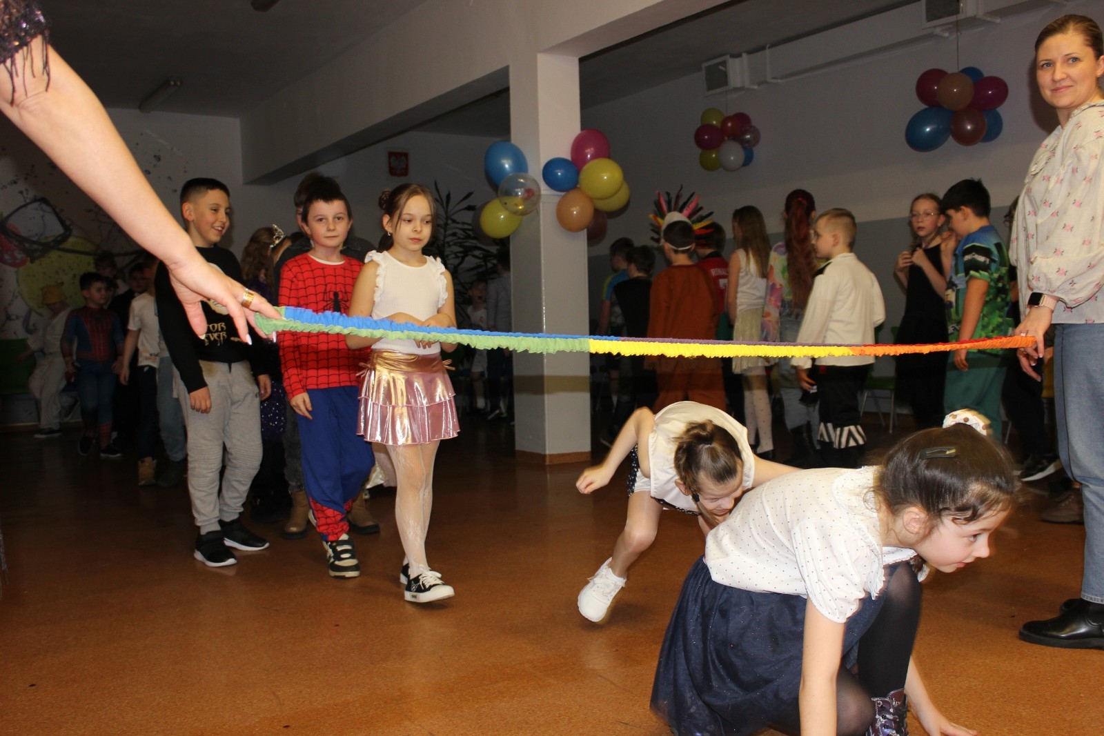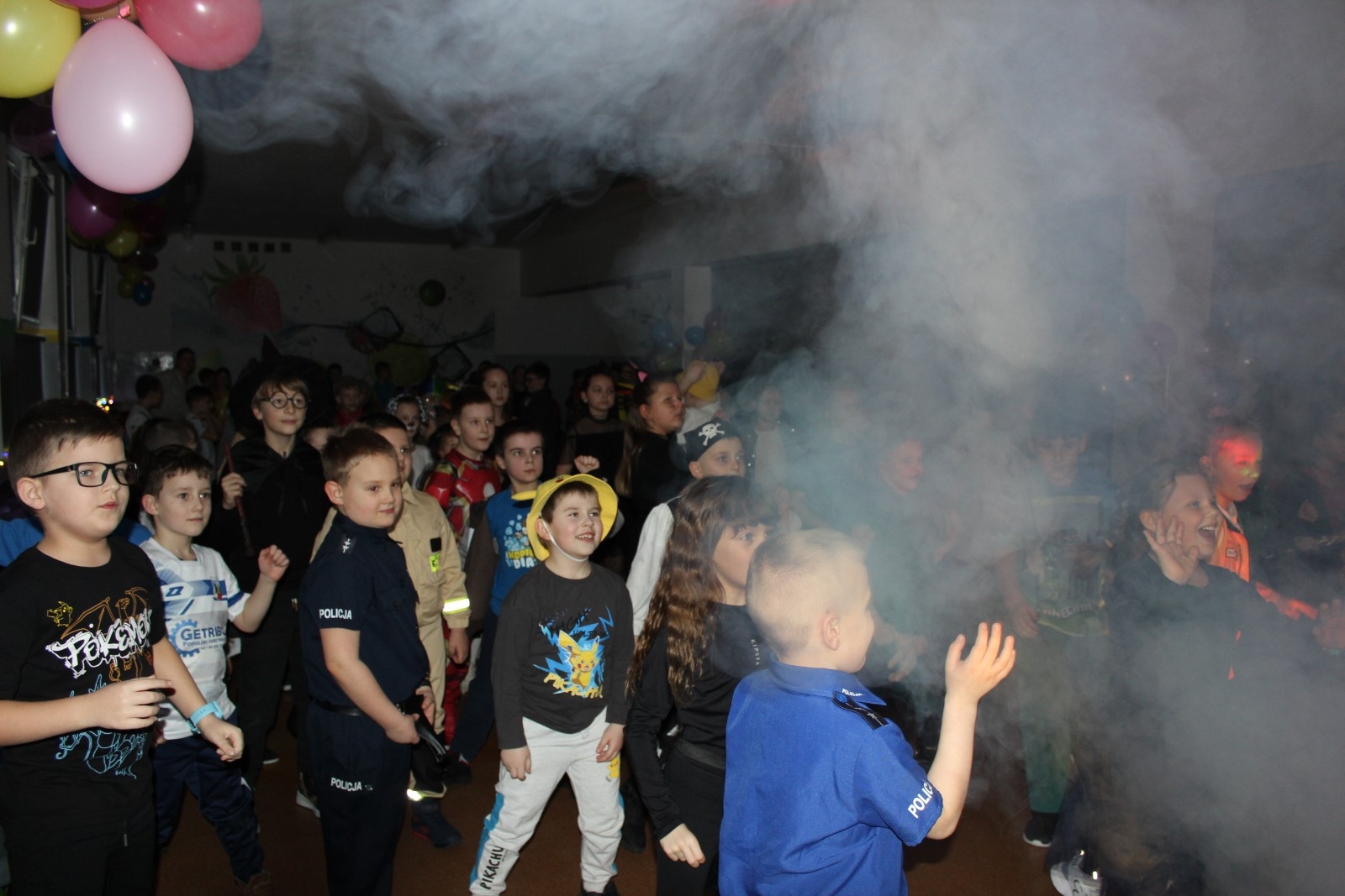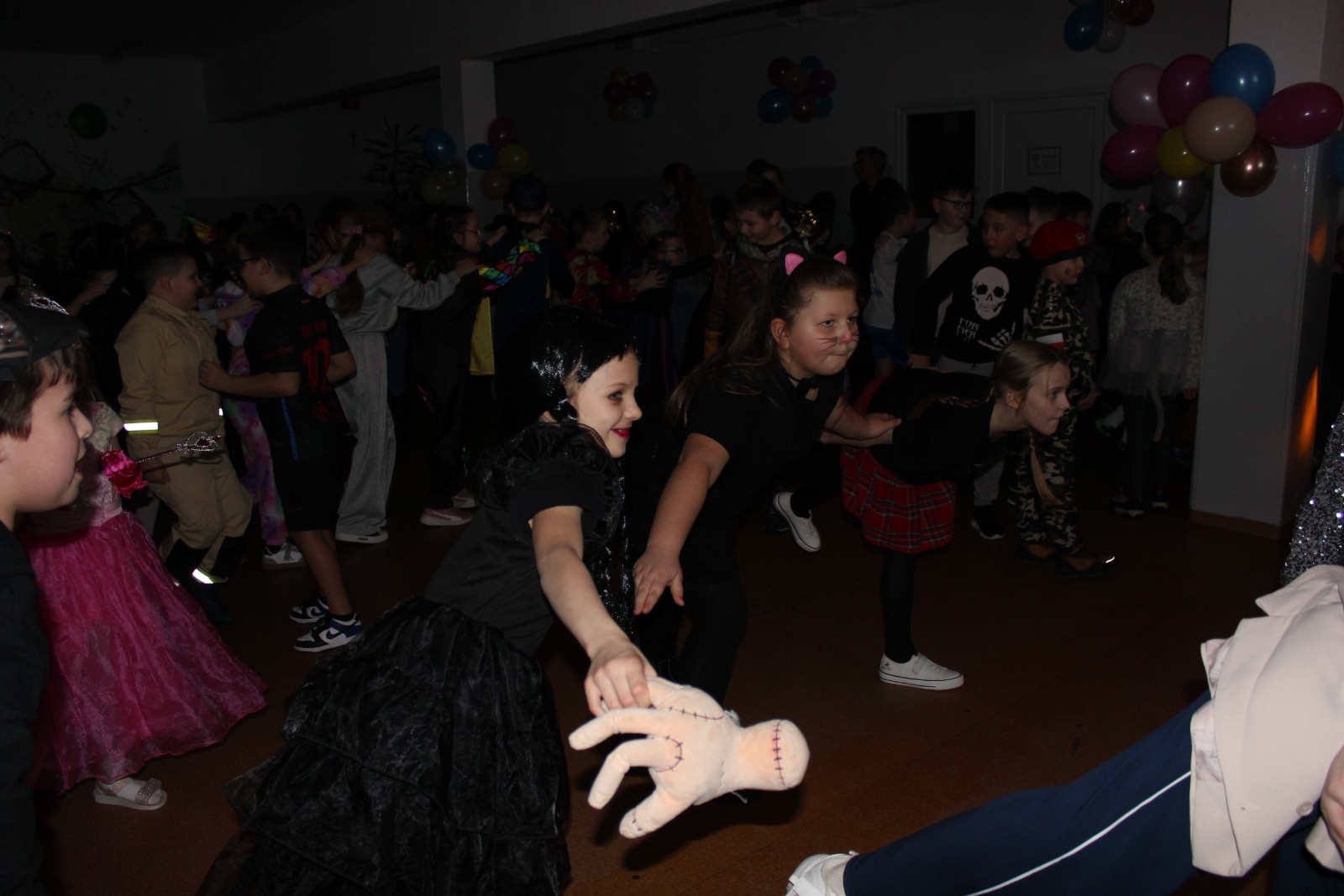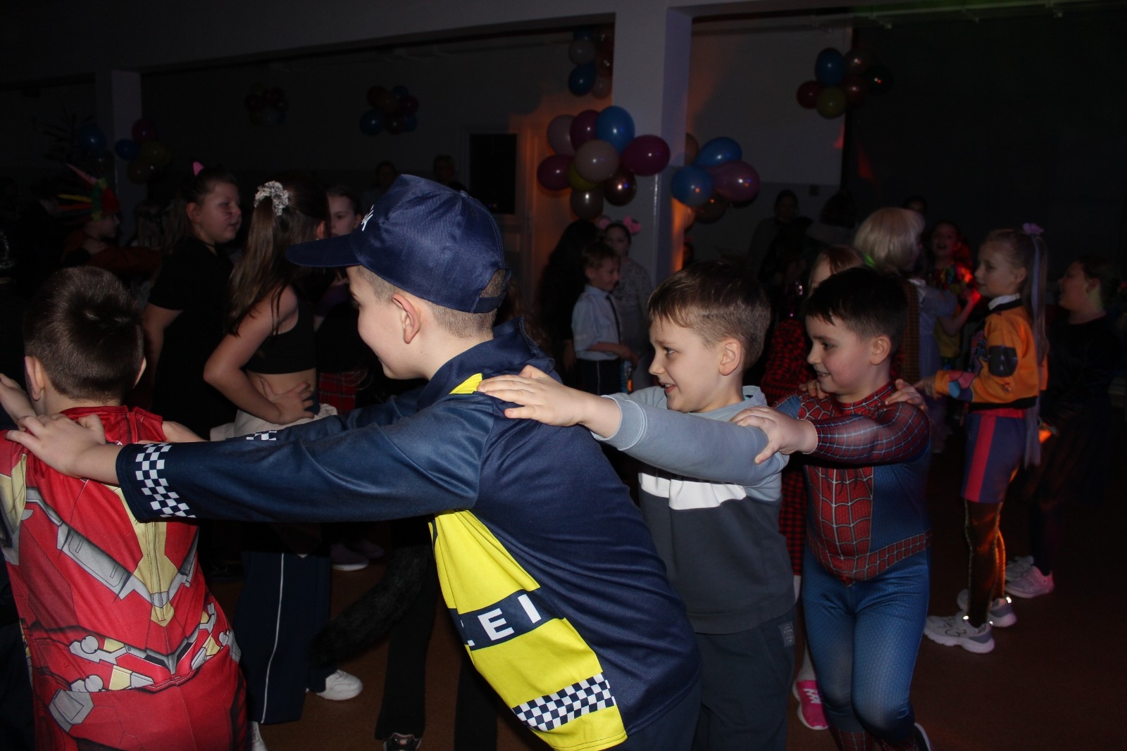 Szkolna stołówka zamieniła się w salę do tańca, przystrojoną kolorowymi balonami. Dzieci przybyły tłumnie, przebrane w różnorodne stroje. Było dużo śmiechu, tańców, a także balonowe tango czy taneczny wąż.
