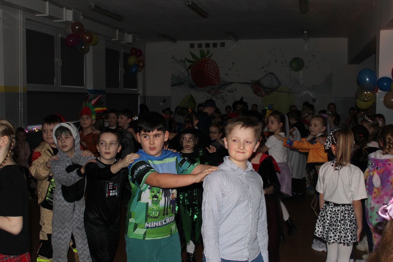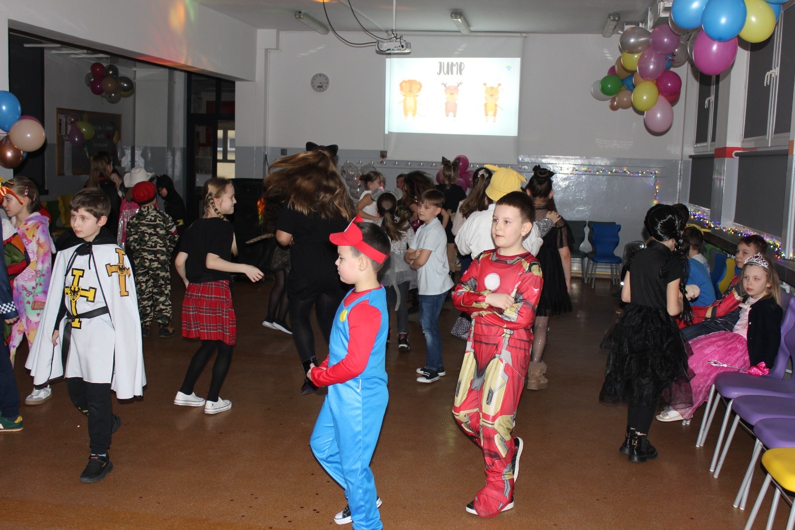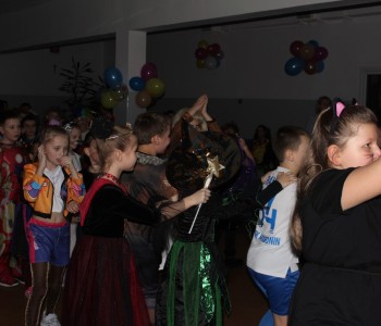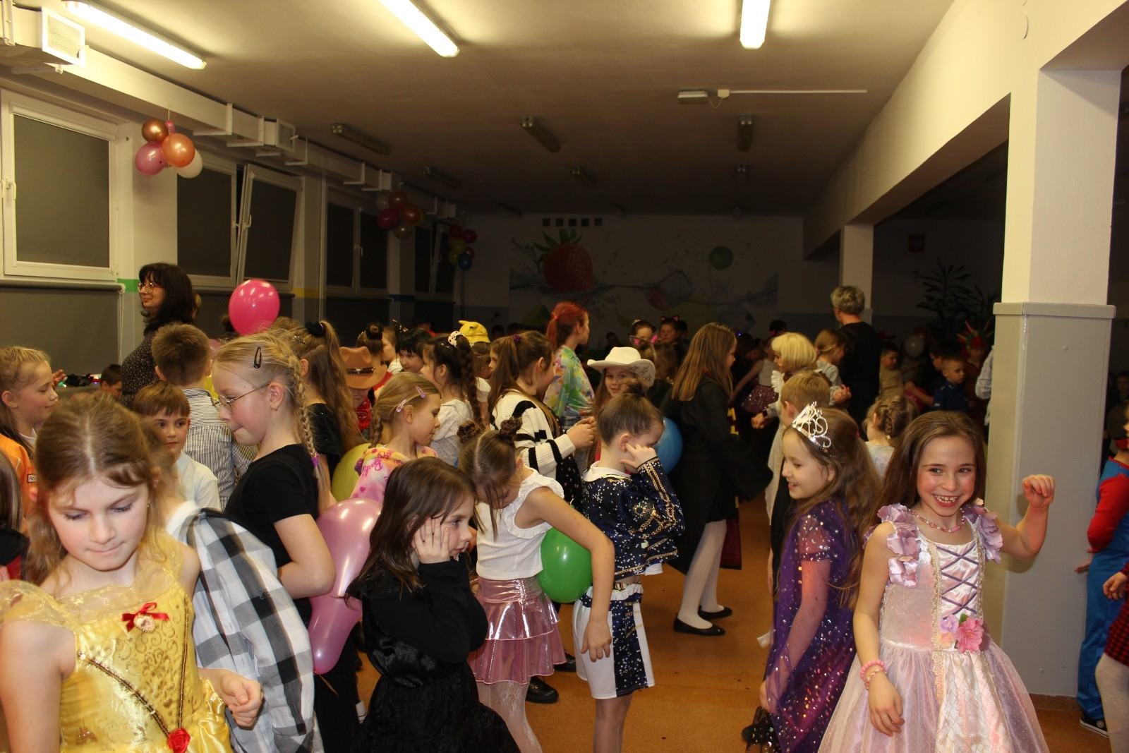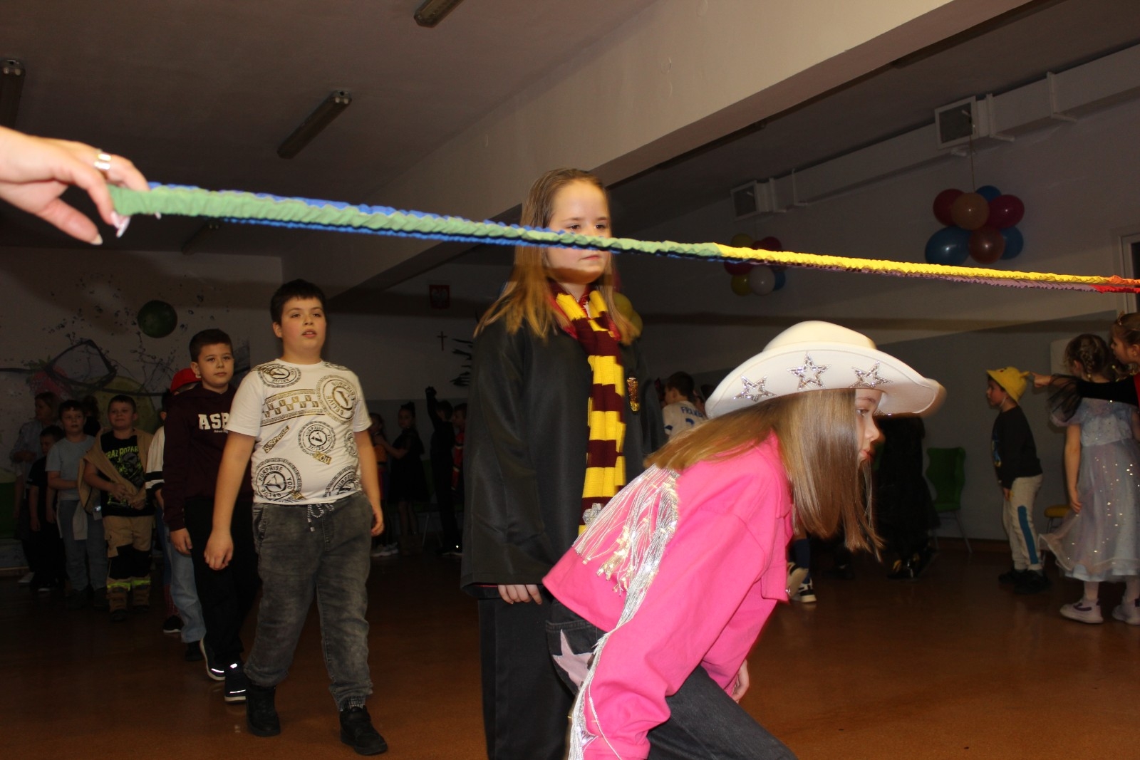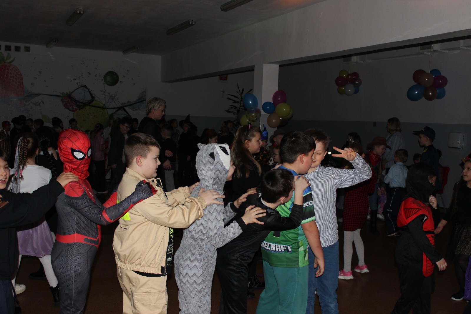 Szkolna stołówka zamieniła się w salę do tańca, przystrojoną kolorowymi balonami. Dzieci przybyły tłumnie, przebrane w różnorodne stroje. Było dużo śmiechu, tańców, a także balonowe tango czy taneczny wąż.