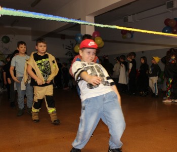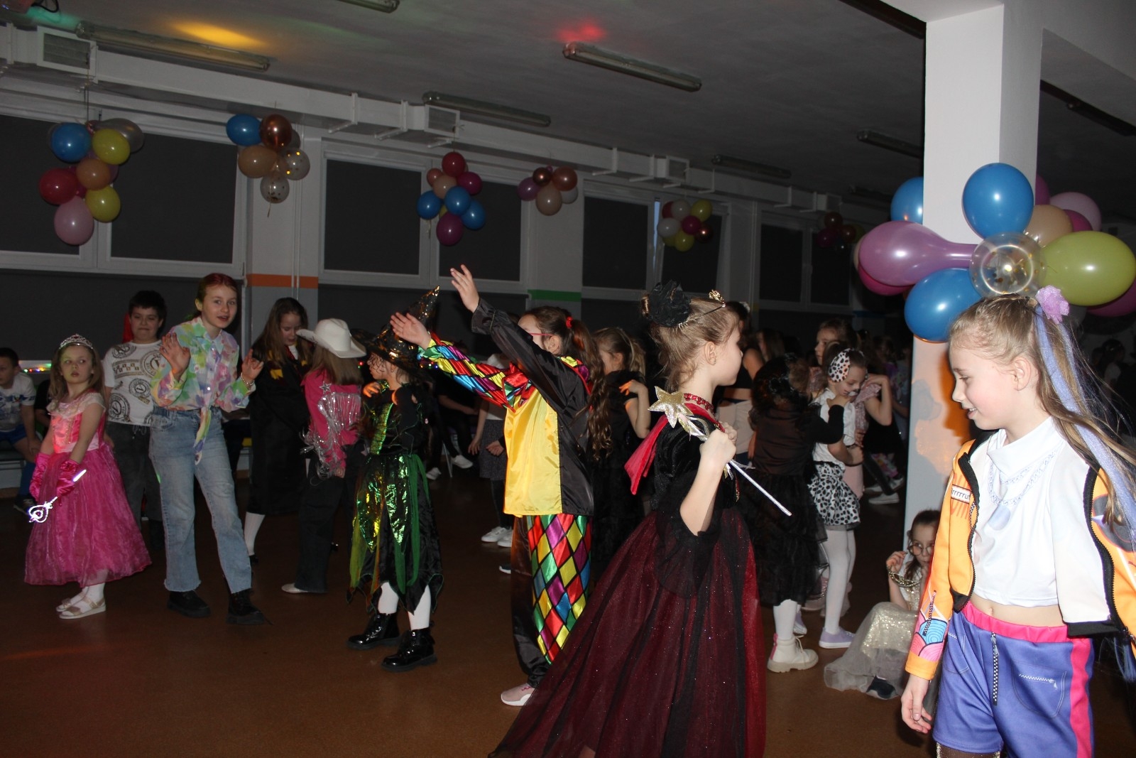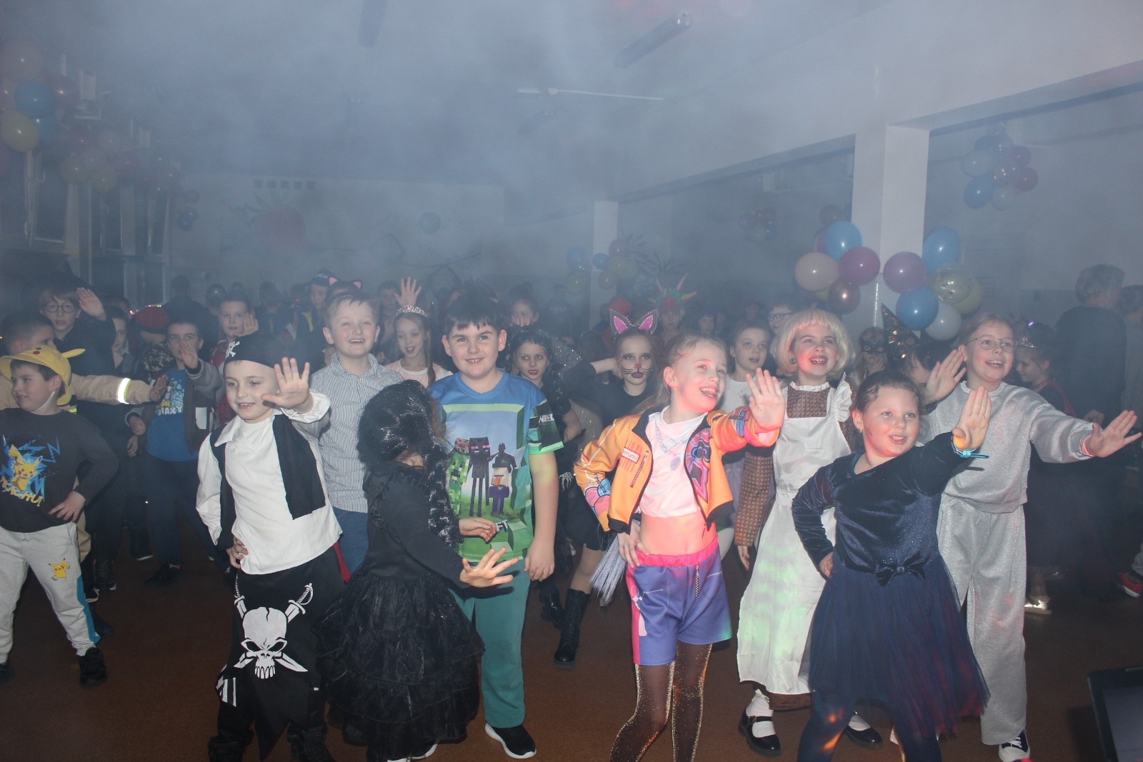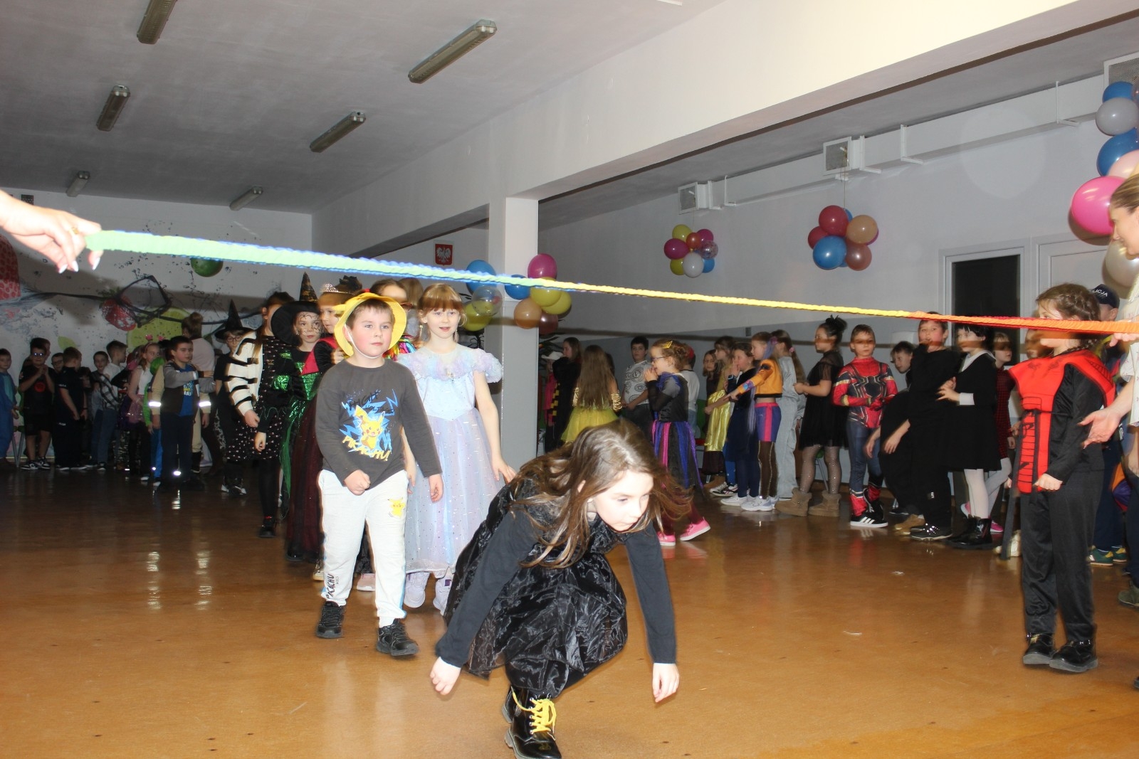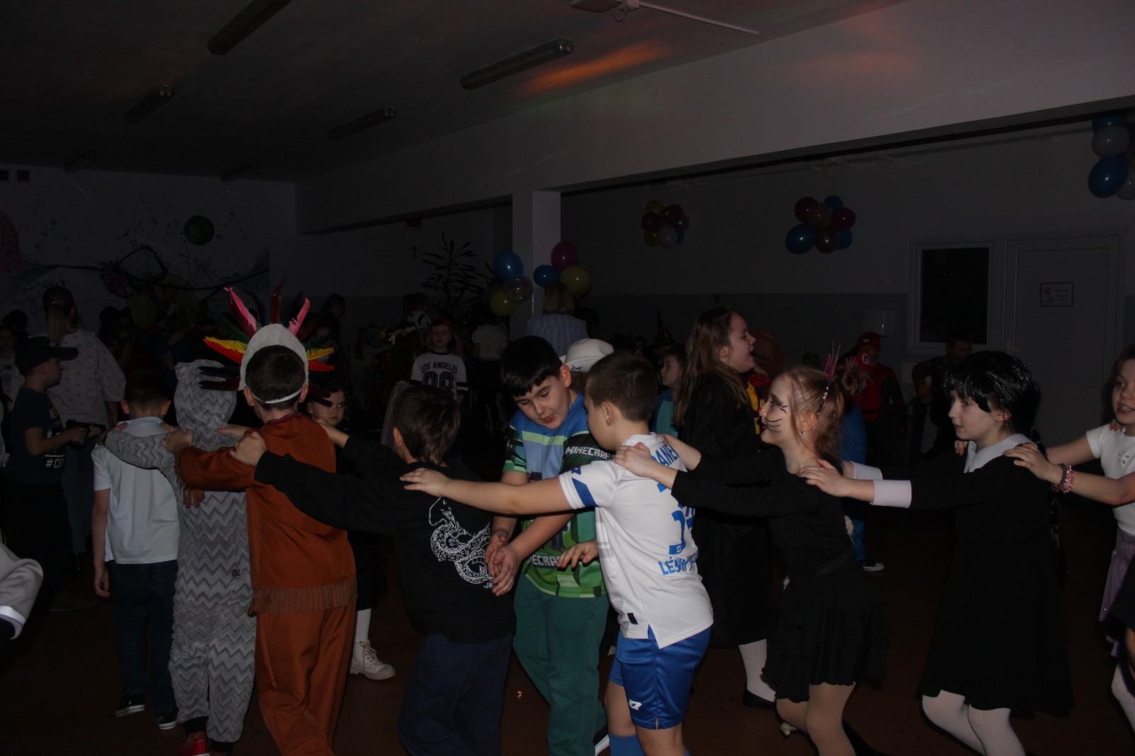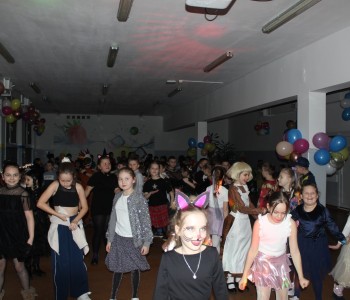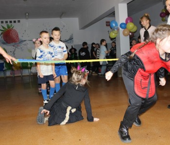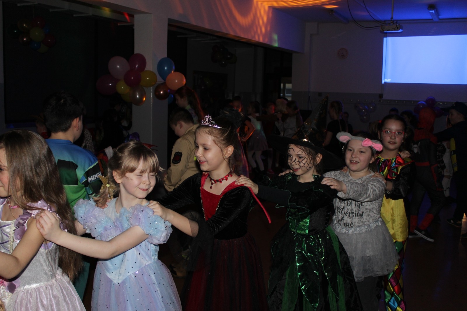 Szkolna stołówka zamieniła się w salę do tańca, przystrojoną kolorowymi balonami. Dzieci przybyły tłumnie, przebrane w różnorodne stroje. Było dużo śmiechu, tańców, a także balonowe tango czy taneczny wąż.