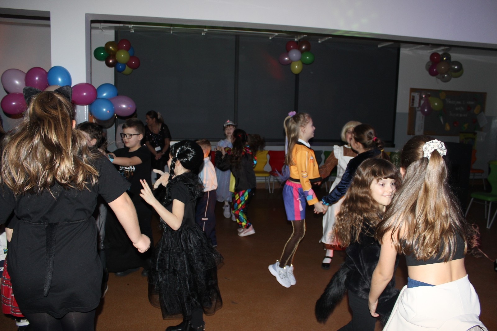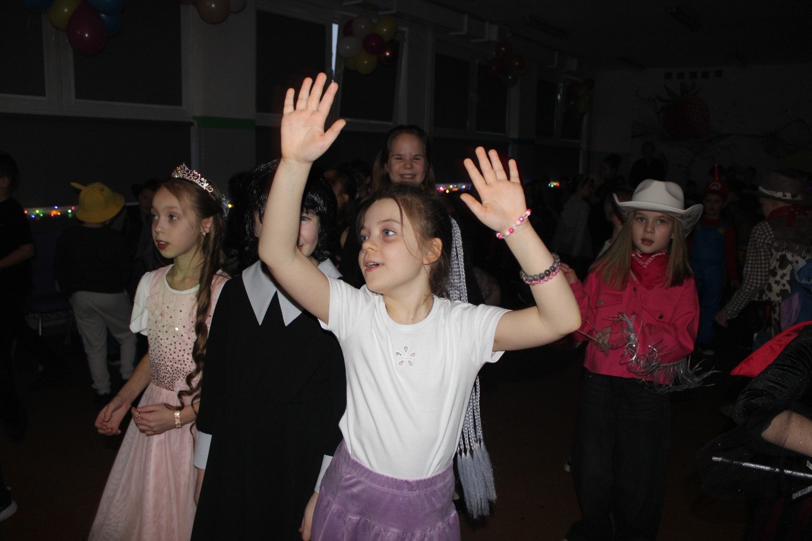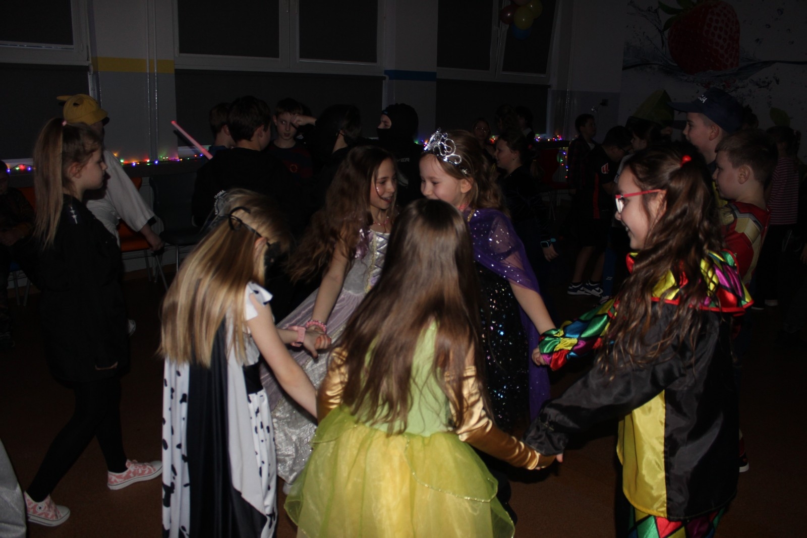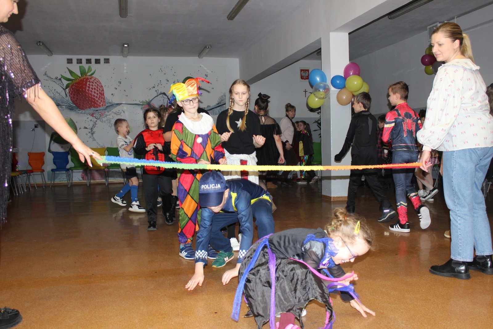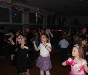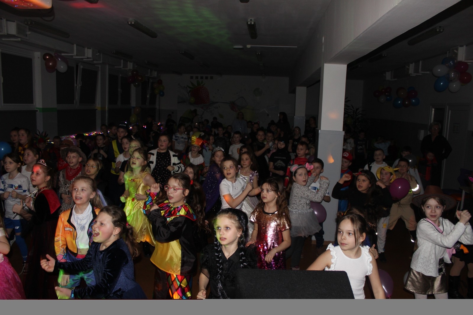 Szkolna stołówka zamieniła się w salę do tańca, przystrojoną kolorowymi balonami. Dzieci przybyły tłumnie, przebrane w różnorodne stroje. Było dużo śmiechu, tańców, a także balonowe tango czy taneczny wąż.