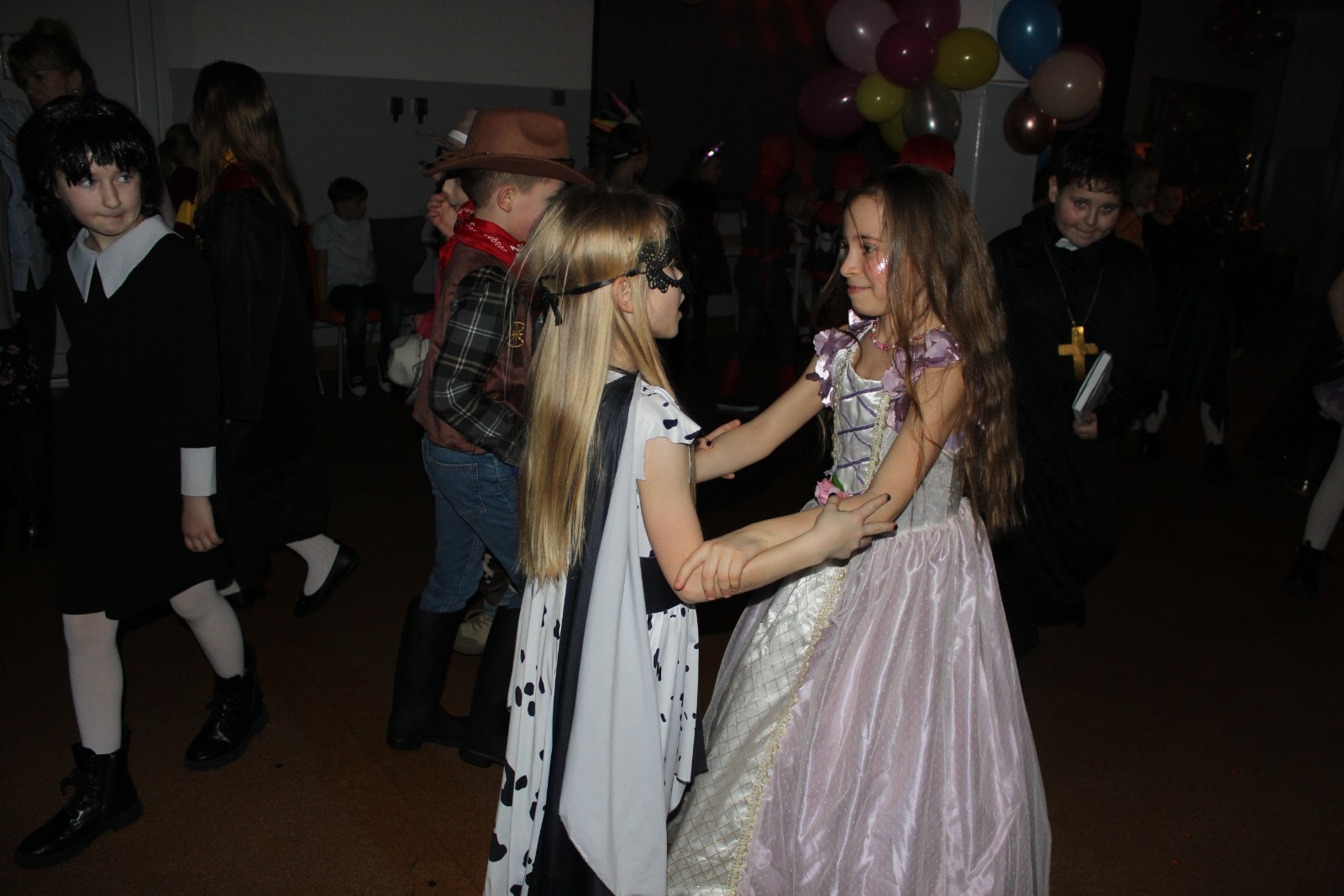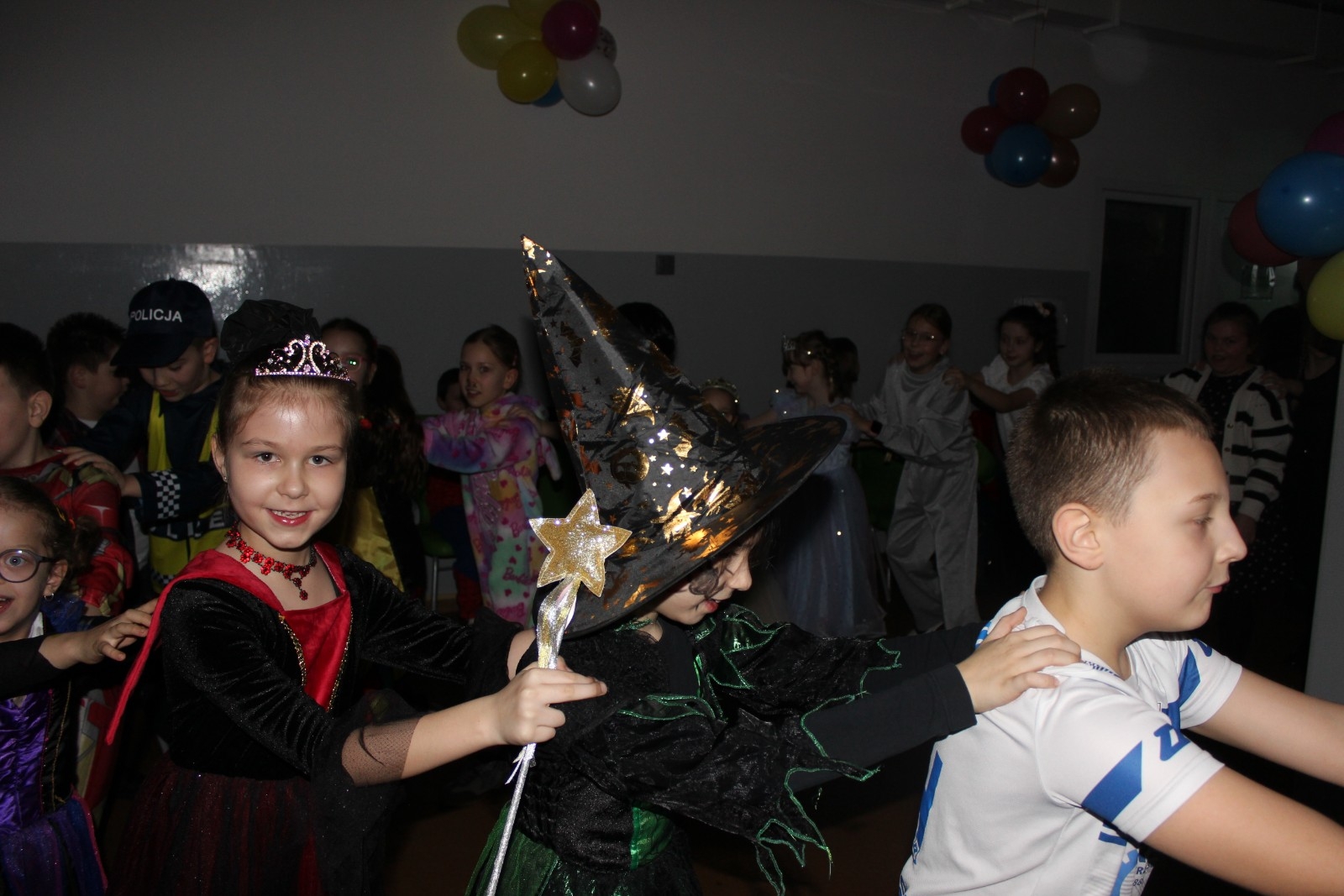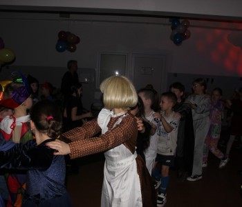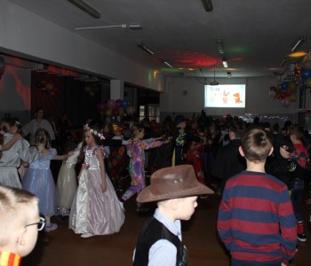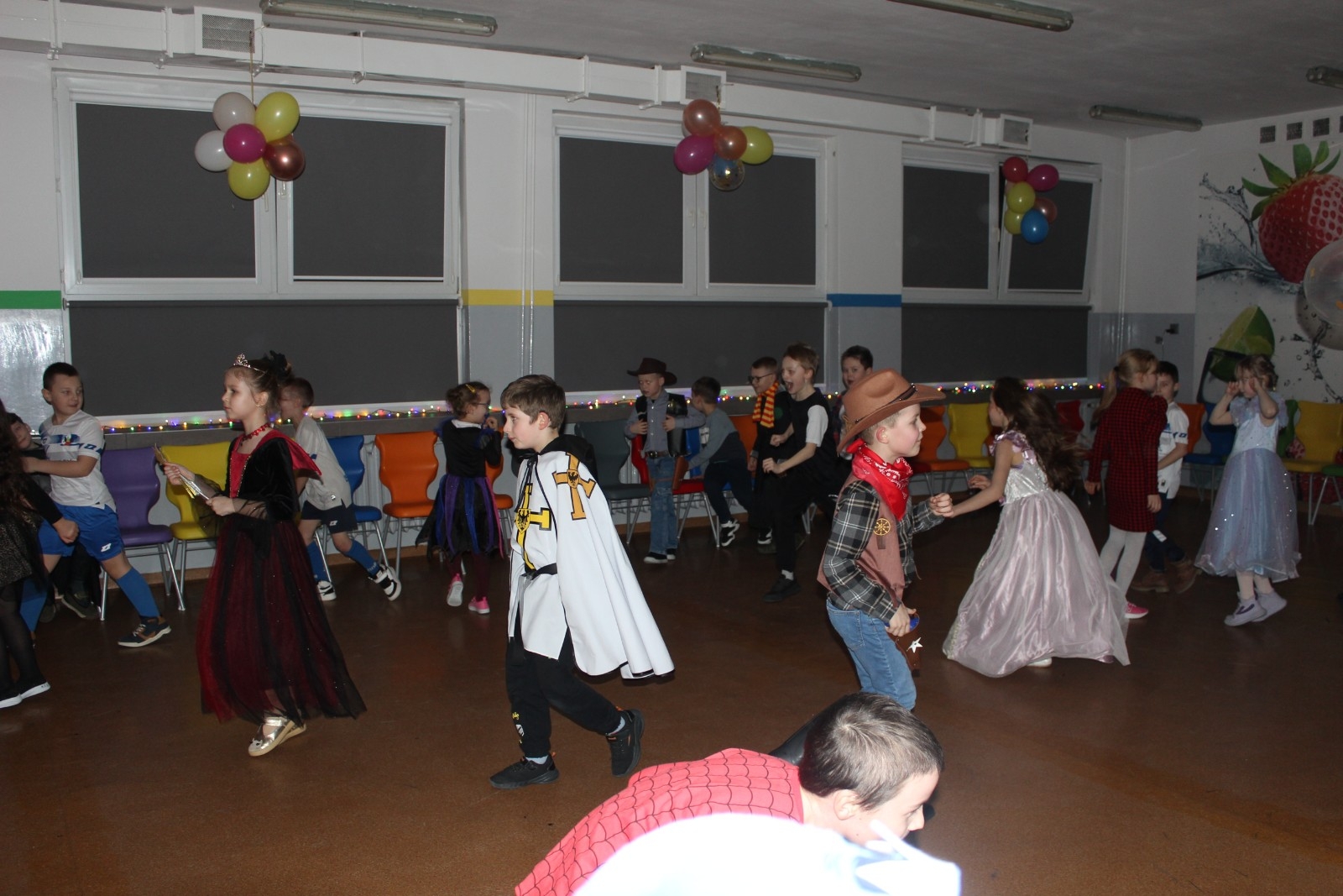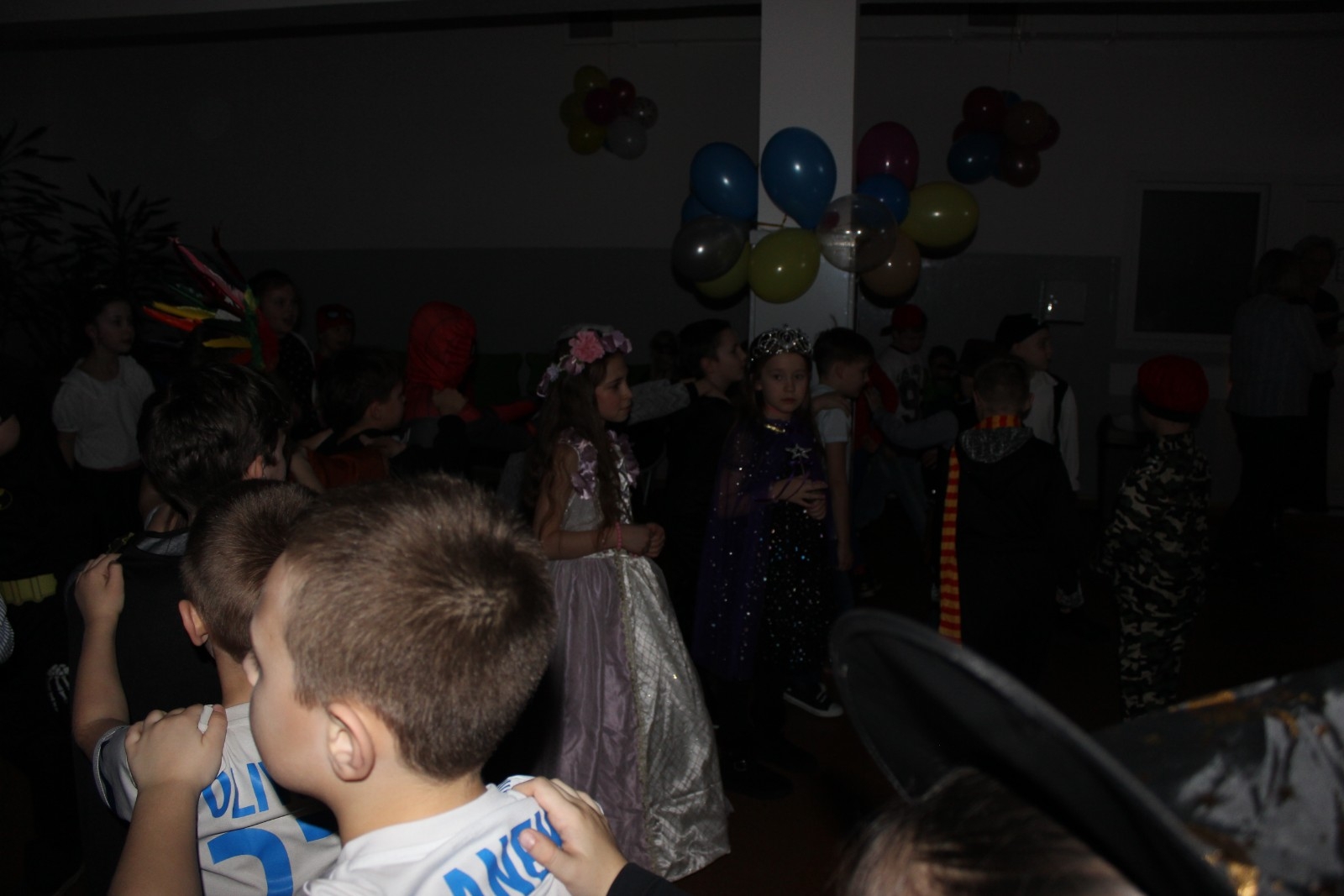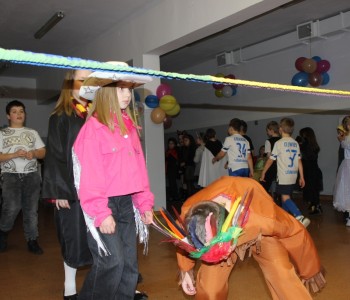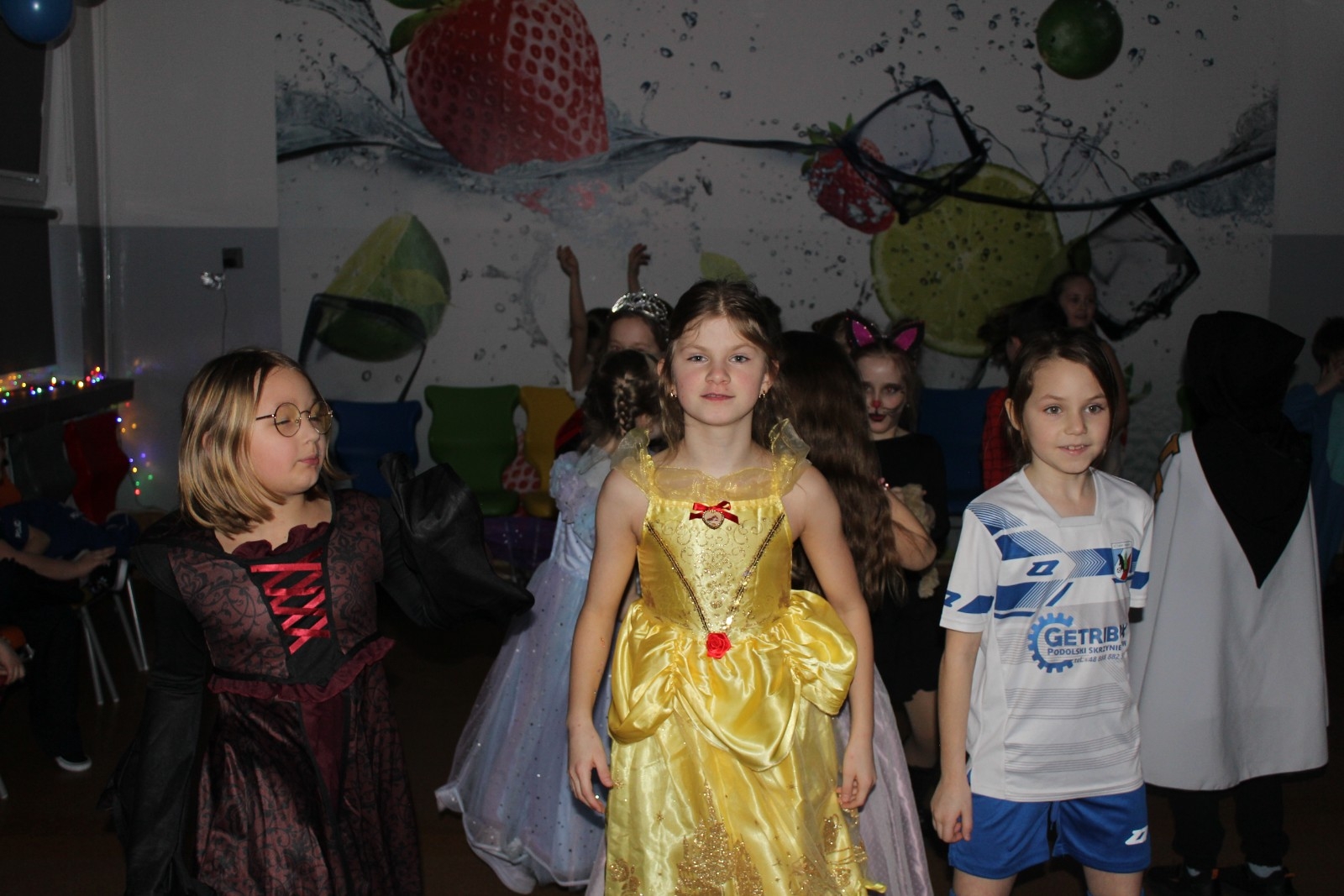 Szkolna stołówka zamieniła się w salę do tańca, przystrojoną kolorowymi balonami. Dzieci przybyły tłumnie, przebrane w różnorodne stroje. Było dużo śmiechu, tańców, a także balonowe tango czy taneczny wąż.
