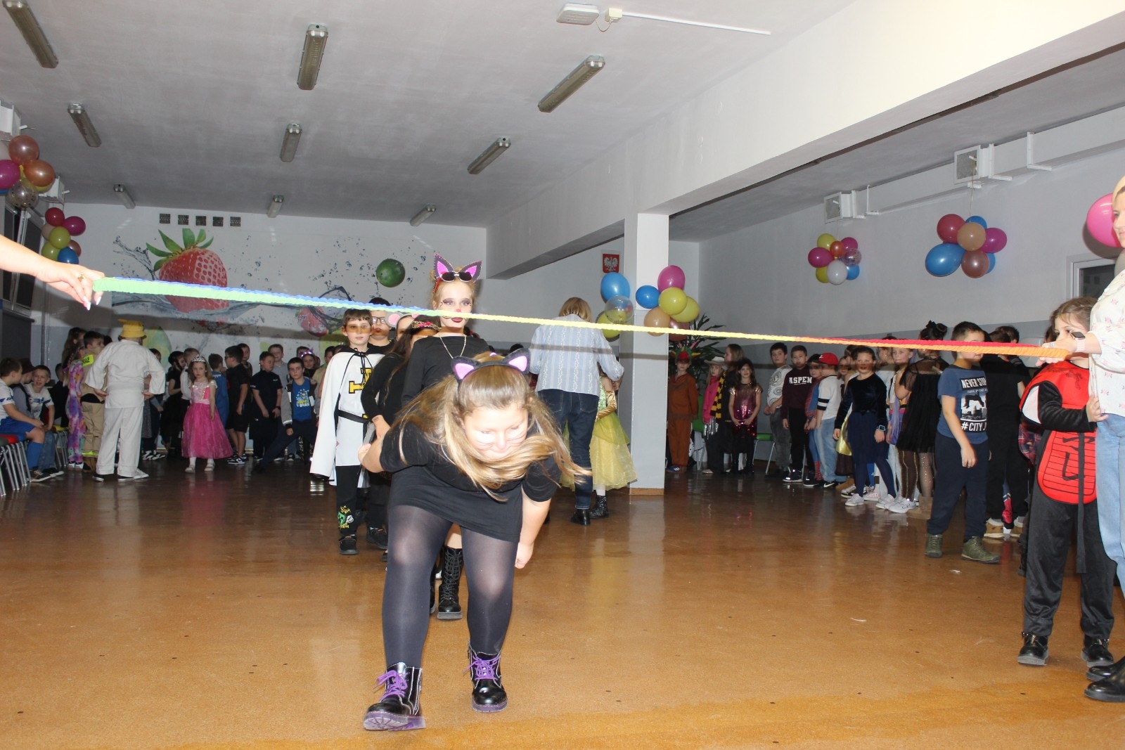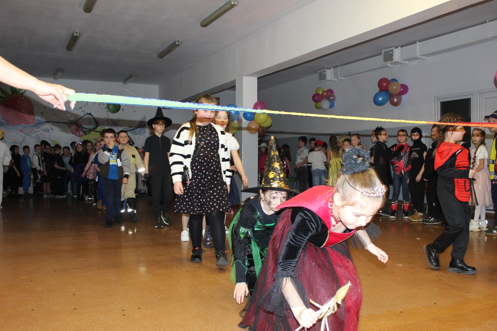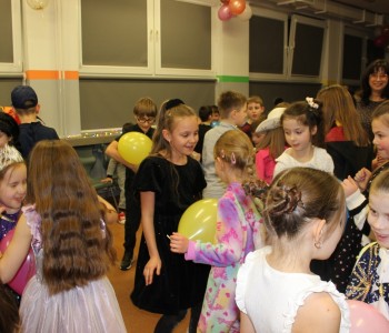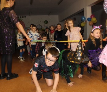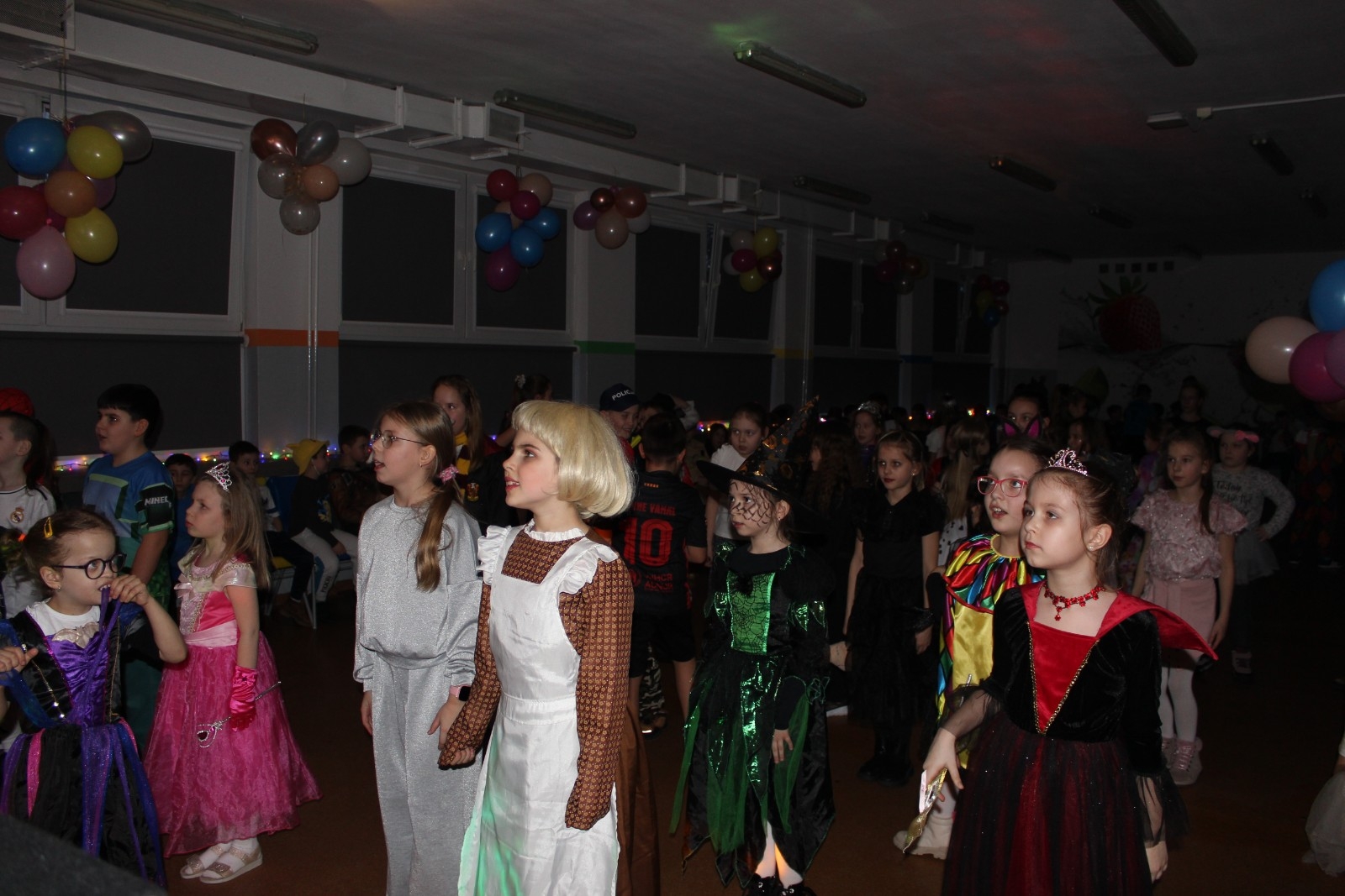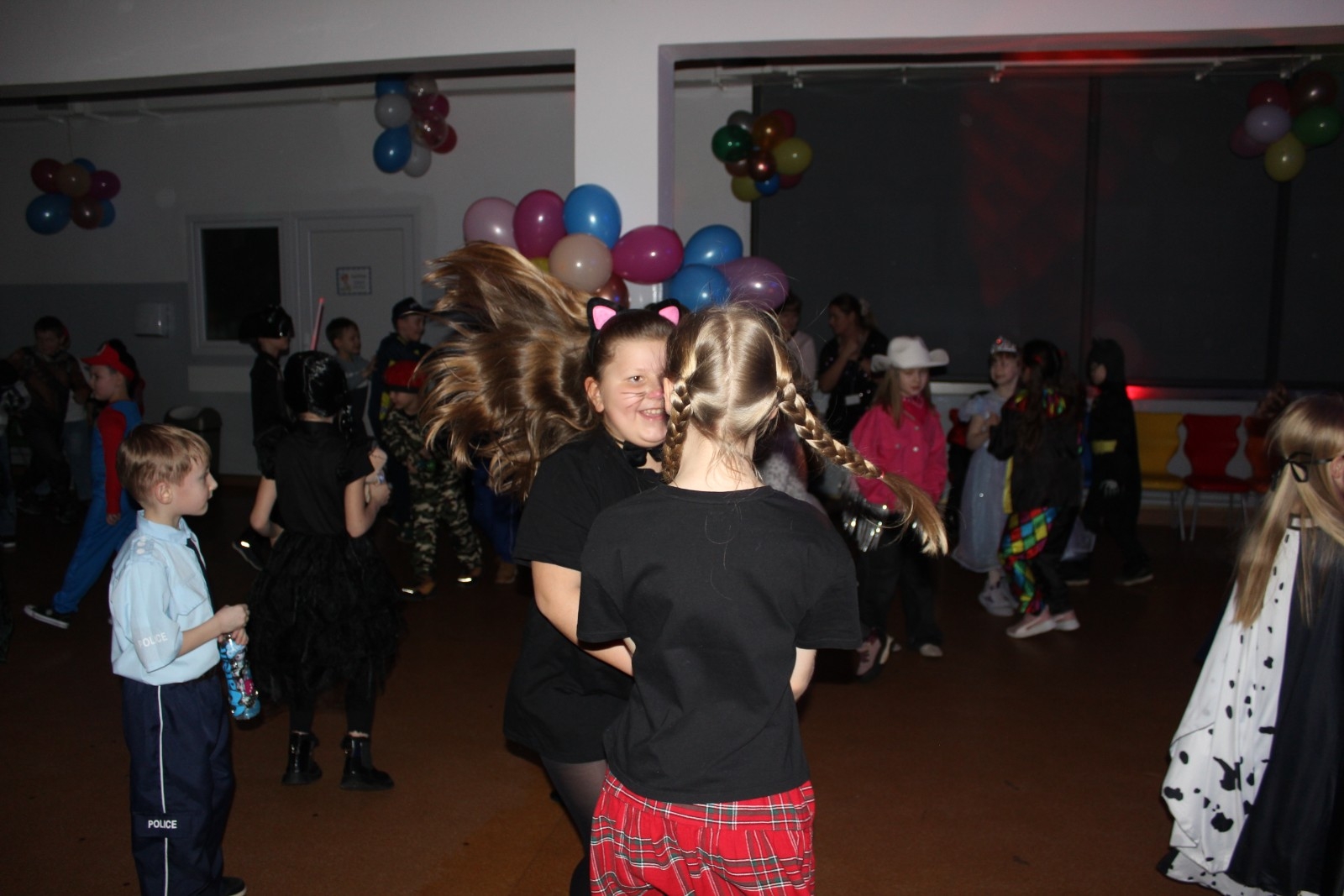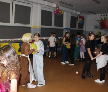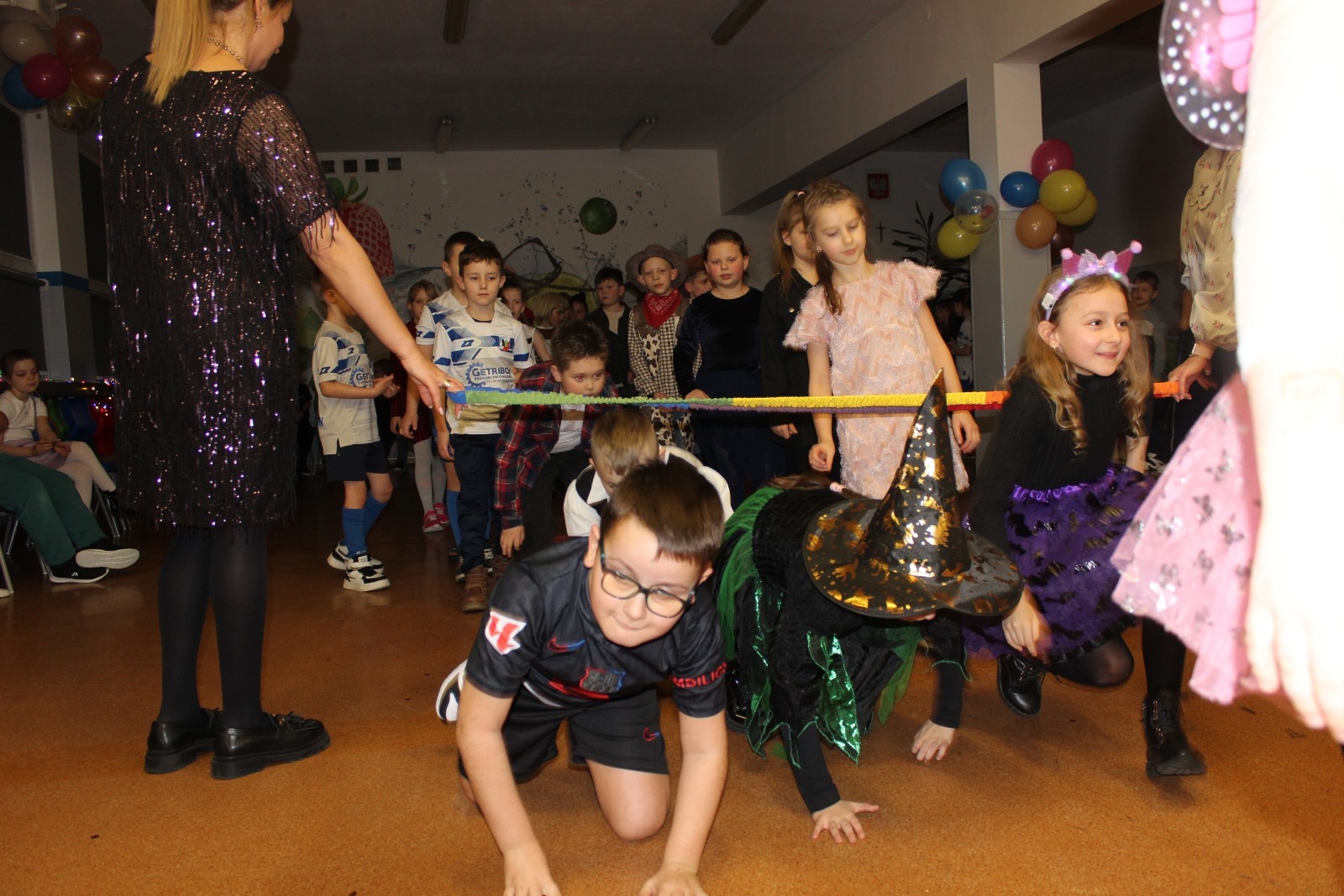 Szkolna stołówka zamieniła się w salę do tańca, przystrojoną kolorowymi balonami. Dzieci przybyły tłumnie, przebrane w różnorodne stroje. Było dużo śmiechu, tańców, a także balonowe tango czy taneczny wąż.