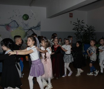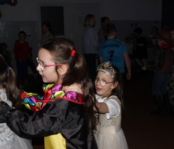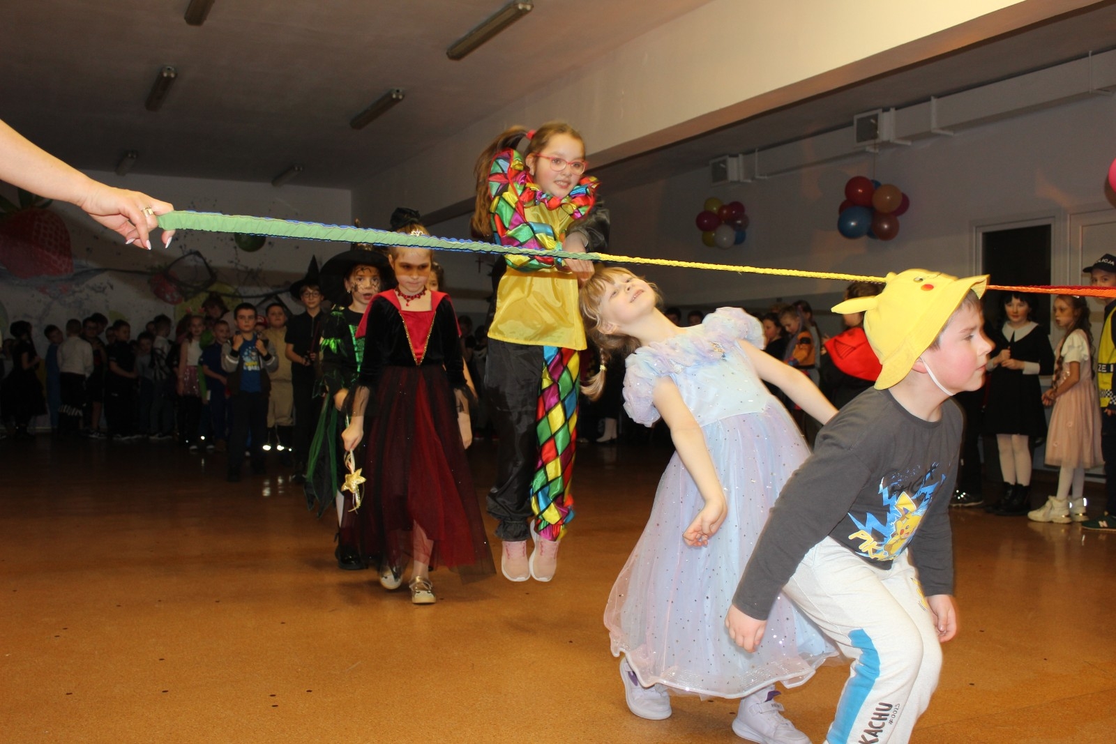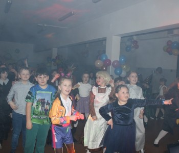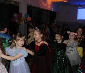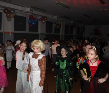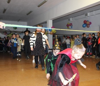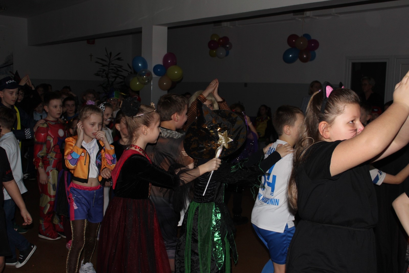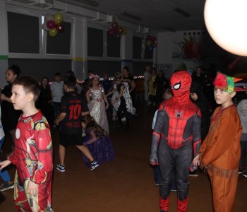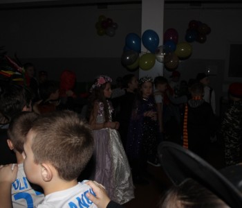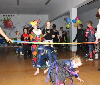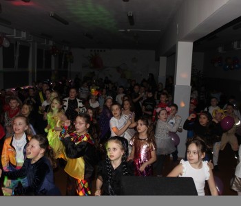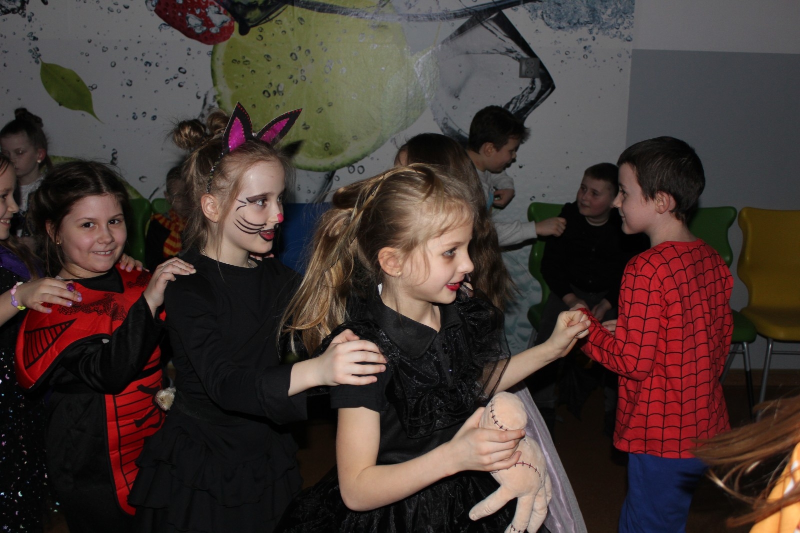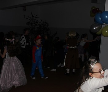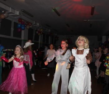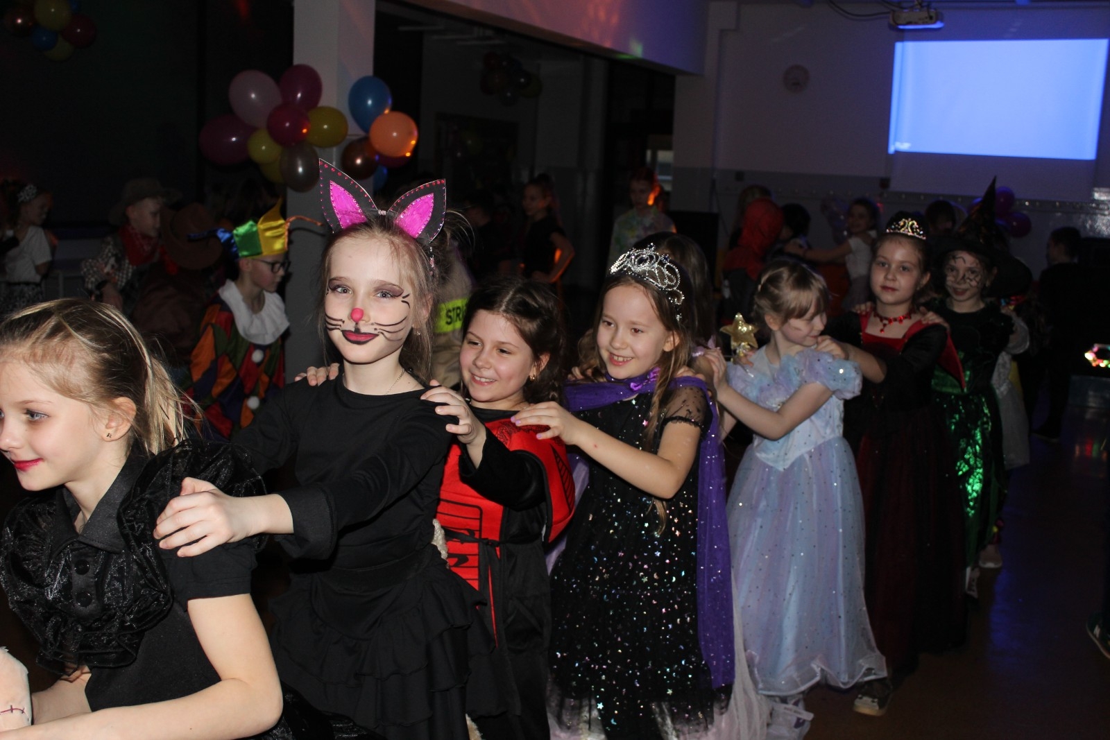 Szkolna stołówka zamieniła się w salę do tańca, przystrojoną kolorowymi balonami. Dzieci przybyły tłumnie, przebrane w różnorodne stroje. Było dużo śmiechu, tańców, a także balonowe tango czy taneczny wąż.