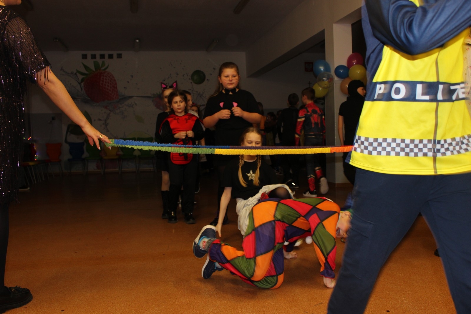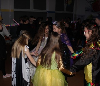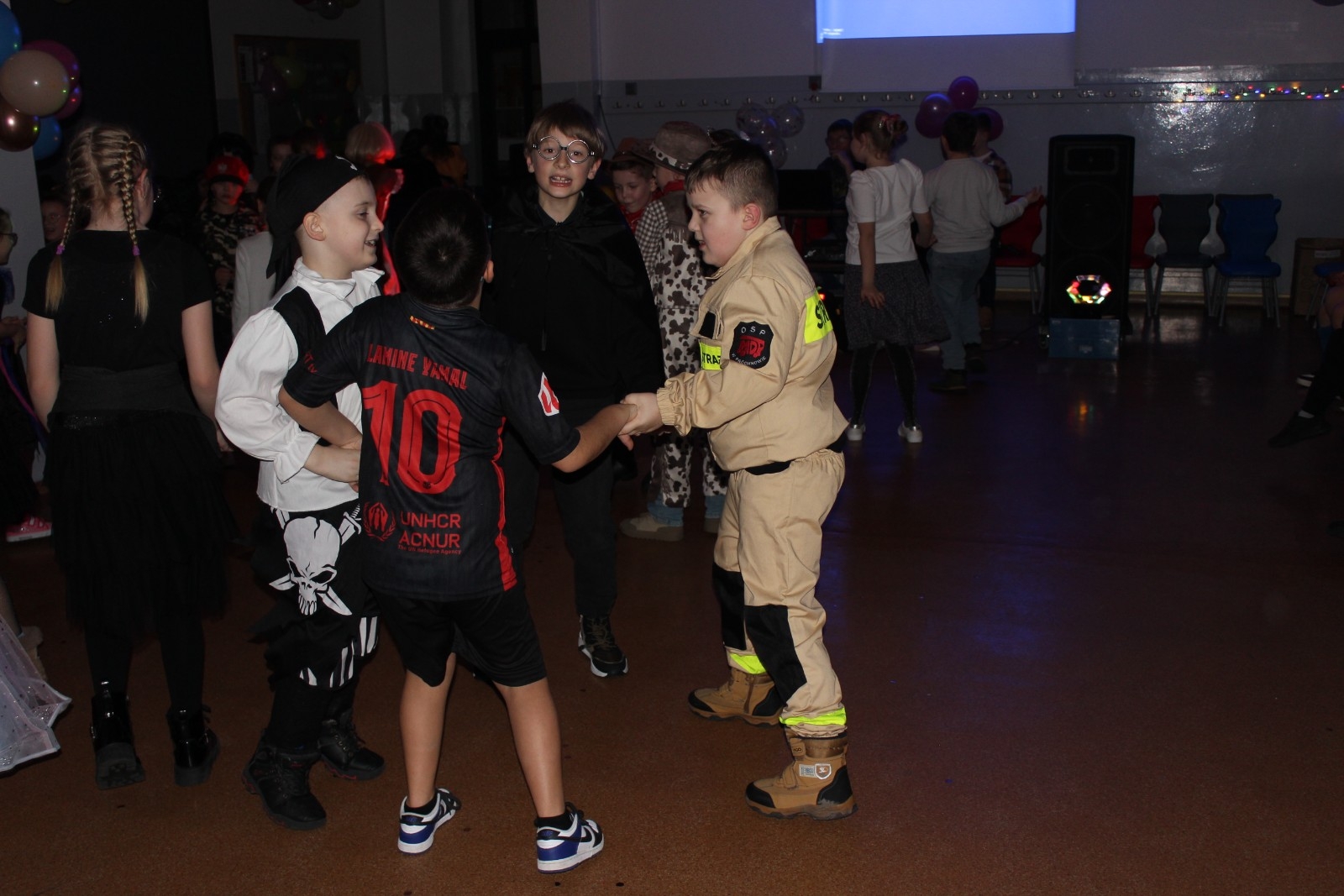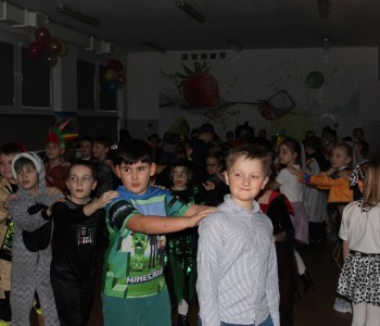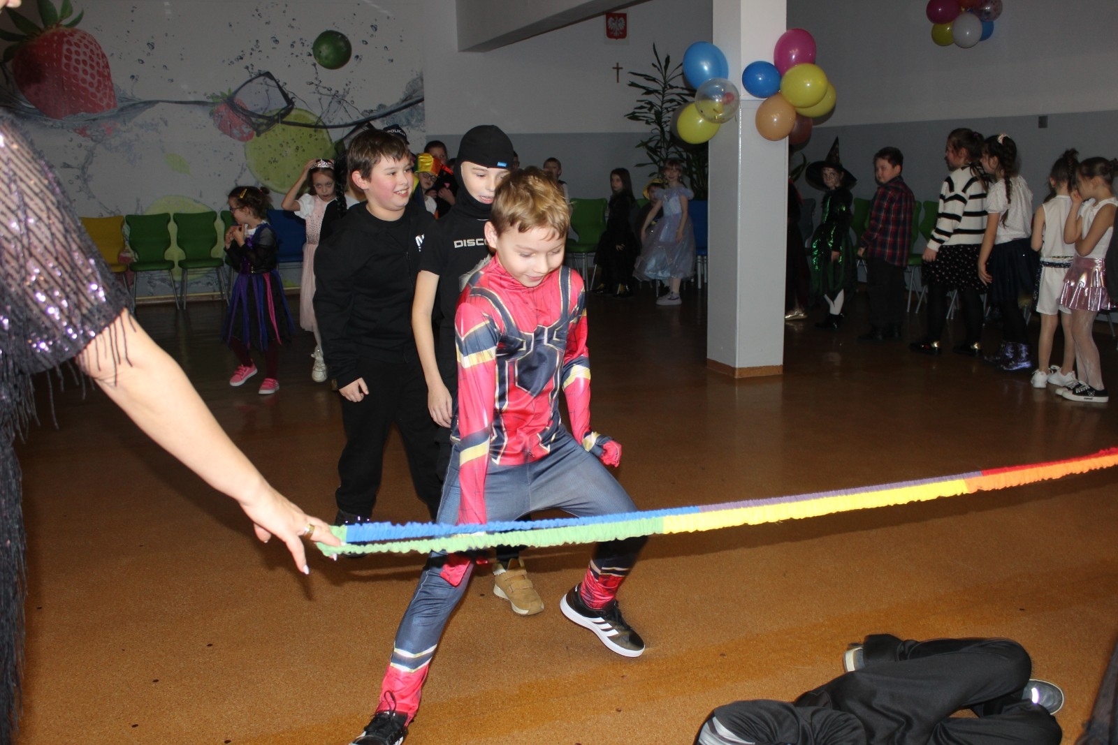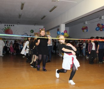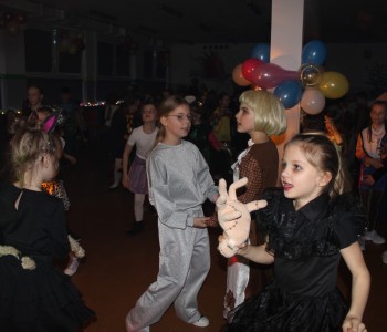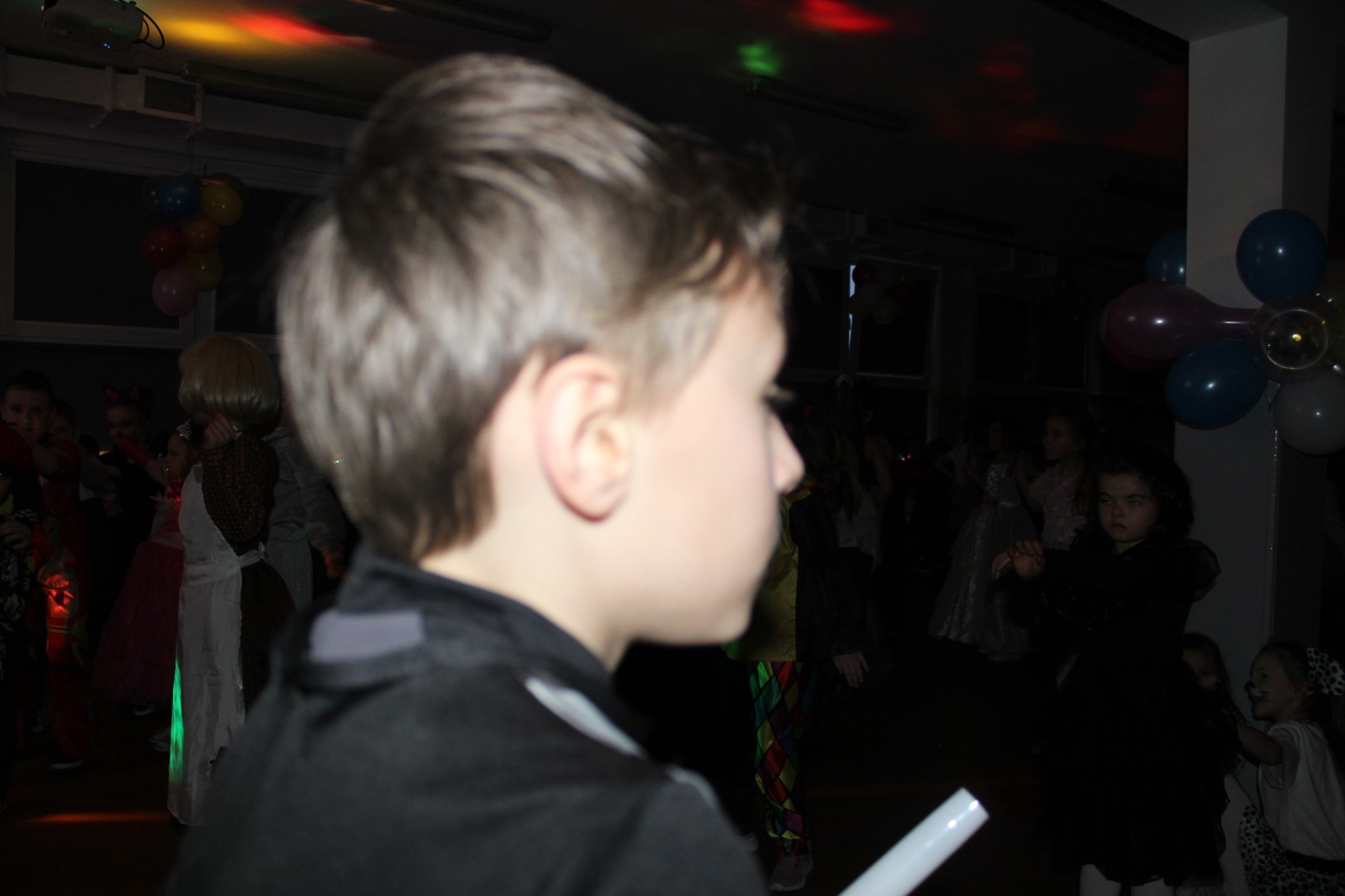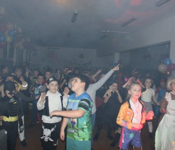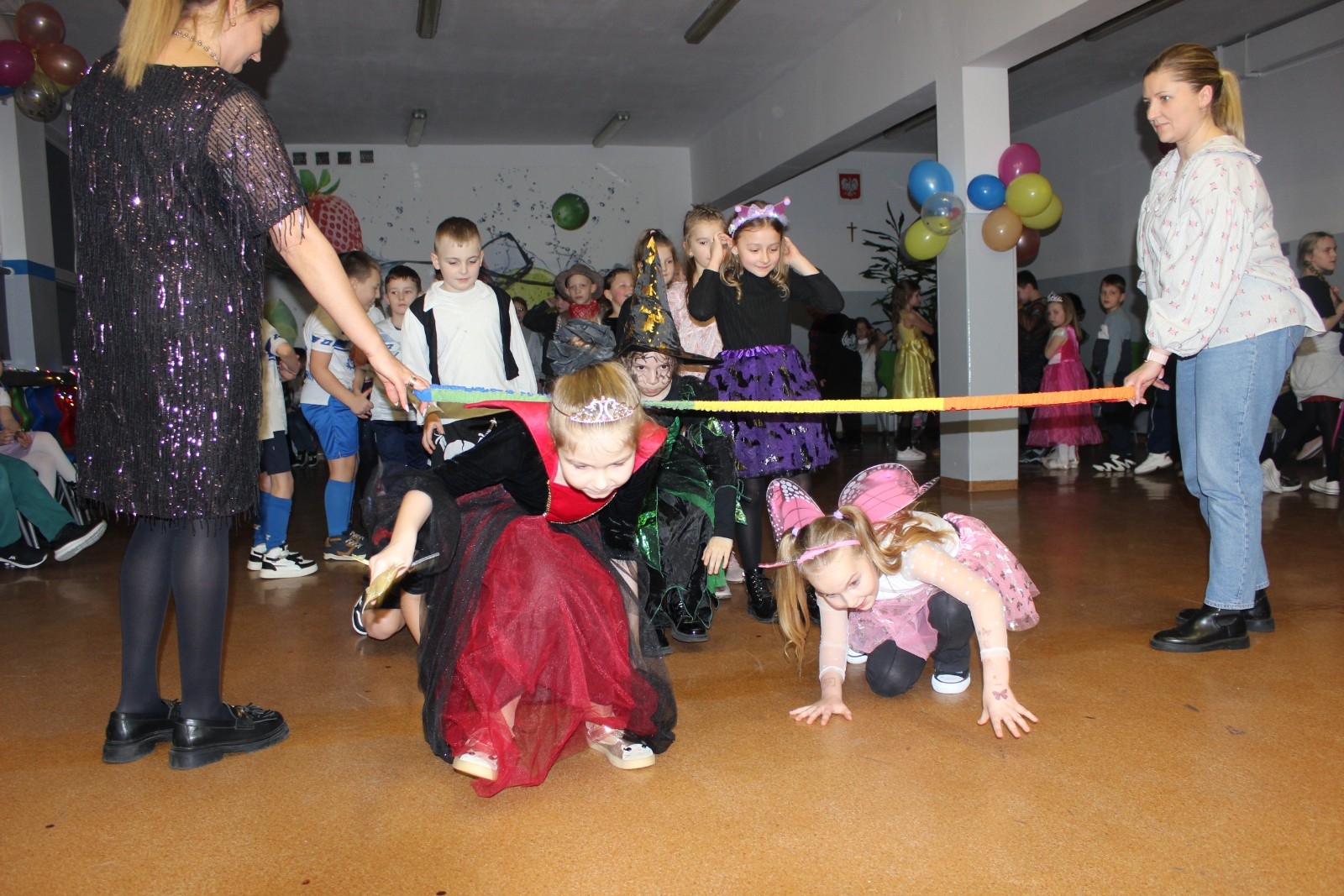 Szkolna stołówka zamieniła się w salę do tańca, przystrojoną kolorowymi balonami. Dzieci przybyły tłumnie, przebrane w różnorodne stroje. Było dużo śmiechu, tańców, a także balonowe tango czy taneczny wąż.
