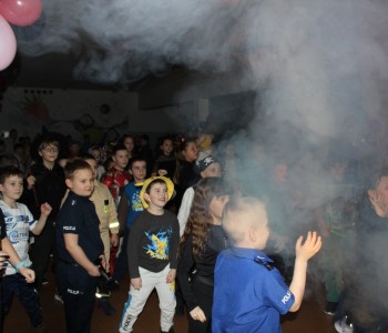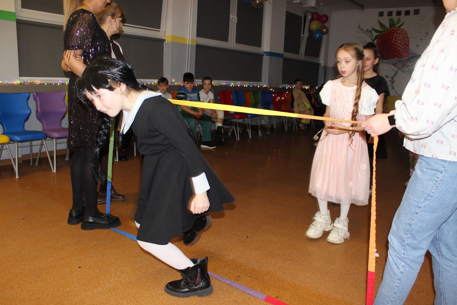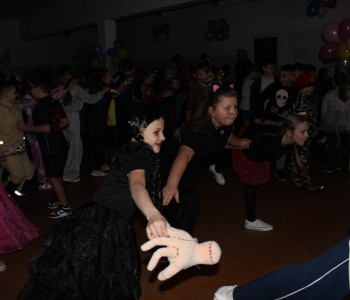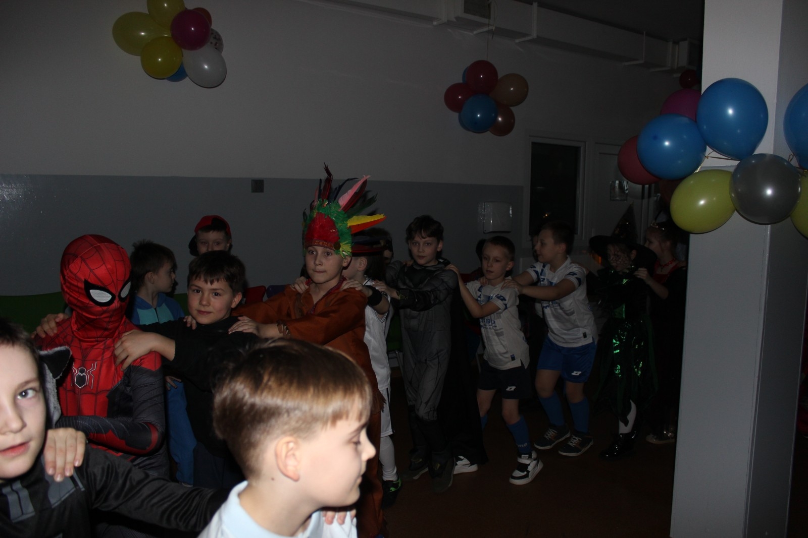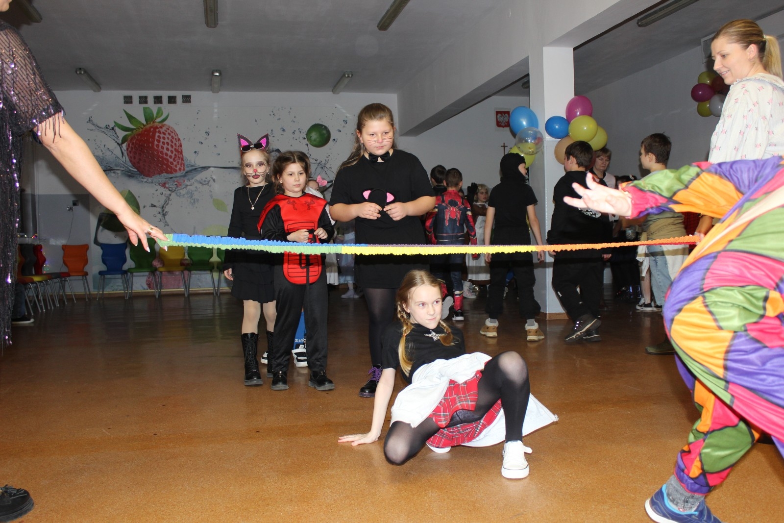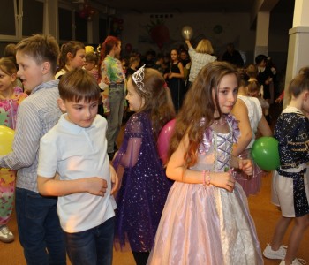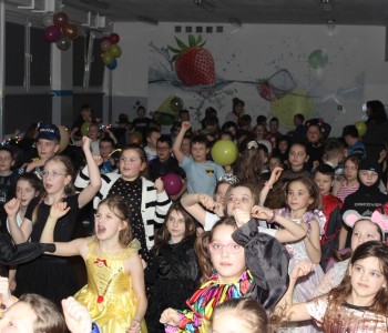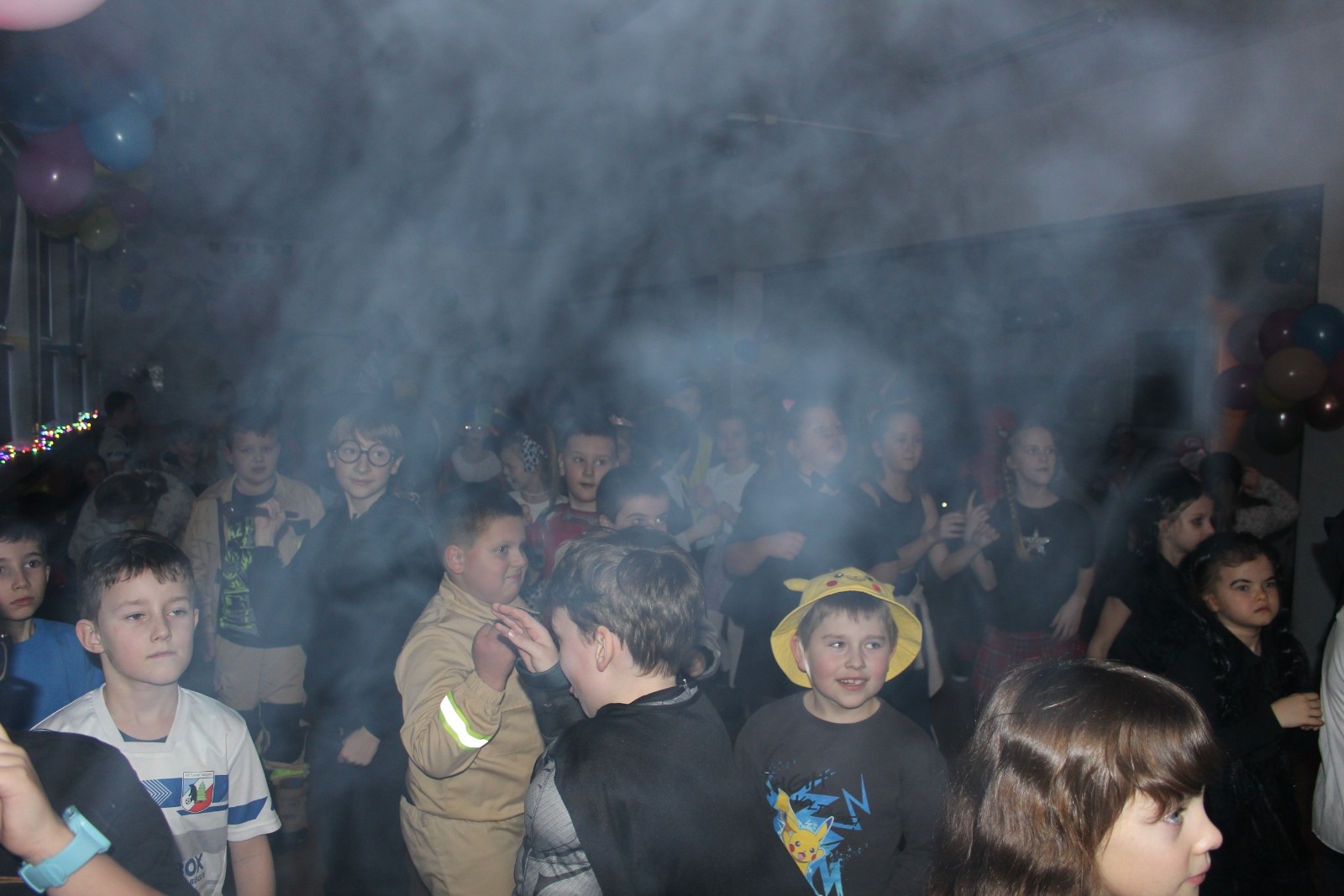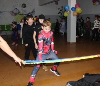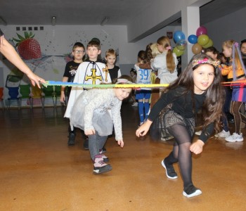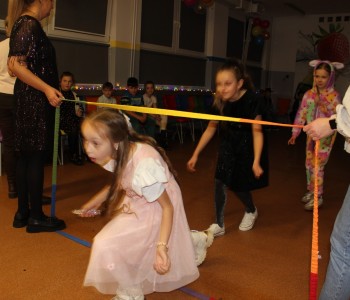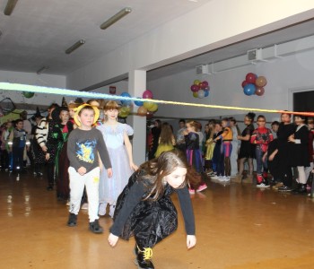 Szkolna stołówka zamieniła się w salę do tańca, przystrojoną kolorowymi balonami. Dzieci przybyły tłumnie, przebrane w różnorodne stroje. Było dużo śmiechu, tańców, a także balonowe tango czy taneczny wąż.