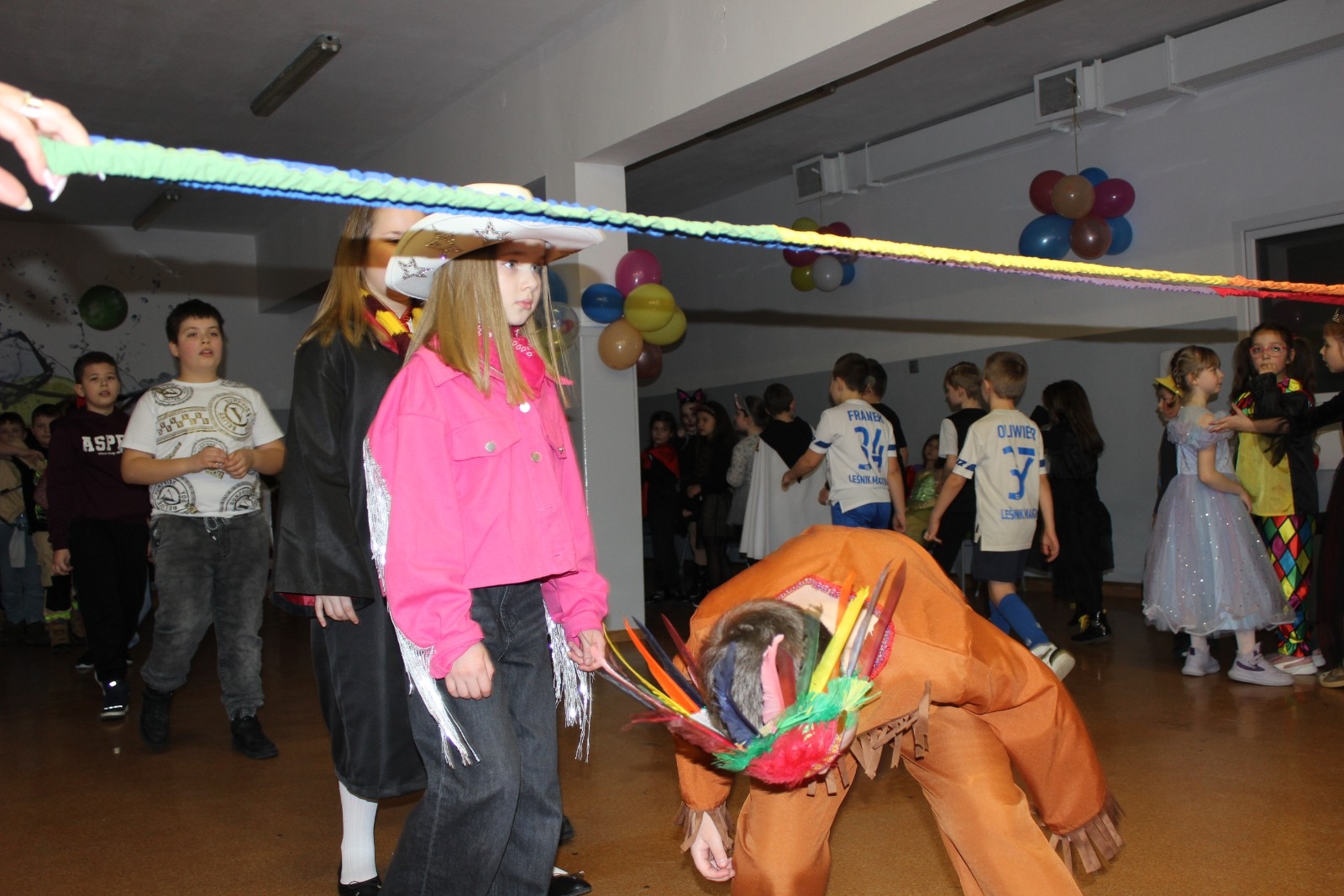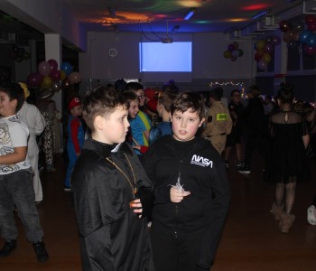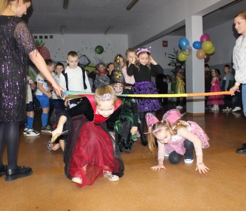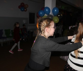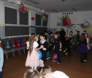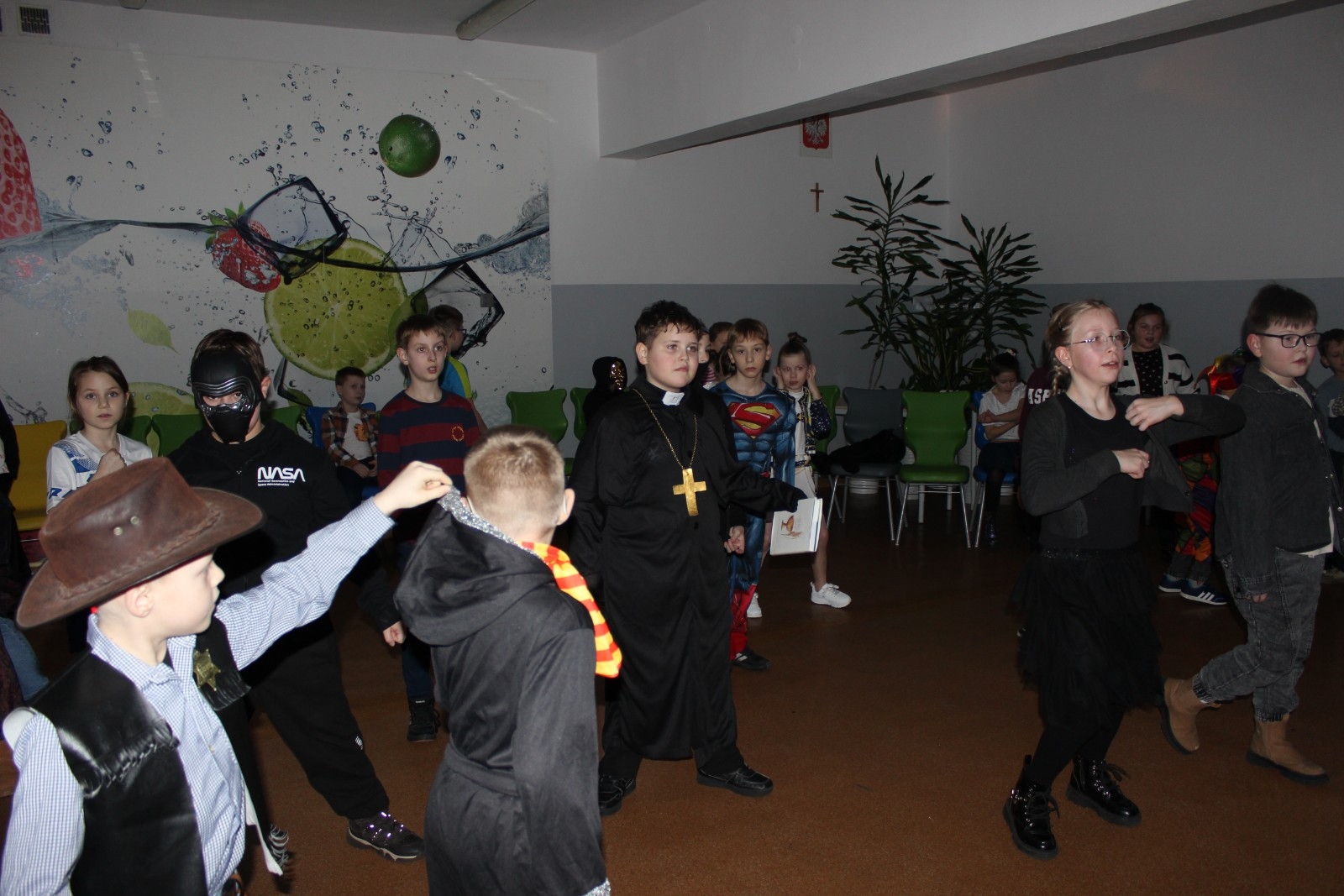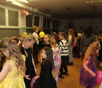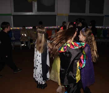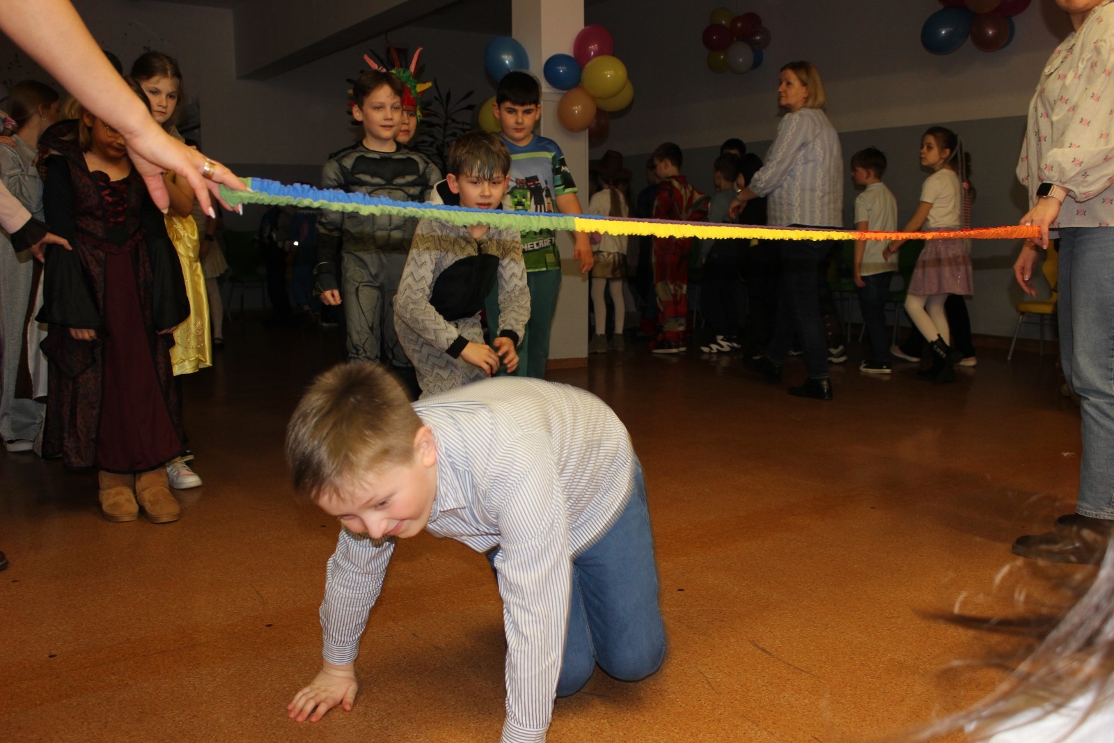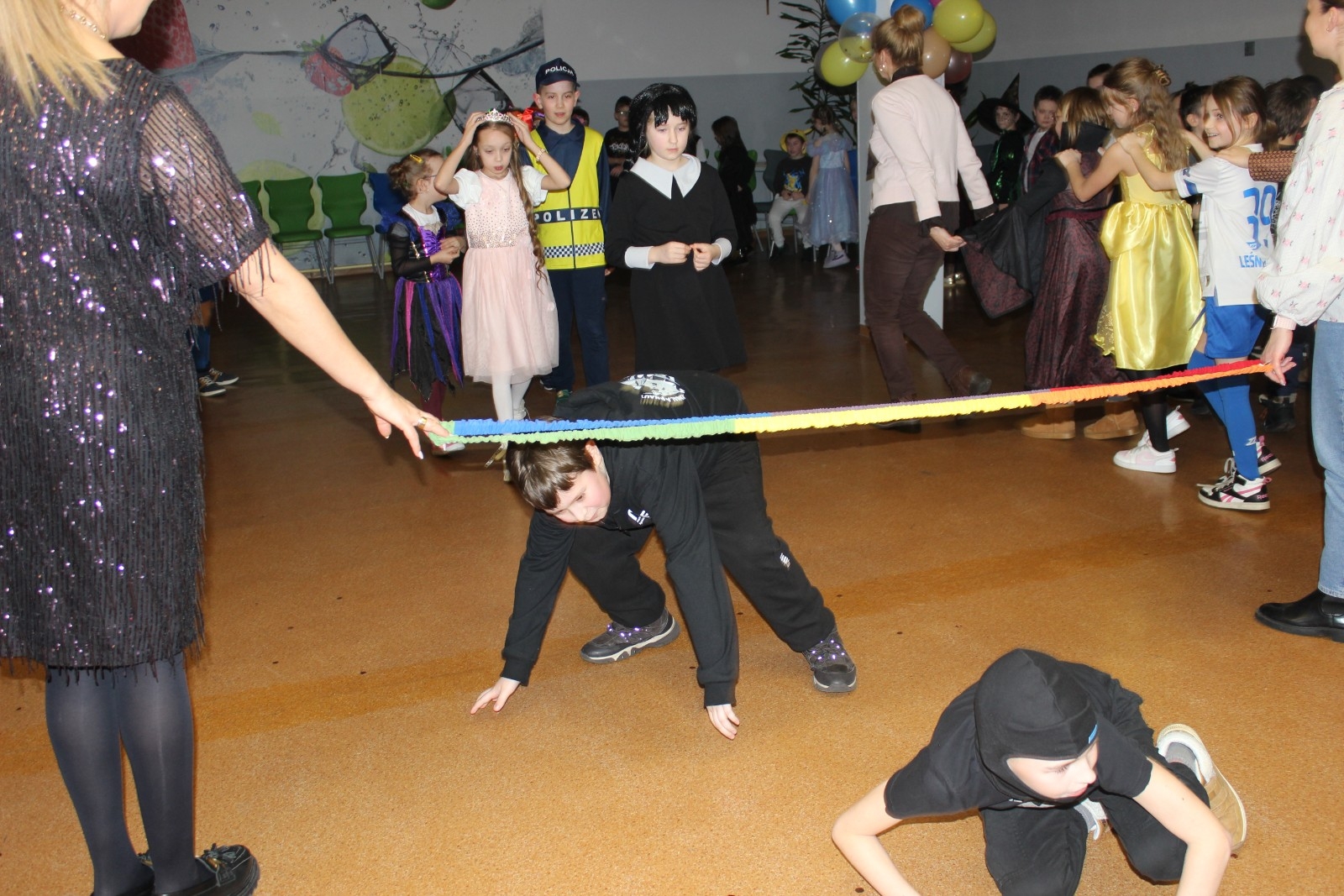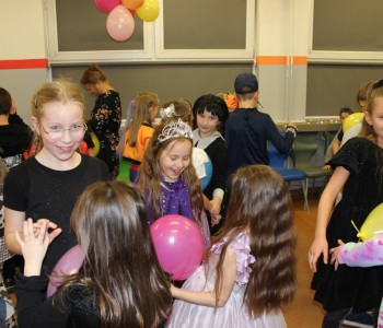 Szkolna stołówka zamieniła się w salę do tańca, przystrojoną kolorowymi balonami. Dzieci przybyły tłumnie, przebrane w różnorodne stroje. Było dużo śmiechu, tańców, a także balonowe tango czy taneczny wąż.