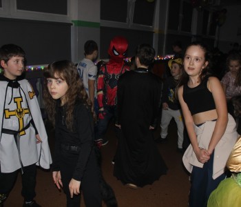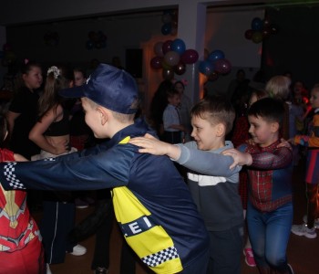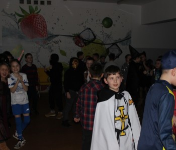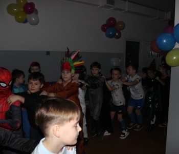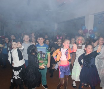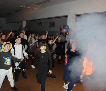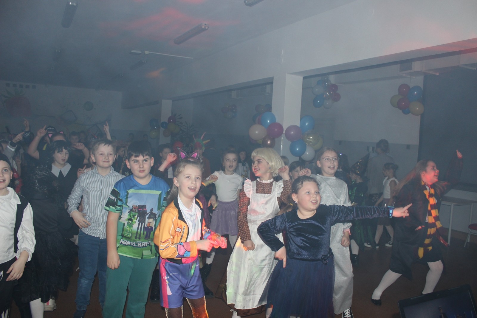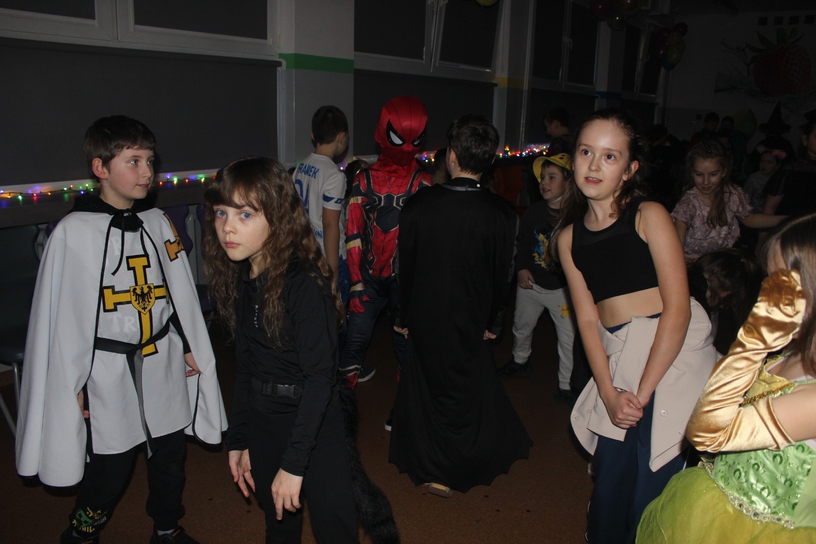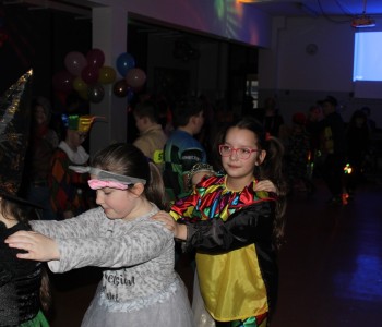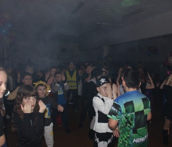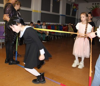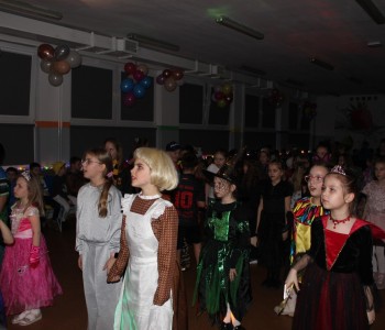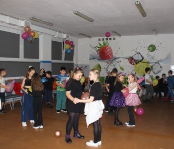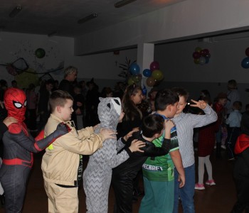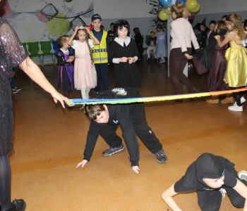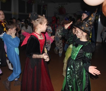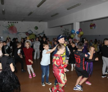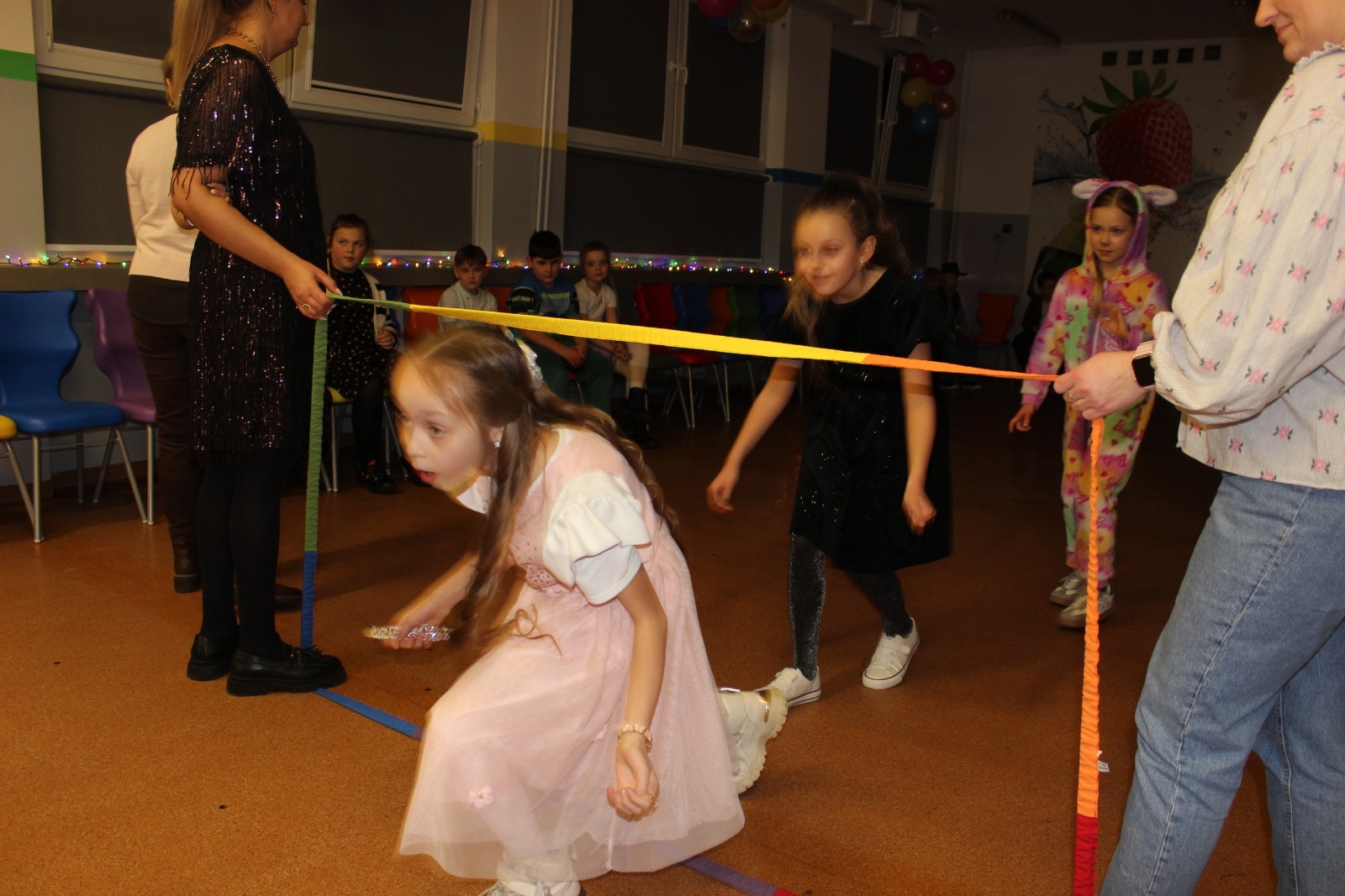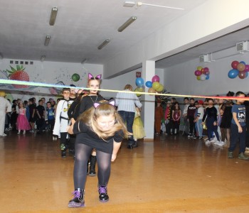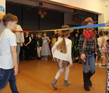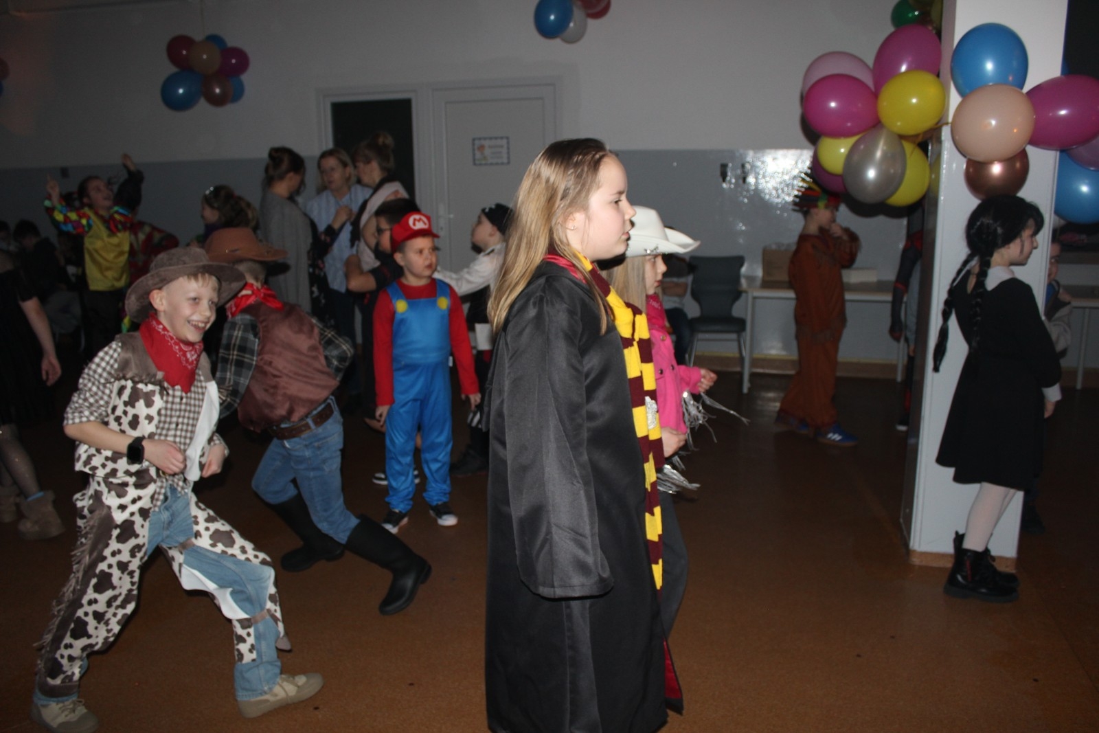 Szkolna stołówka zamieniła się w salę do tańca, przystrojoną kolorowymi balonami. Dzieci przybyły tłumnie, przebrane w różnorodne stroje. Było dużo śmiechu, tańców, a także balonowe tango czy taneczny wąż.