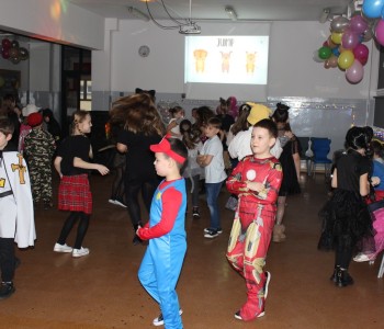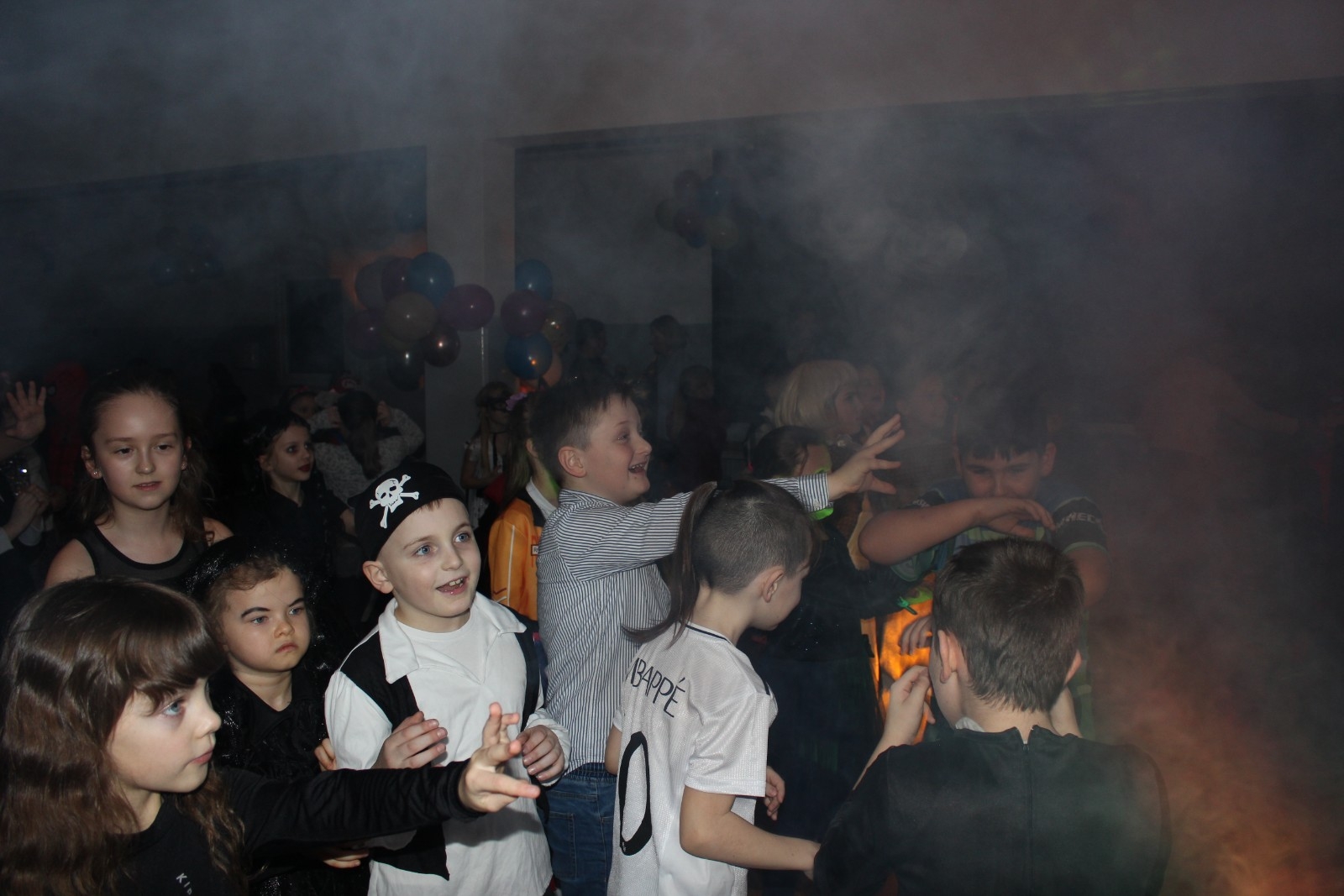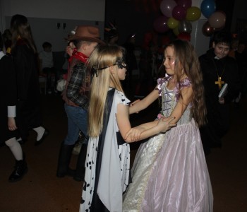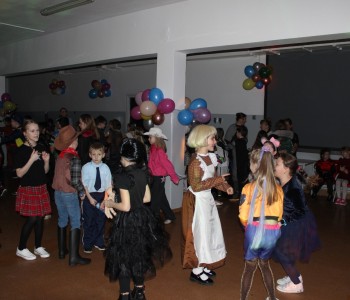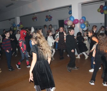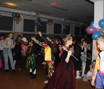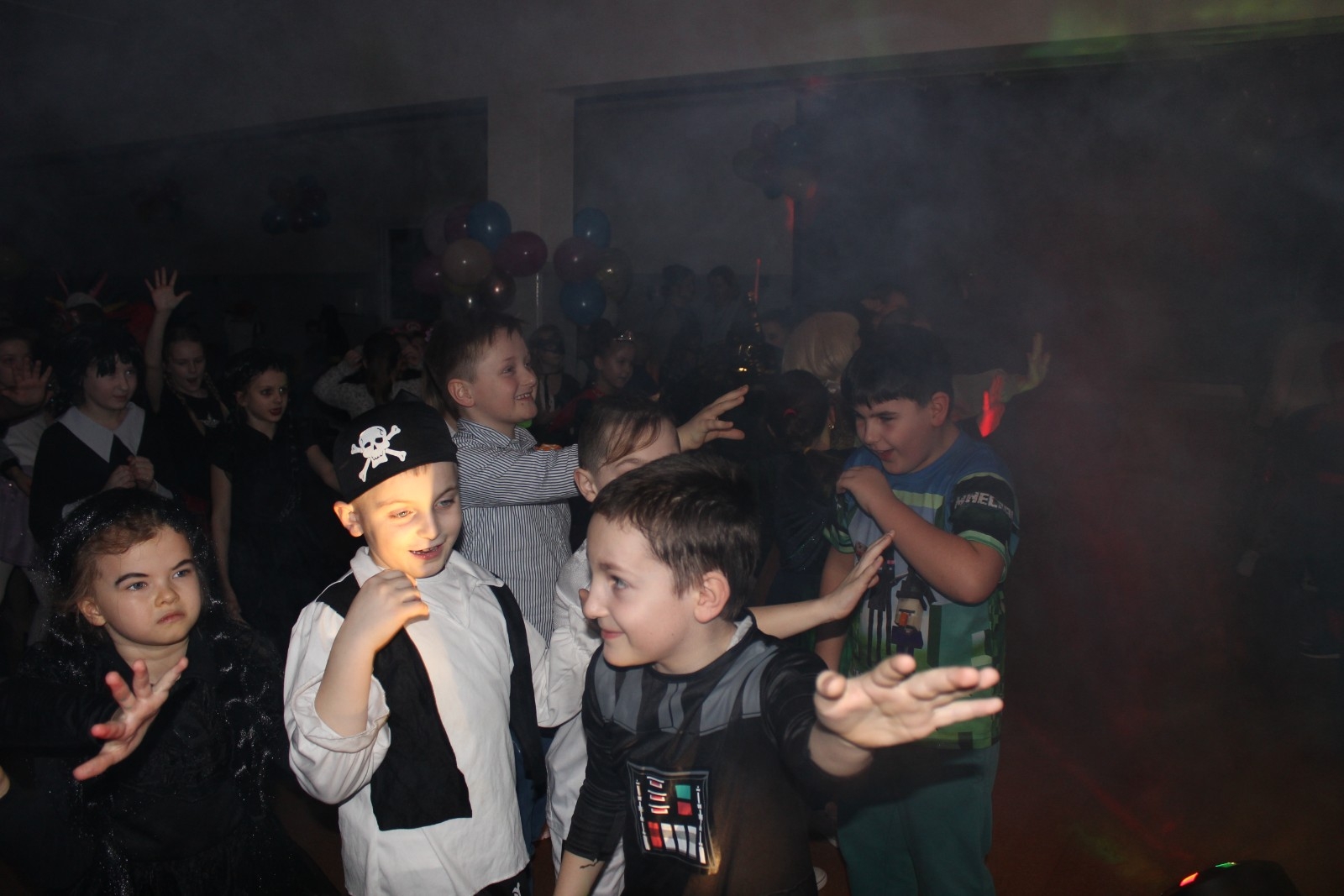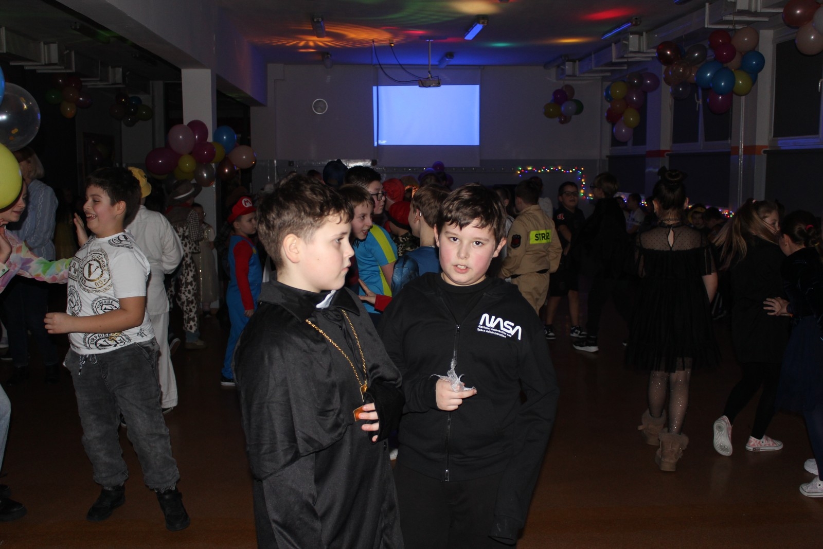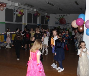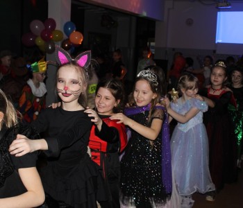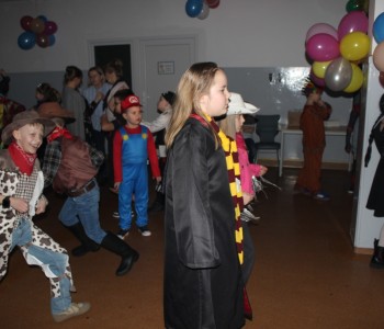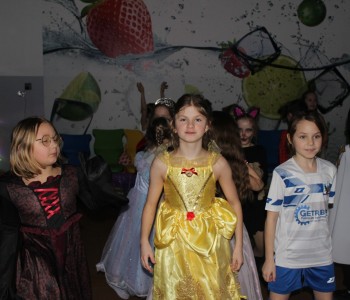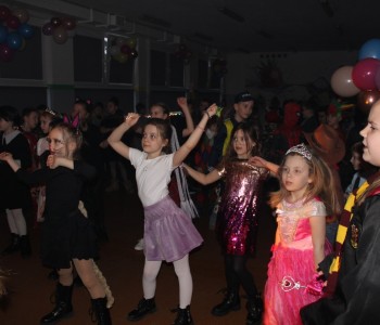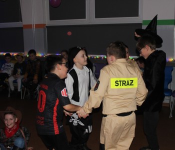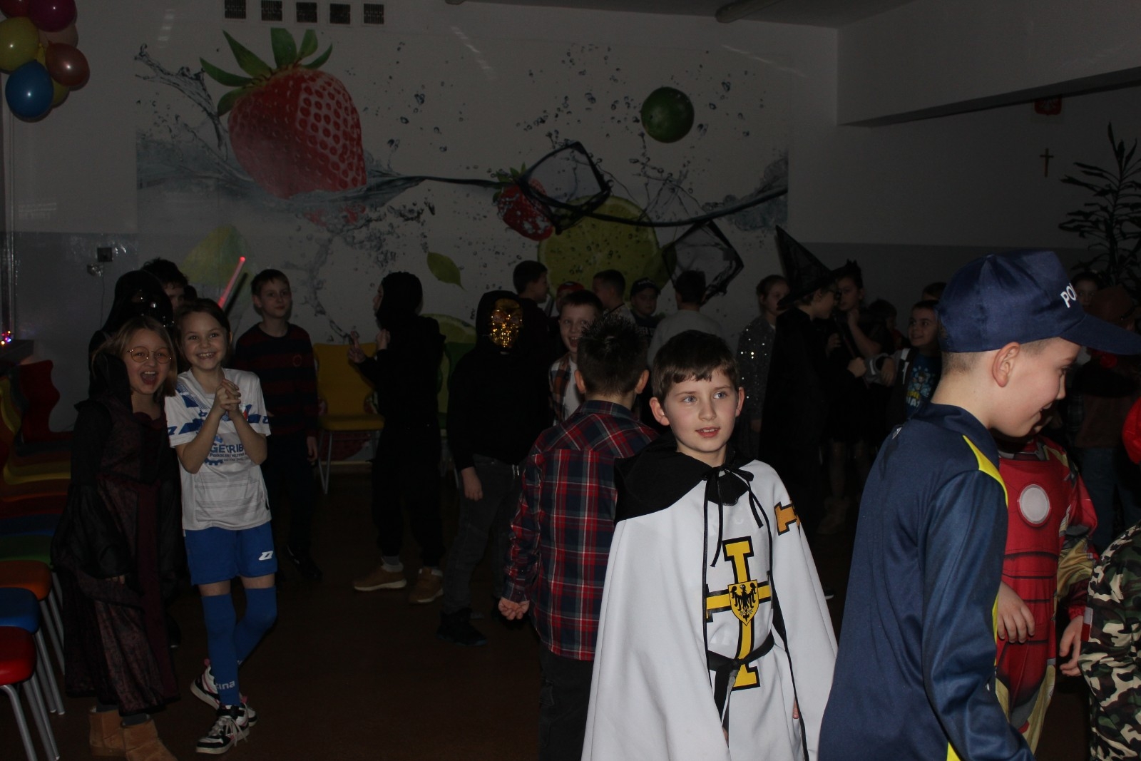 Szkolna stołówka zamieniła się w salę do tańca, przystrojoną kolorowymi balonami. Dzieci przybyły tłumnie, przebrane w różnorodne stroje. Było dużo śmiechu, tańców, a także balonowe tango czy taneczny wąż.