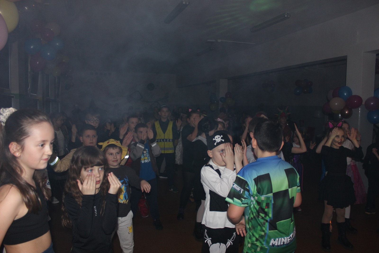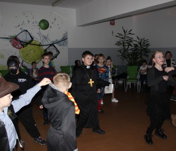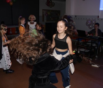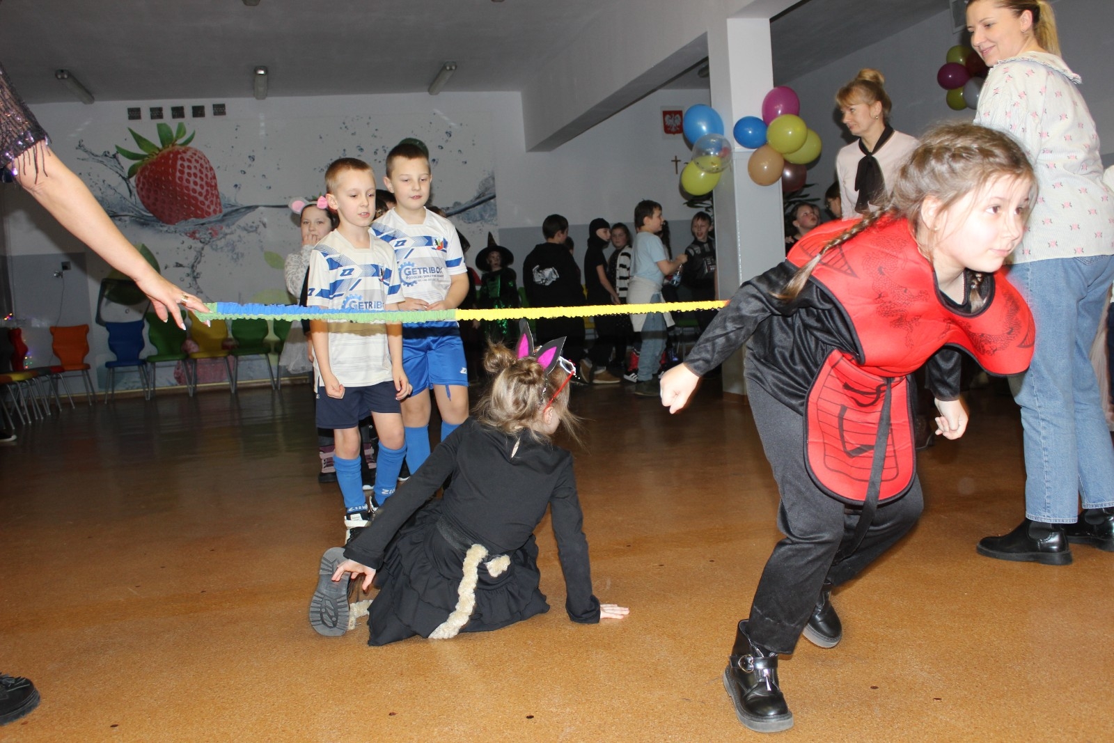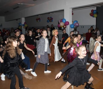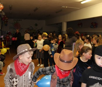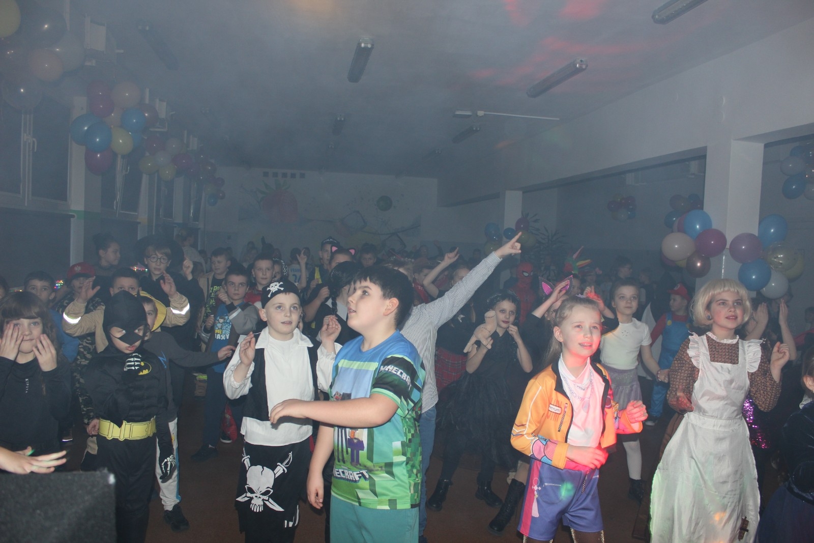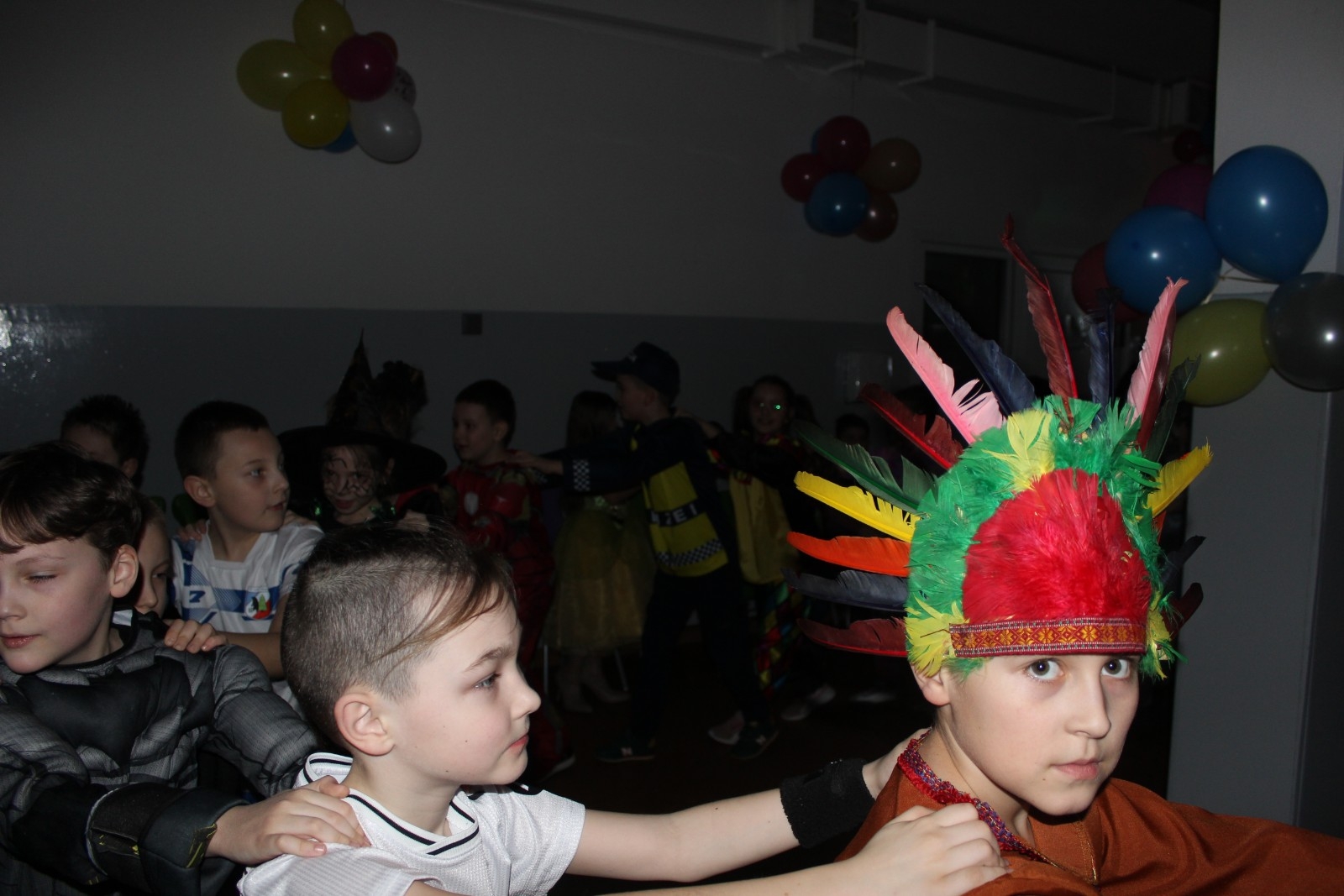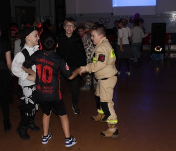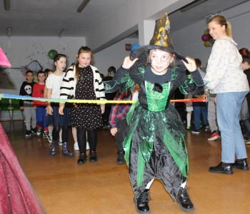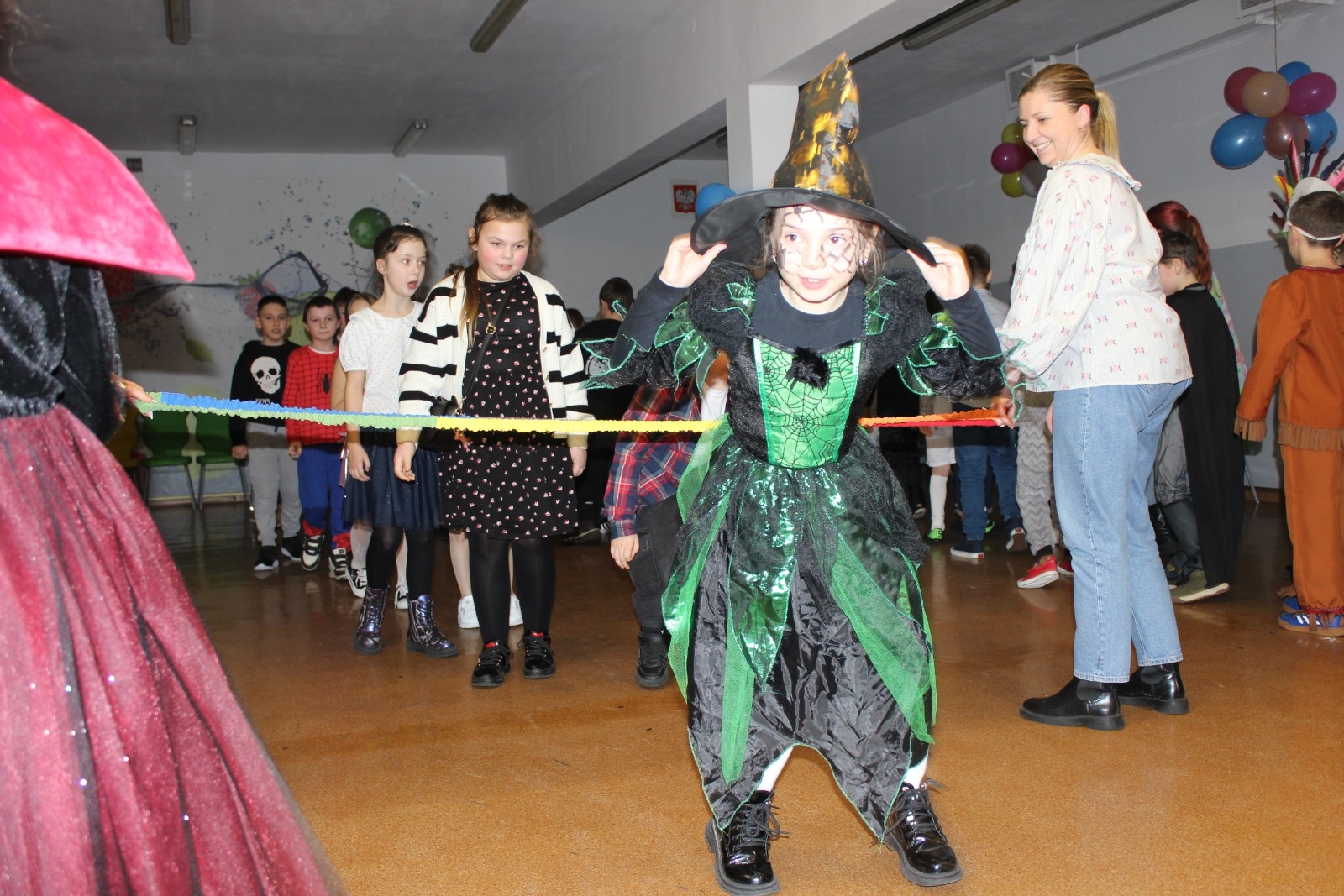 Szkolna stołówka zamieniła się w salę do tańca, przystrojoną kolorowymi balonami. Dzieci przybyły tłumnie, przebrane w różnorodne stroje. Było dużo śmiechu, tańców, a także balonowe tango czy taneczny wąż.