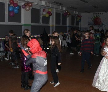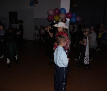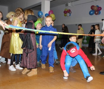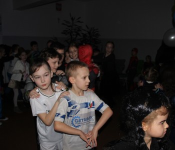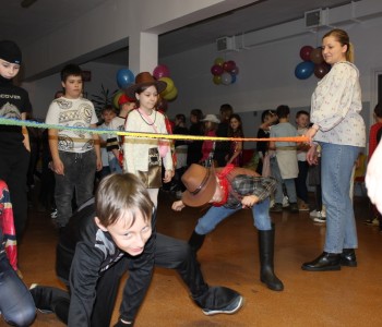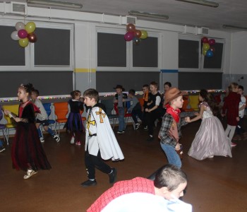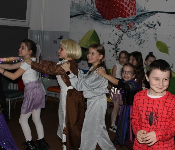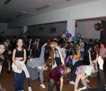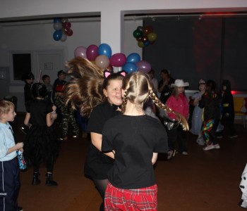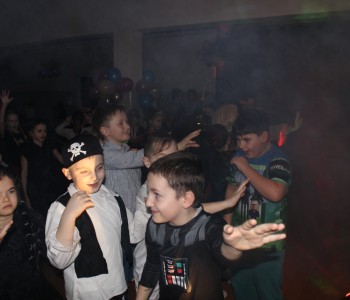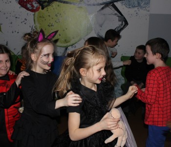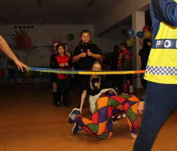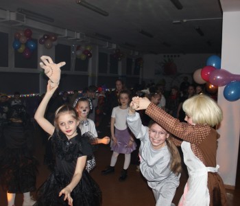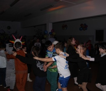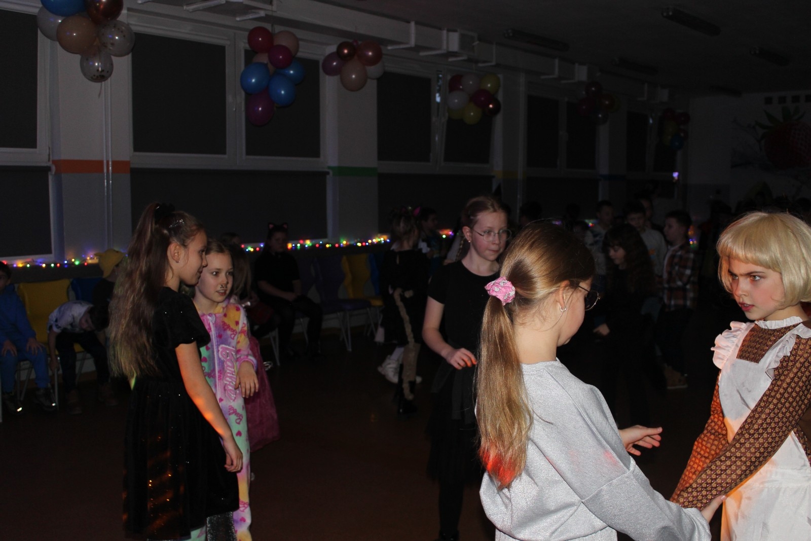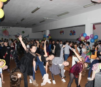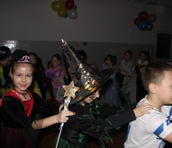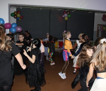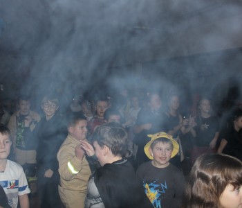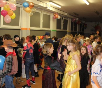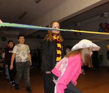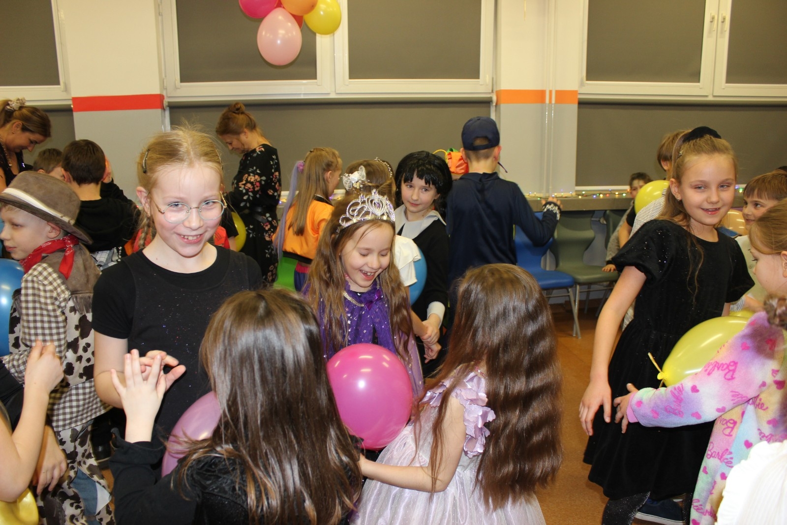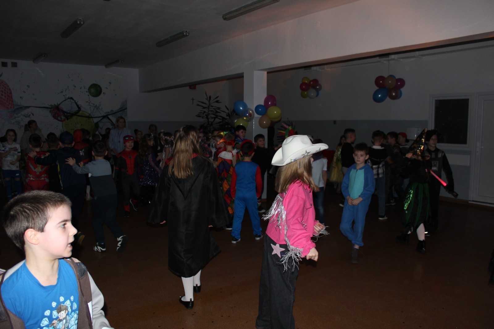 Szkolna stołówka zamieniła się w salę do tańca, przystrojoną kolorowymi balonami. Dzieci przybyły tłumnie, przebrane w różnorodne stroje. Było dużo śmiechu, tańców, a także balonowe tango czy taneczny wąż.