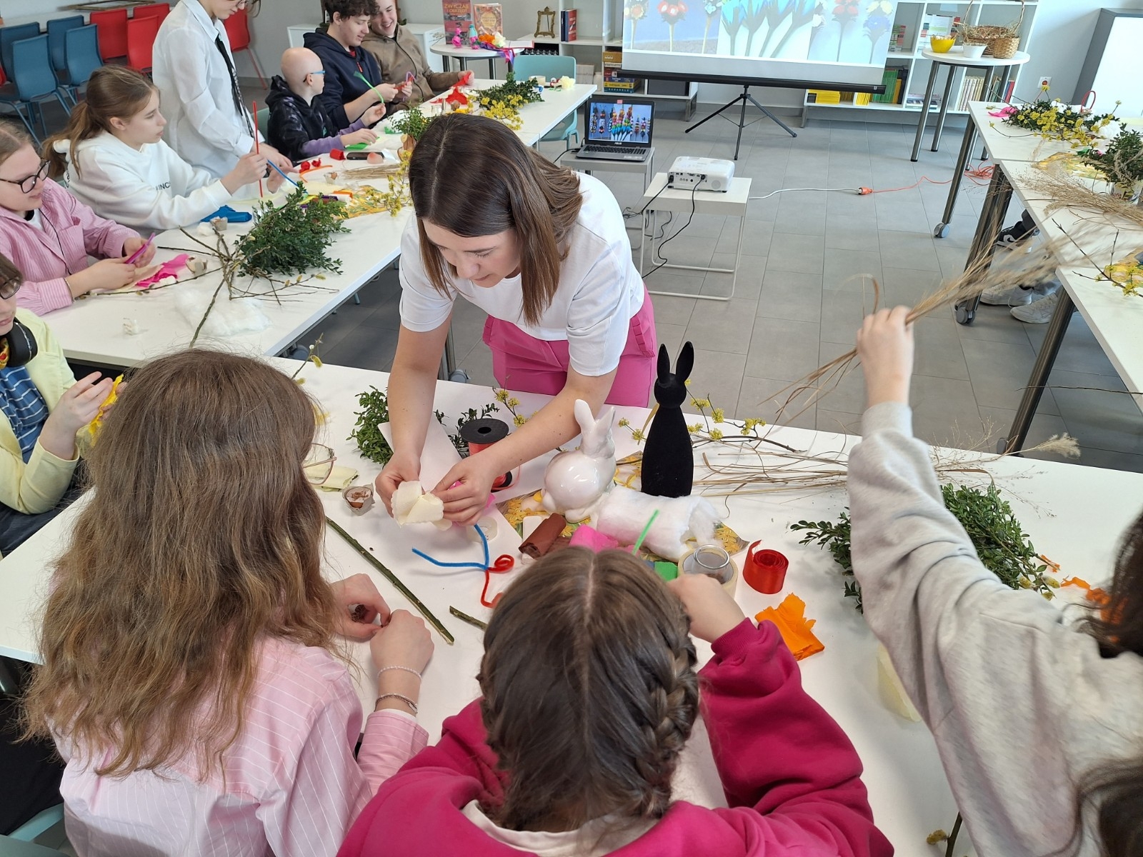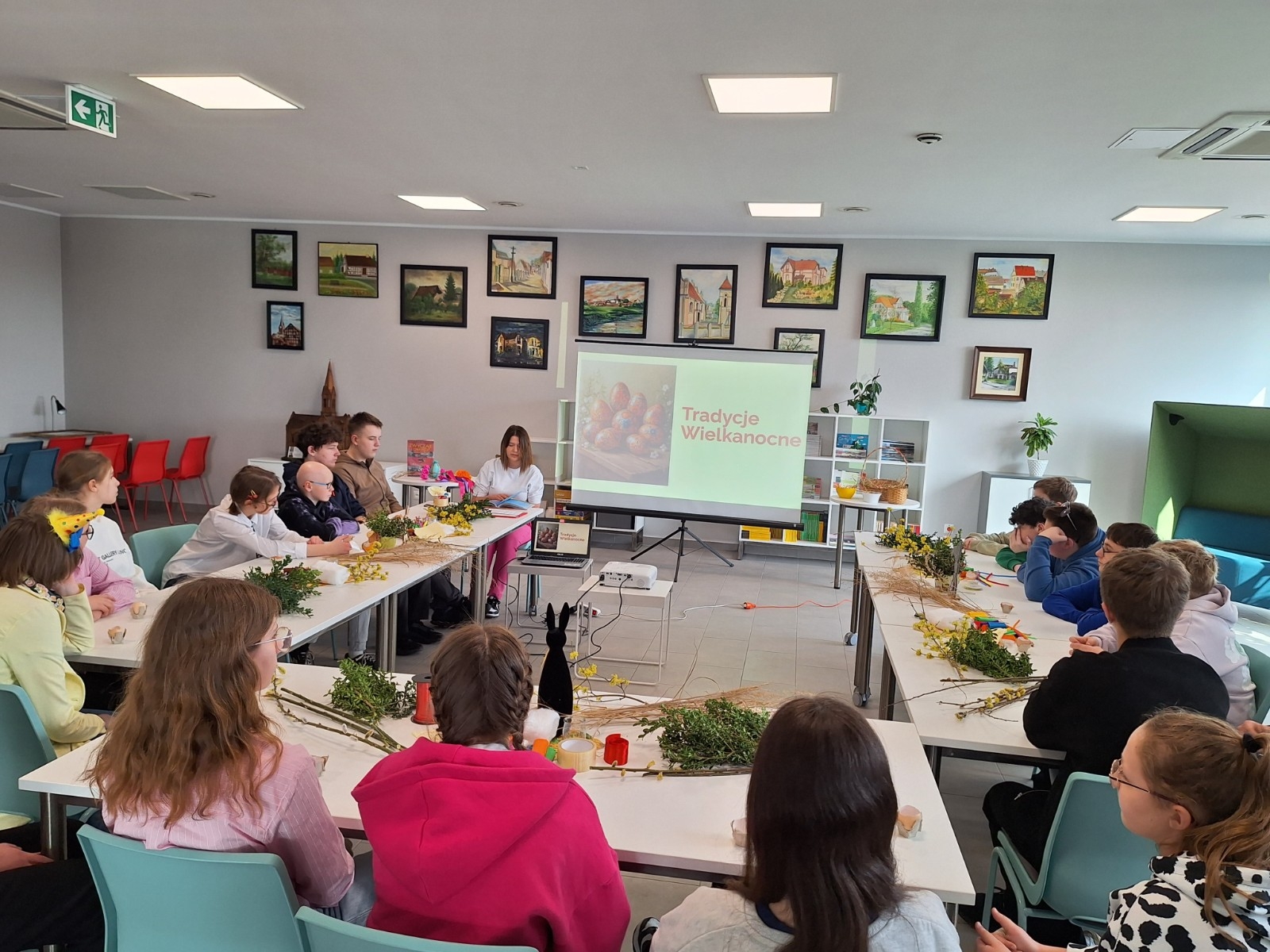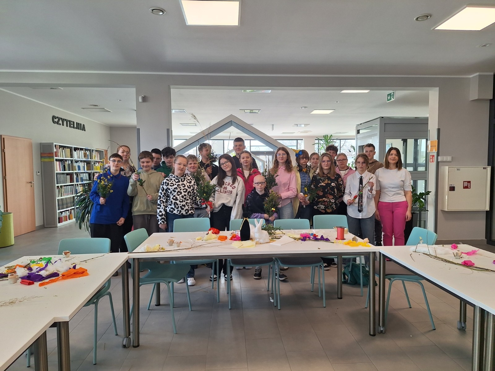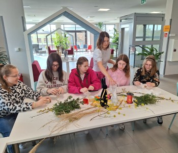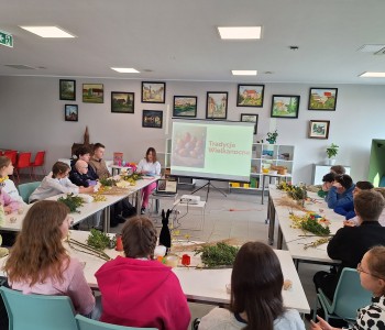Podczas zajęć młodzież wysłuchała fragmentu książki „Świętujemy cały rok! 36 świąt z różnych stron świata” J. Kończaka oraz obejrzała prezentację na temat tradycji wielkanocnych obchodzonych w różnych krajach. Uczniowie mieli także okazję wziąć udział w części praktycznej warsztatów – zasiali rzeżuchę w skorupkach jajek oraz wykonali własne palmy wielkanocne.