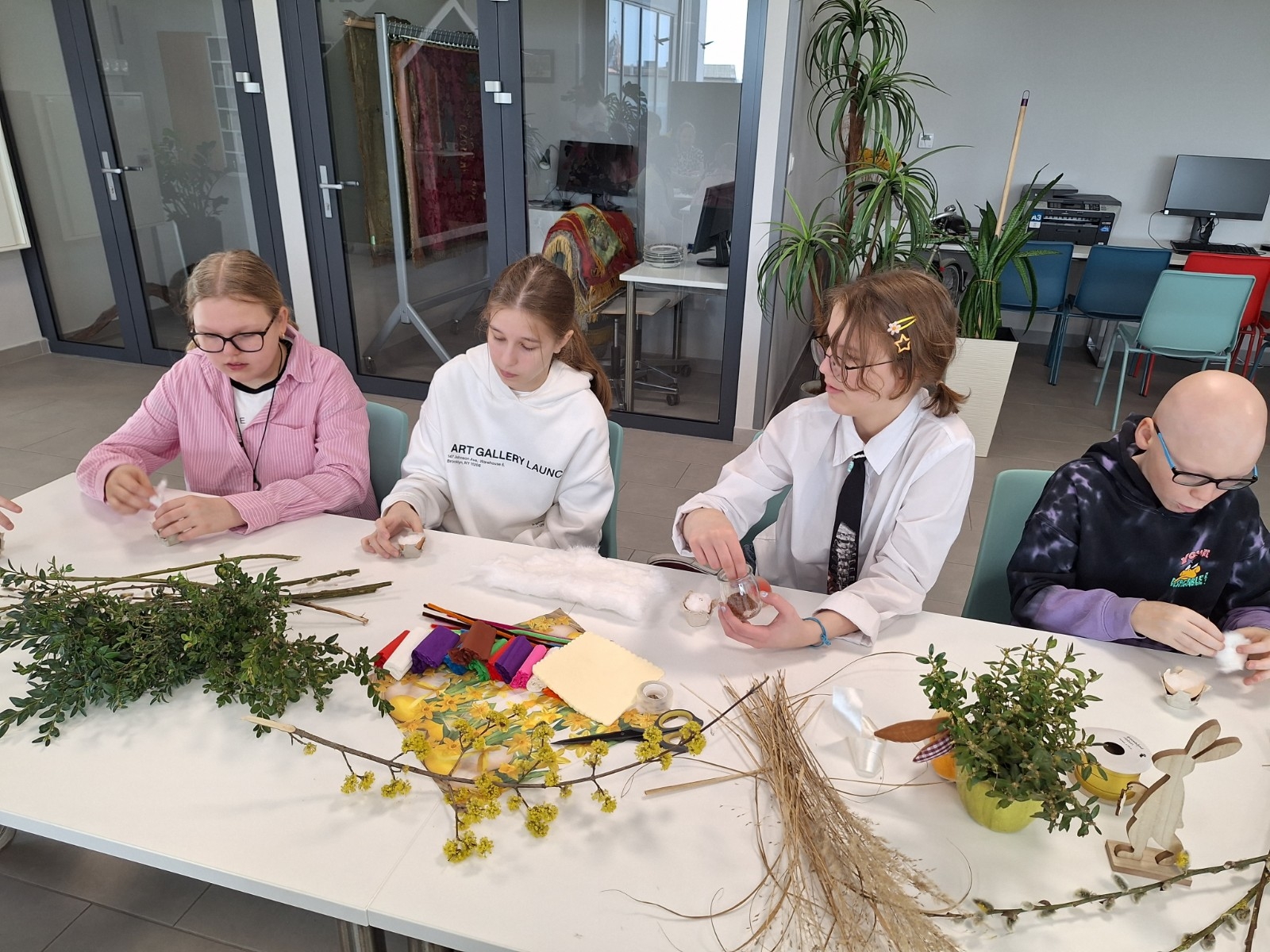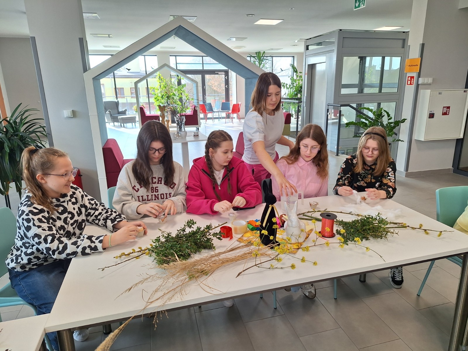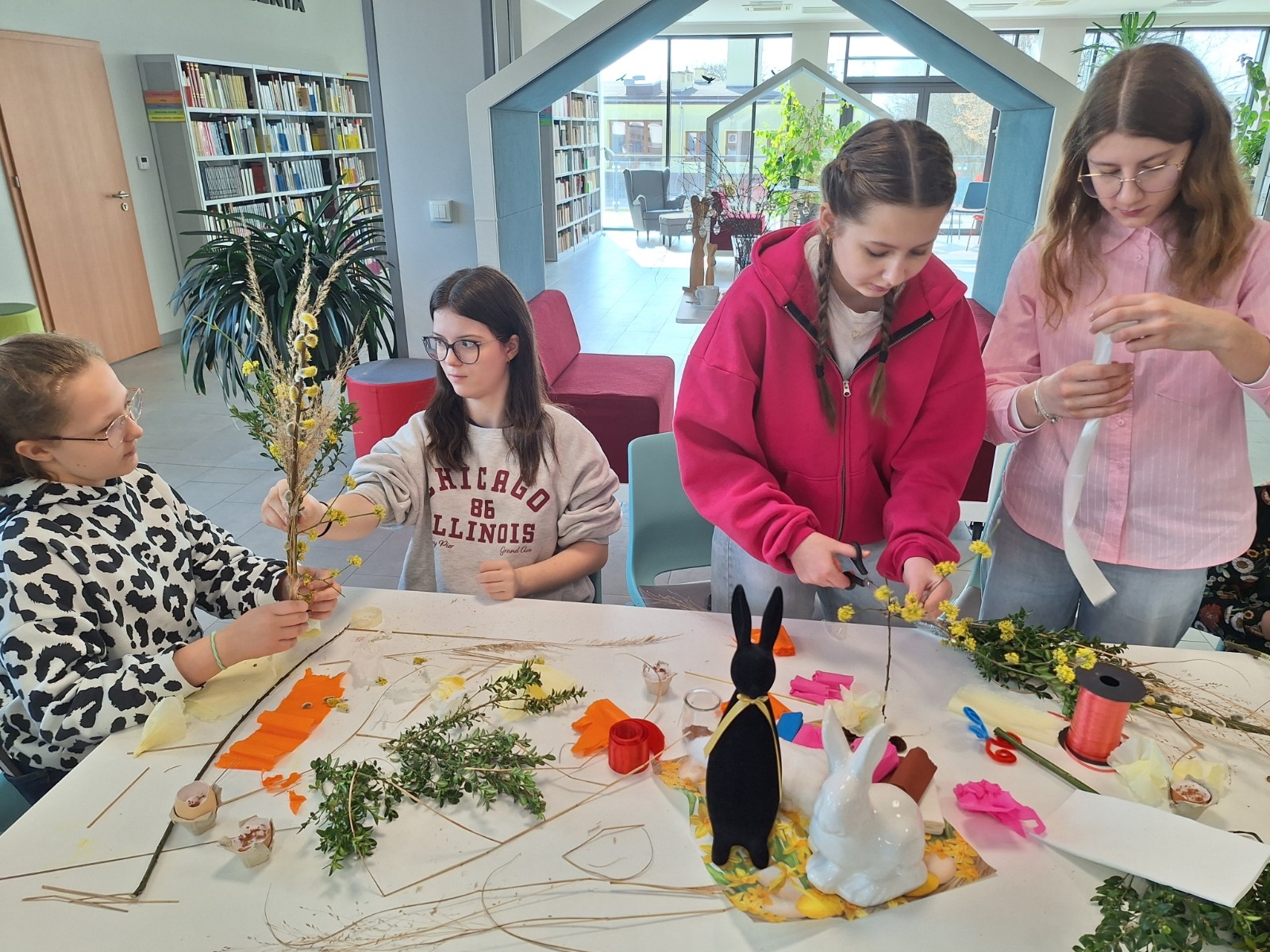 Podczas zajęć młodzież wysłuchała fragmentu książki „Świętujemy cały rok! 36 świąt z różnych stron świata” J. Kończaka oraz obejrzała prezentację na temat tradycji wielkanocnych obchodzonych w różnych krajach. Uczniowie mieli także okazję wziąć udział w części praktycznej warsztatów – zasiali rzeżuchę w skorupkach jajek oraz wykonali własne palmy wielkanocne.