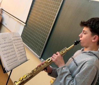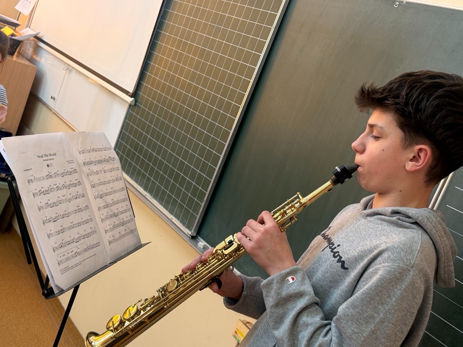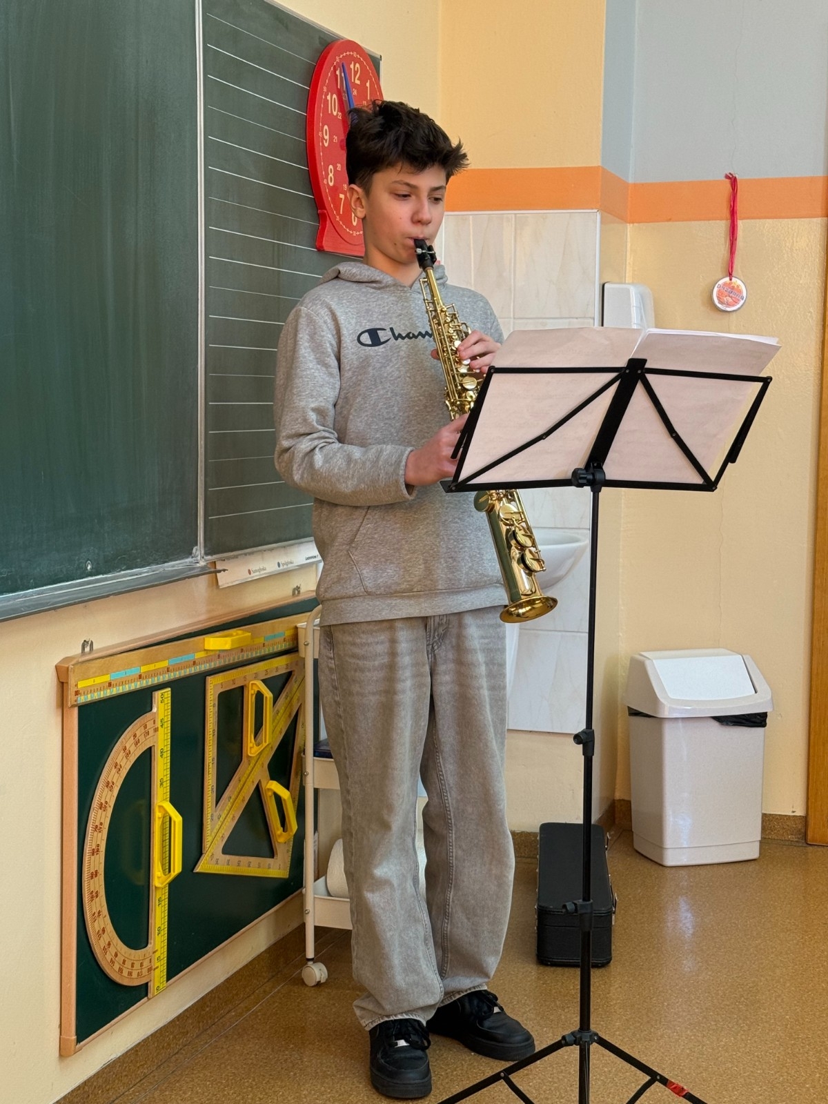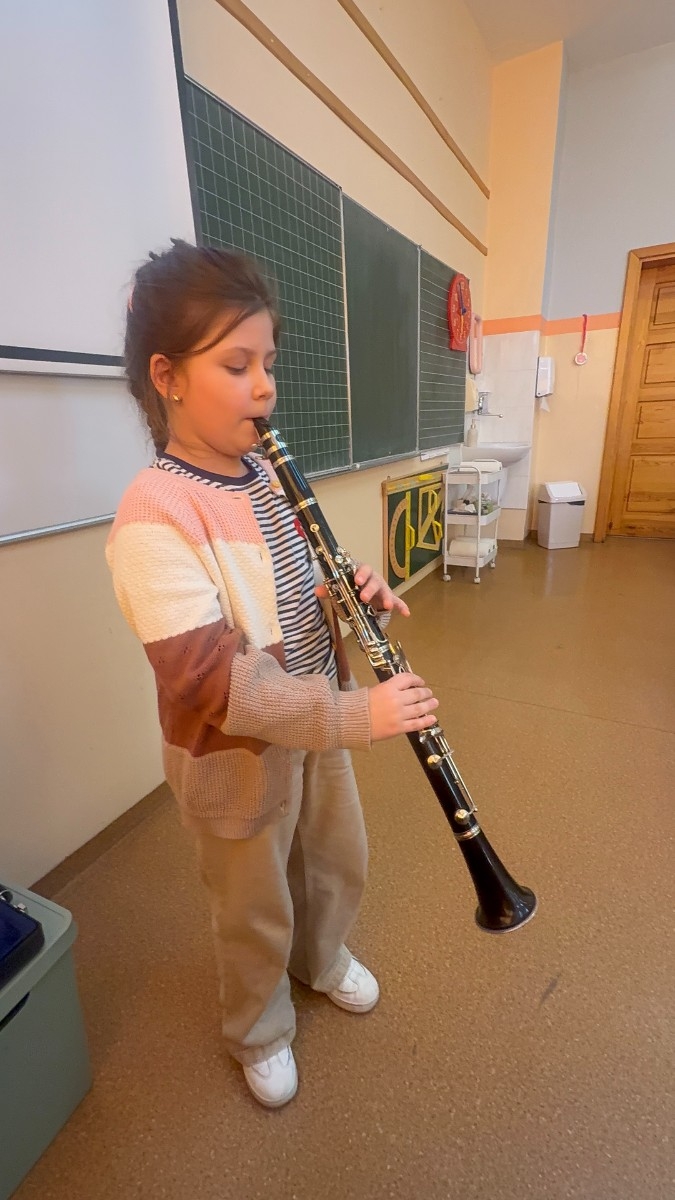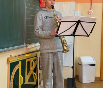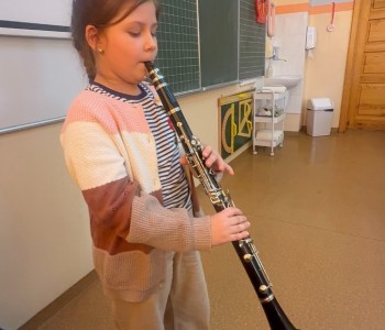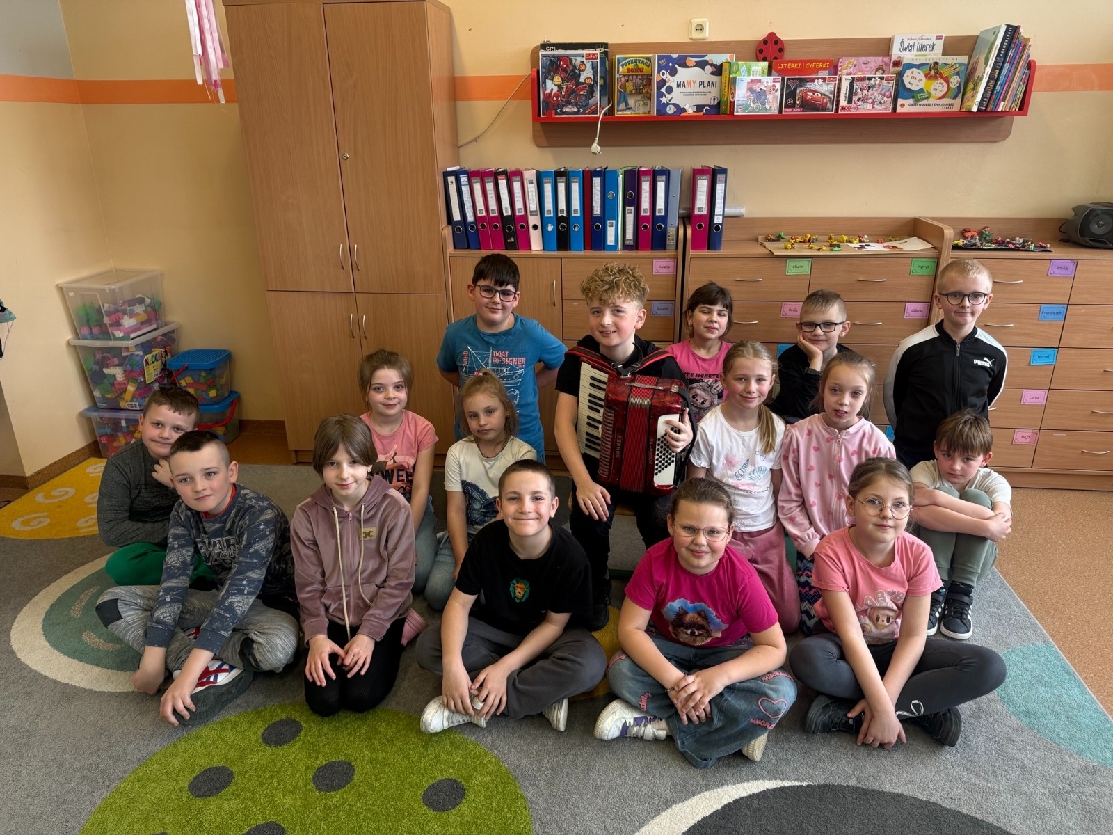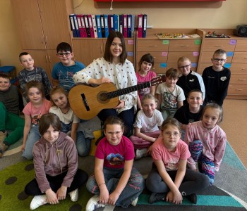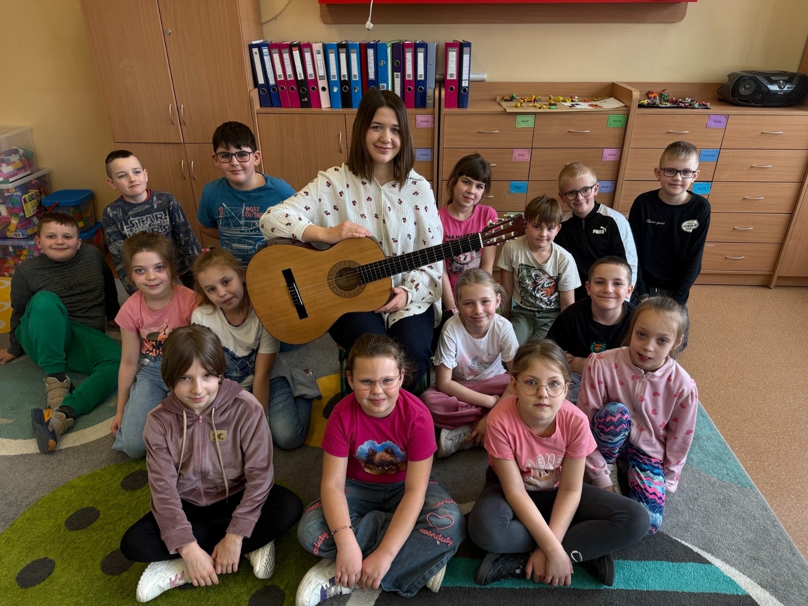 Zaproszeni goście opowiadali o tym, jak powstaje muzyka, czym jest rytm i jak ważne są wibracje w tworzeniu dźwięku, wyjaśnili w jaki sposób wydobywa się dźwięk z instrumentów i zaprezentowali swoje umiejętności gry: na saksofonie – Tymoteusz Pasek (ucz. kl. VI a ) i , na klarnecie – Olga Pasek (ucz. kl. I b), na akordeonie - Oliwier Nowak (ucz. kl. IV b) oraz na gitarze pani Martyna Kruszka, która jest absolwentką naszej szkoły. Pani Martyna zaprezentowała również swoje umiejętności wokalne angażując do śpiewu wszystkich uczniów. Chętne dzieci mogły spróbować swoich sił w grze na instrumentach i poczuć się jak prawdziwi muzycy.