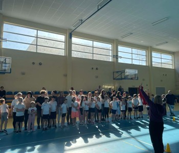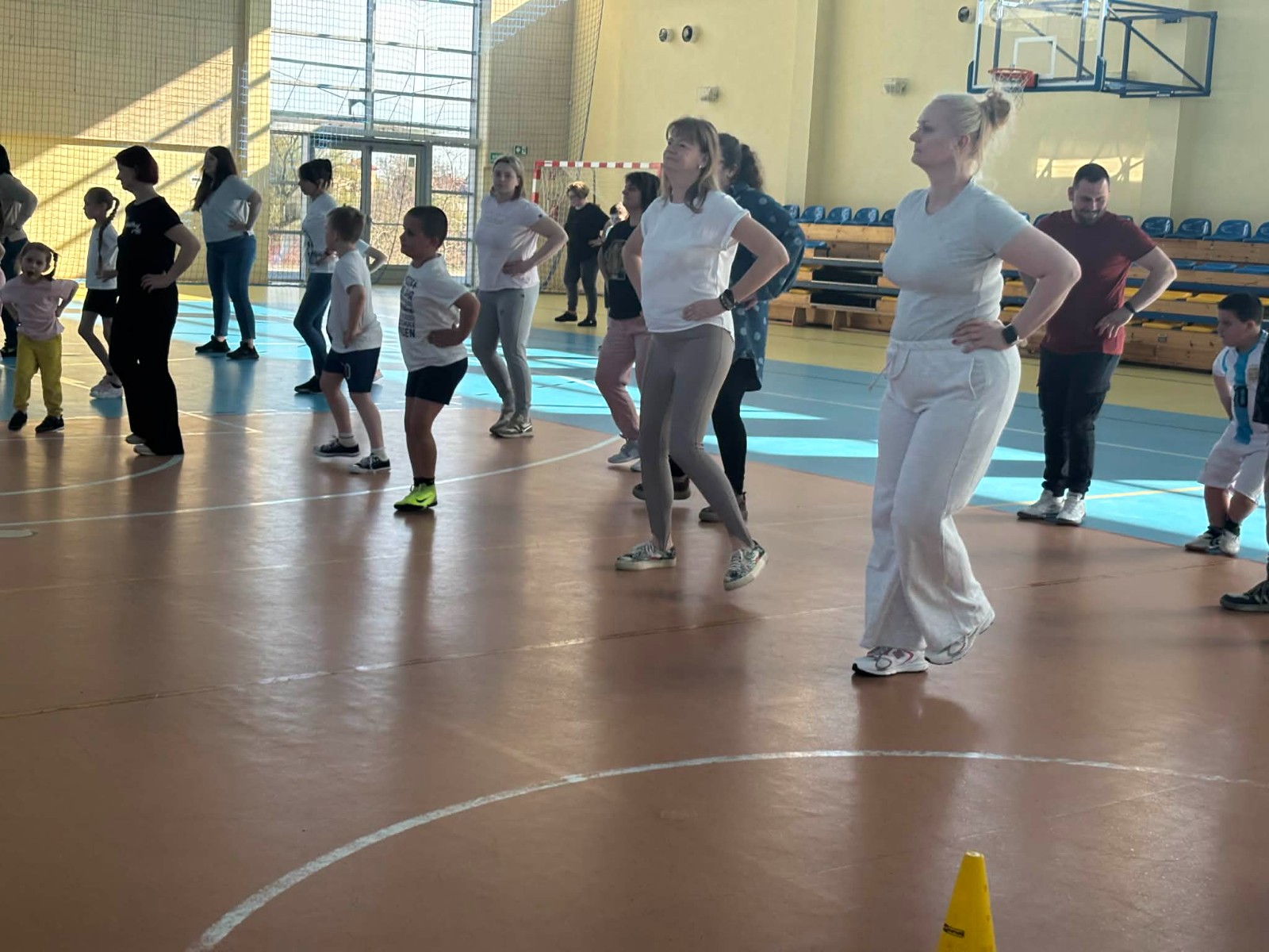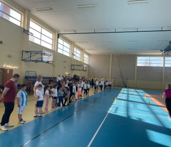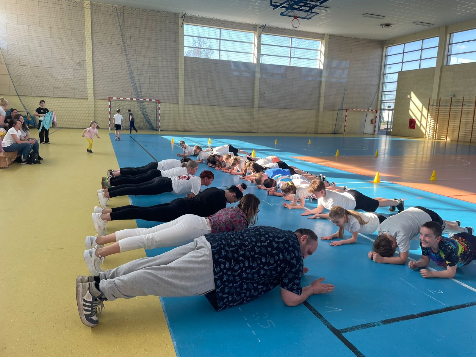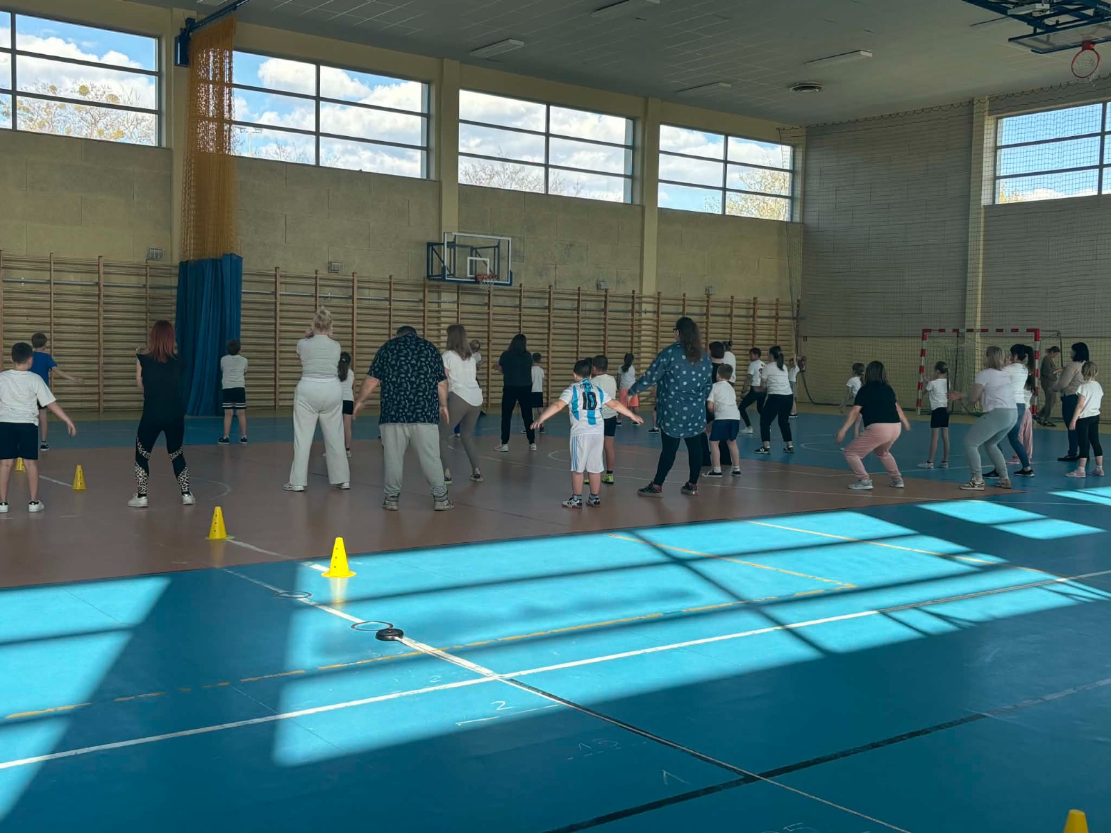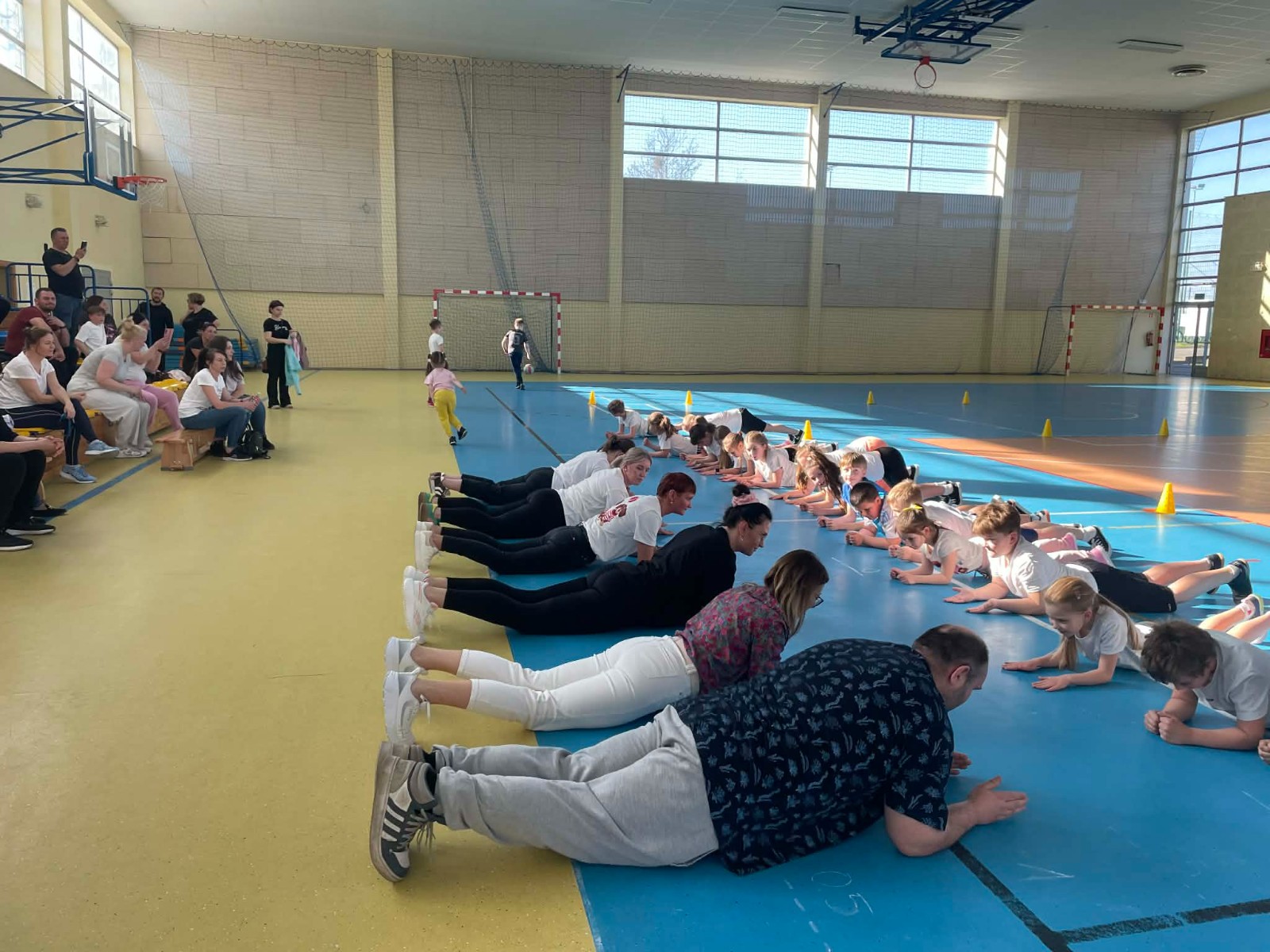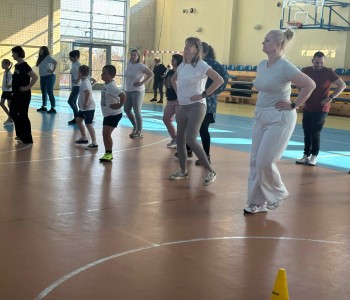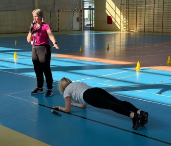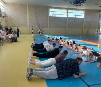 Druga część wywiadówki odbyła się w hali sportowej szkoły i miała charakter praktyczny. Po wspólnej rozgrzewce oraz zabawach ruchowych zaprezentowano rodzicom testy sprawnościowe omawiane wcześniej w części teoretycznej. Rodzice wraz z dziećmi aktywnie uczestniczyli w wykonywaniu ćwiczeń wchodzących w skład testów. Towarzyszyła temu radosna atmosfera, pełna śmiechu, zabawy i zdrowej rywalizacji. Dzięki temu rodzice mogli w praktyce zapoznać się z przebiegiem testów oraz porównać własne możliwości z wynikami swoich dzieci. Dzieci natomiast miały okazję obserwować aktywność fizyczną swoich rodziców.
