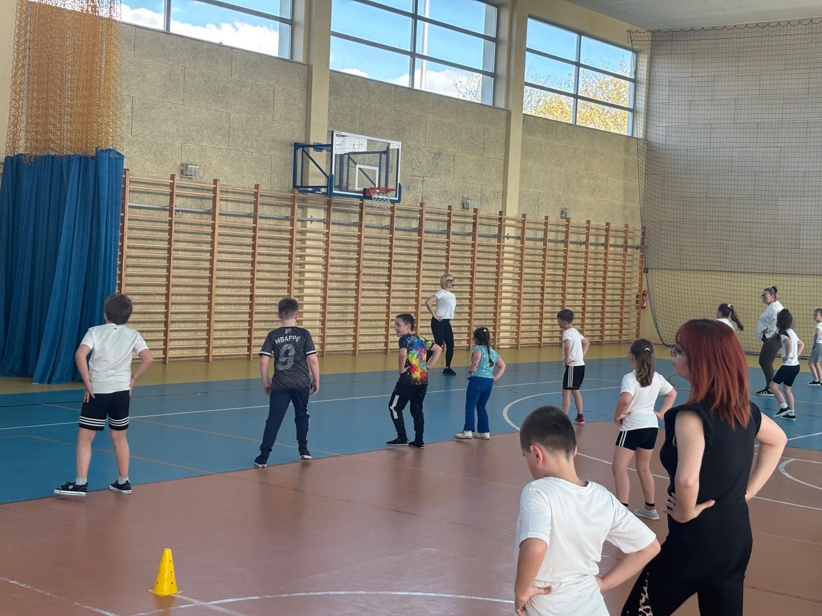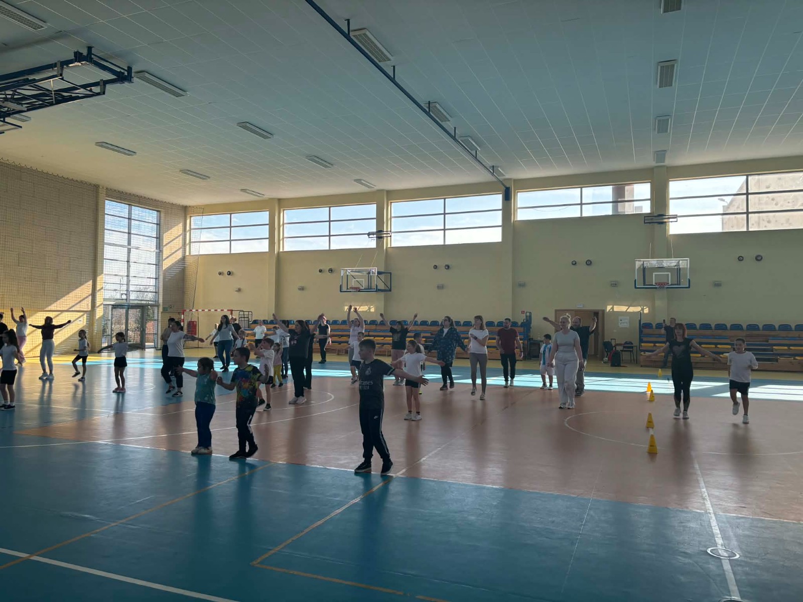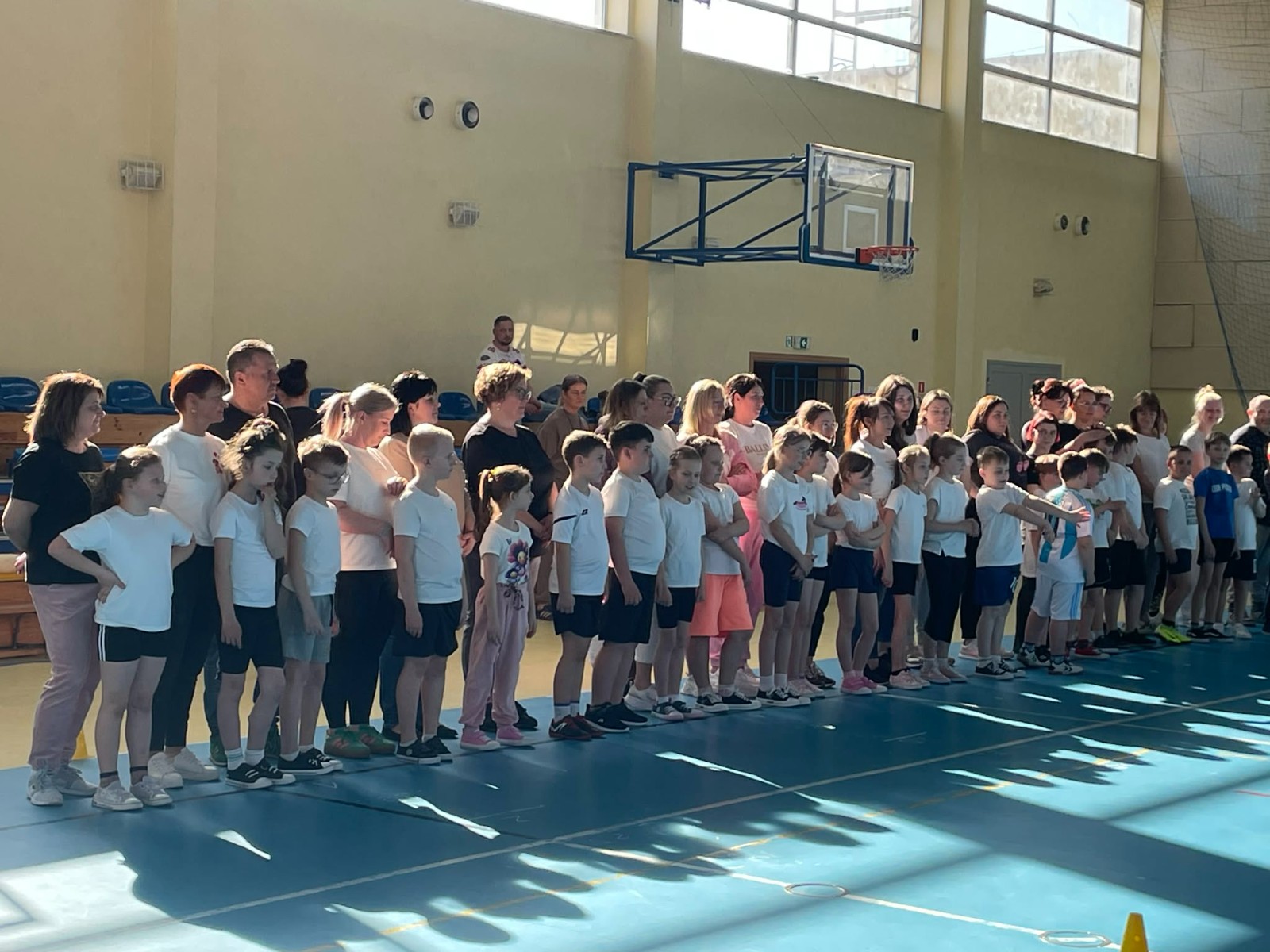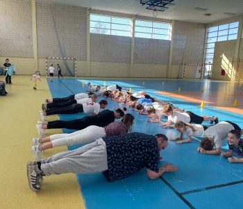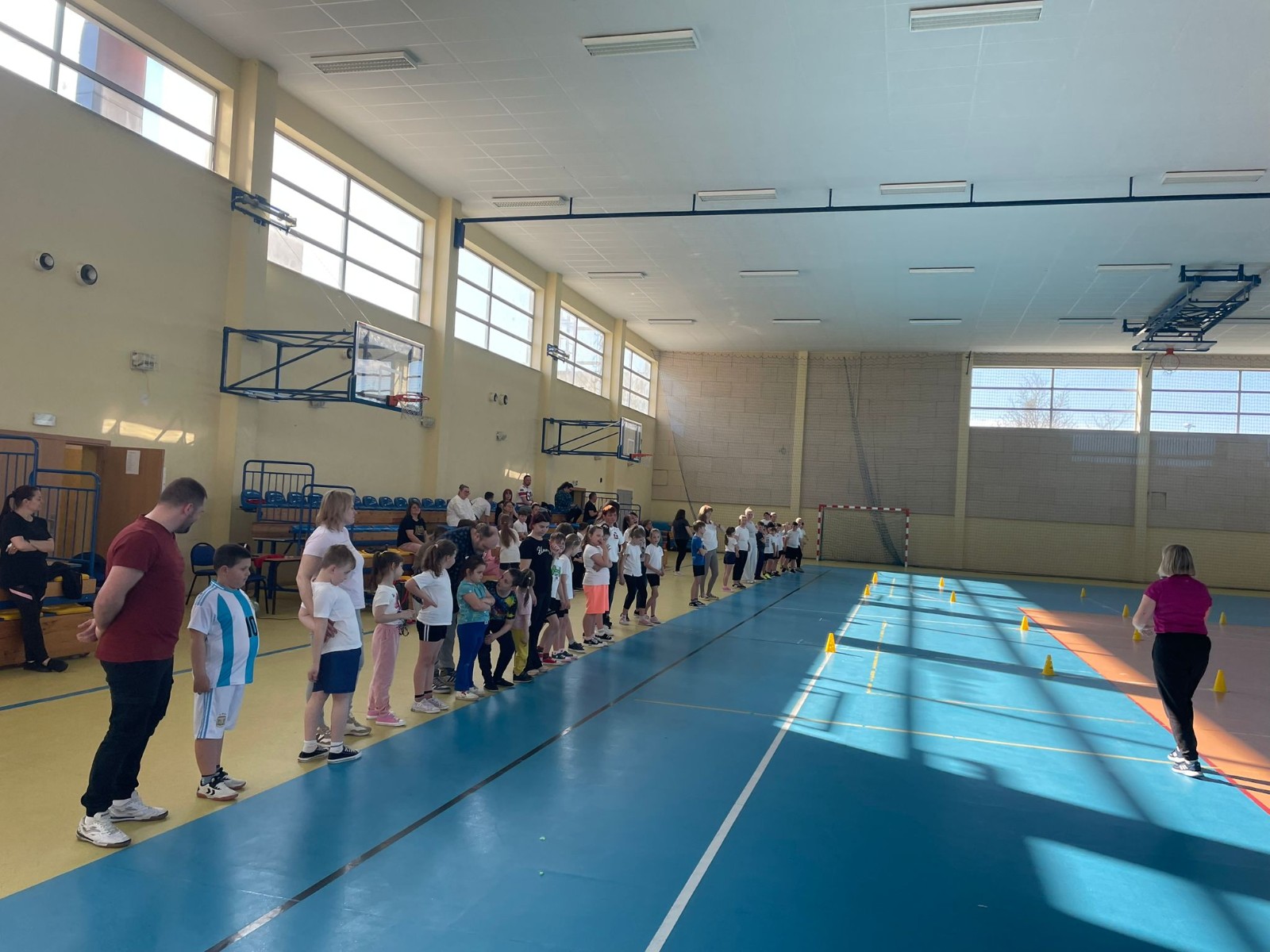 Druga część wywiadówki odbyła się w hali sportowej szkoły i miała charakter praktyczny. Po wspólnej rozgrzewce oraz zabawach ruchowych zaprezentowano rodzicom testy sprawnościowe omawiane wcześniej w części teoretycznej. Rodzice wraz z dziećmi aktywnie uczestniczyli w wykonywaniu ćwiczeń wchodzących w skład testów. Towarzyszyła temu radosna atmosfera, pełna śmiechu, zabawy i zdrowej rywalizacji. Dzięki temu rodzice mogli w praktyce zapoznać się z przebiegiem testów oraz porównać własne możliwości z wynikami swoich dzieci. Dzieci natomiast miały okazję obserwować aktywność fizyczną swoich rodziców.