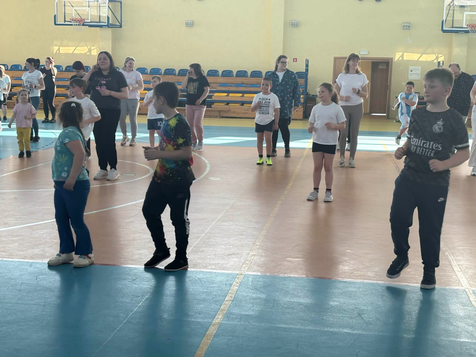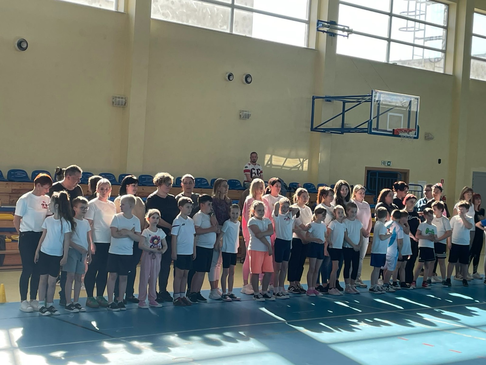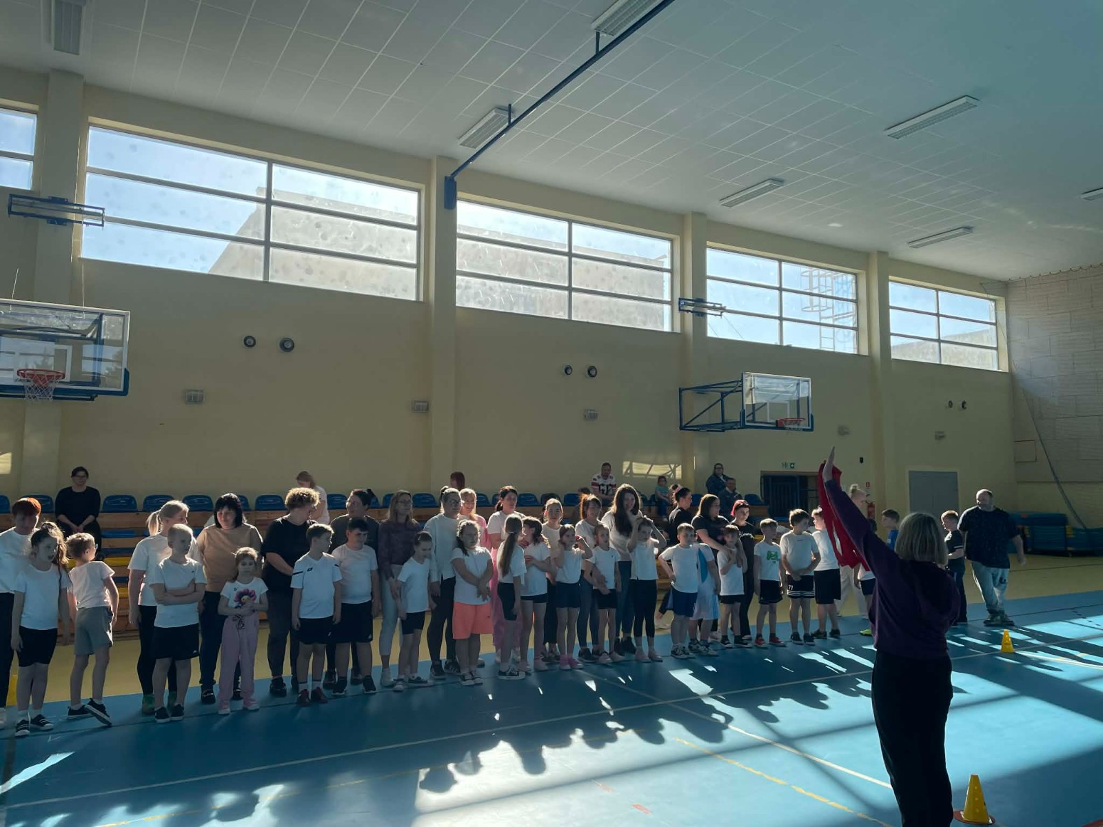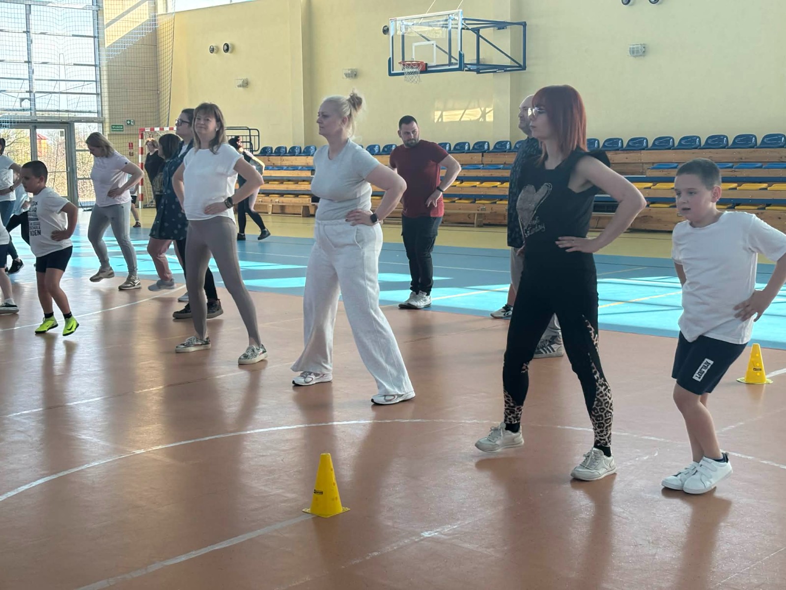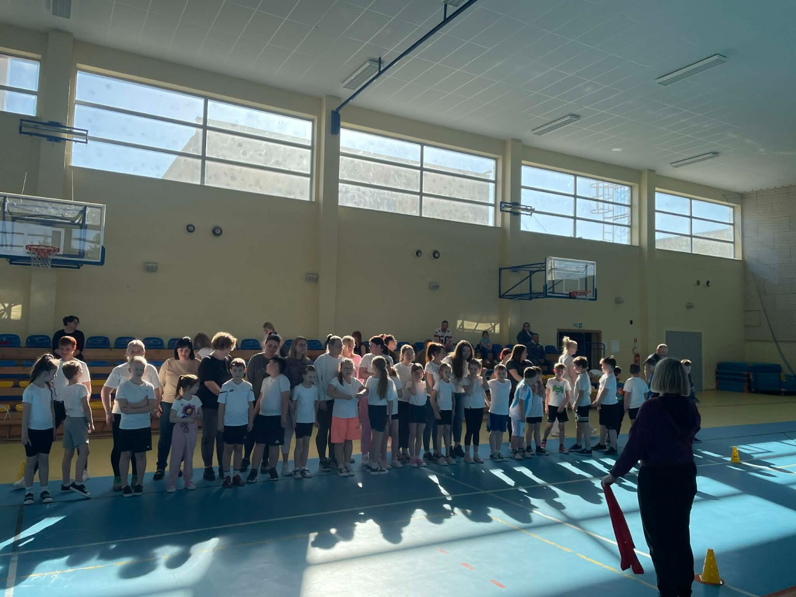 Druga część wywiadówki odbyła się w hali sportowej szkoły i miała charakter praktyczny. Po wspólnej rozgrzewce oraz zabawach ruchowych zaprezentowano rodzicom testy sprawnościowe omawiane wcześniej w części teoretycznej. Rodzice wraz z dziećmi aktywnie uczestniczyli w wykonywaniu ćwiczeń wchodzących w skład testów. Towarzyszyła temu radosna atmosfera, pełna śmiechu, zabawy i zdrowej rywalizacji. Dzięki temu rodzice mogli w praktyce zapoznać się z przebiegiem testów oraz porównać własne możliwości z wynikami swoich dzieci. Dzieci natomiast miały okazję obserwować aktywność fizyczną swoich rodziców.