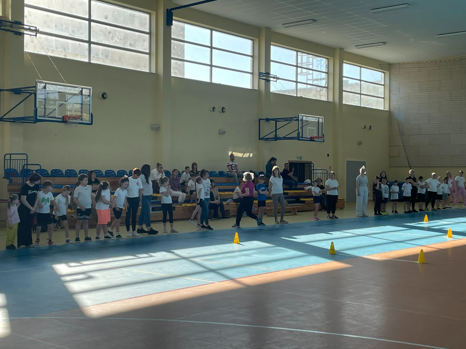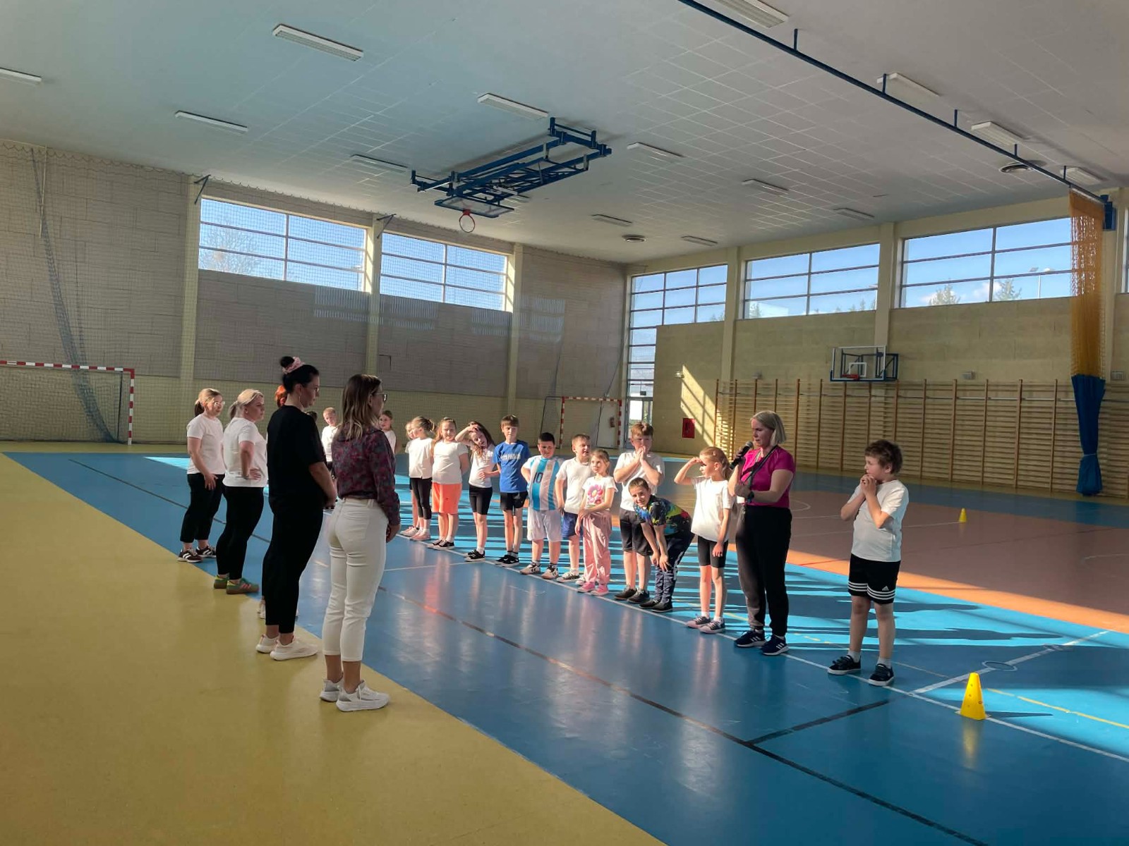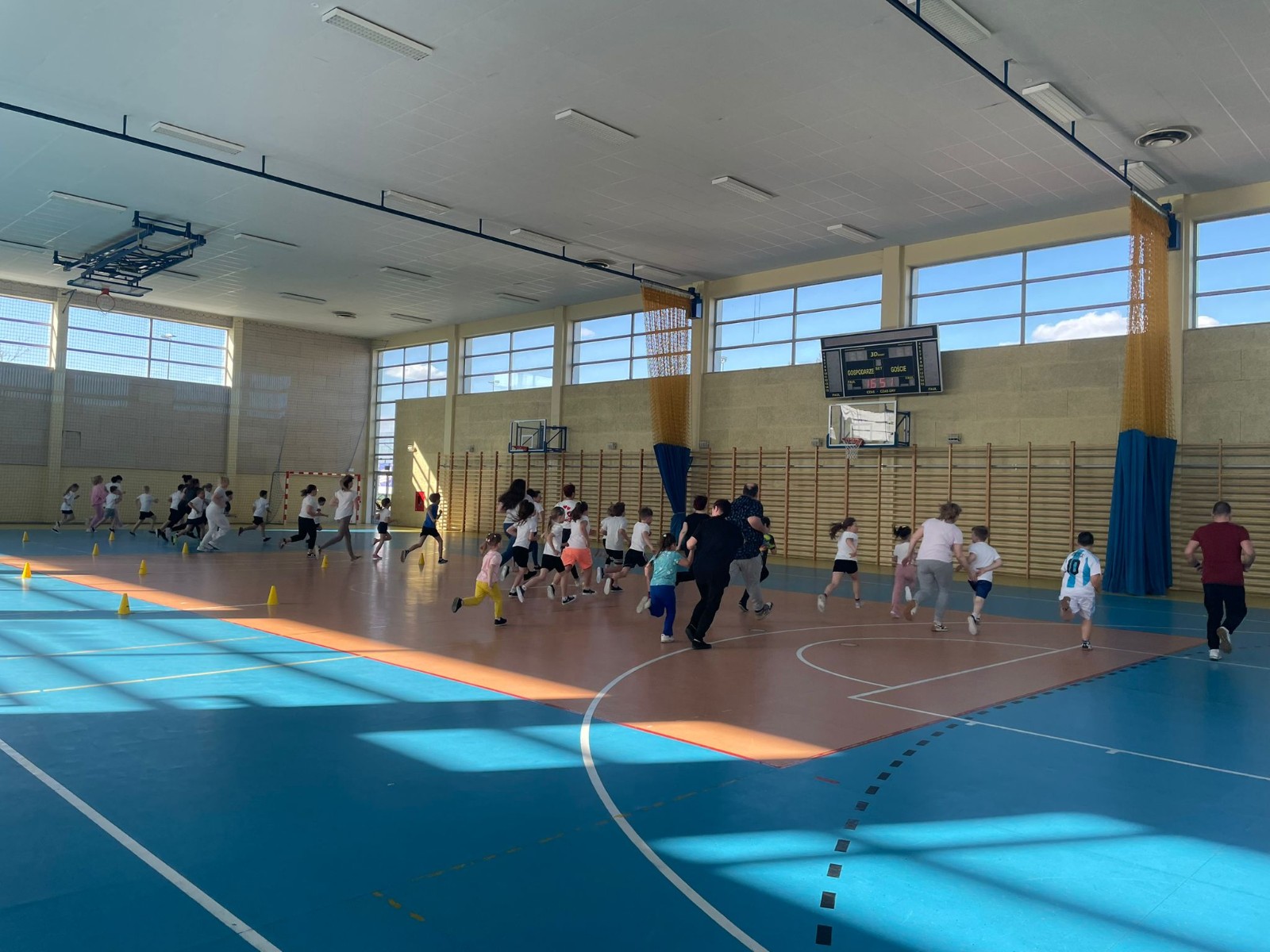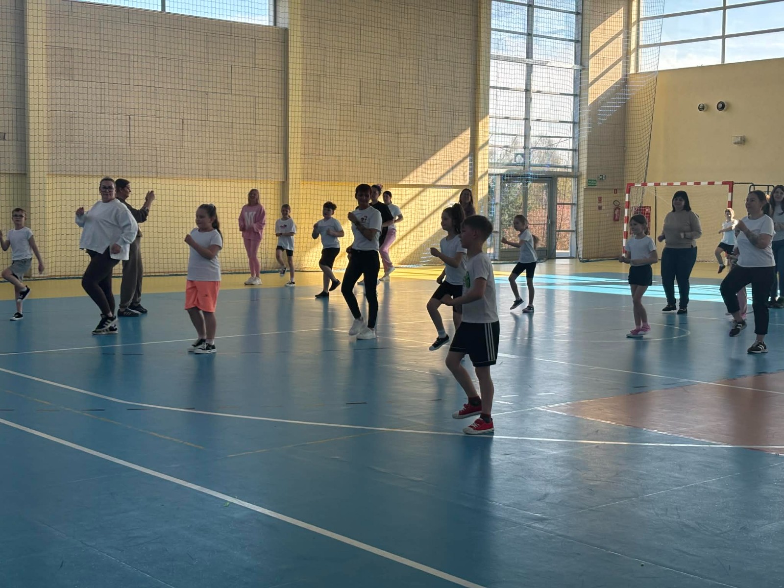 Druga część wywiadówki odbyła się w hali sportowej szkoły i miała charakter praktyczny. Po wspólnej rozgrzewce oraz zabawach ruchowych zaprezentowano rodzicom testy sprawnościowe omawiane wcześniej w części teoretycznej. Rodzice wraz z dziećmi aktywnie uczestniczyli w wykonywaniu ćwiczeń wchodzących w skład testów. Towarzyszyła temu radosna atmosfera, pełna śmiechu, zabawy i zdrowej rywalizacji. Dzięki temu rodzice mogli w praktyce zapoznać się z przebiegiem testów oraz porównać własne możliwości z wynikami swoich dzieci. Dzieci natomiast miały okazję obserwować aktywność fizyczną swoich rodziców.