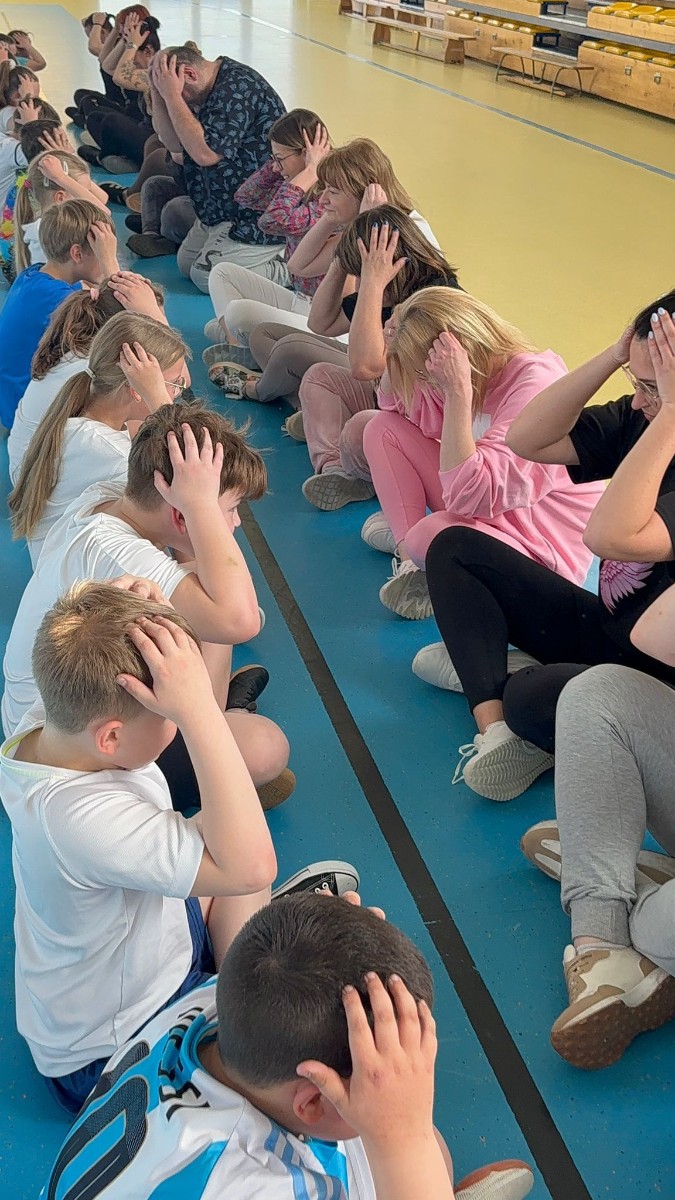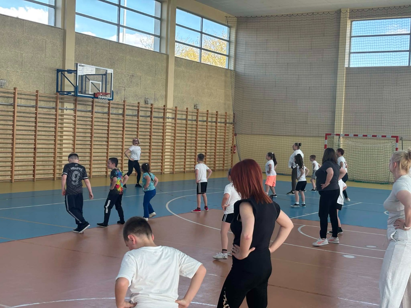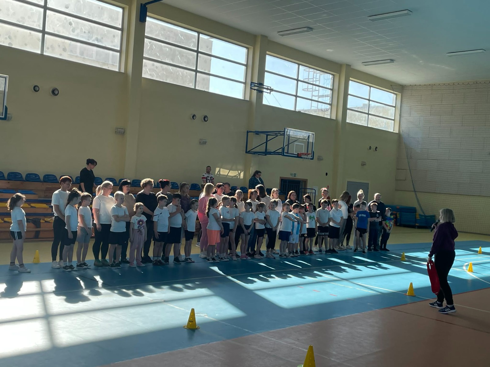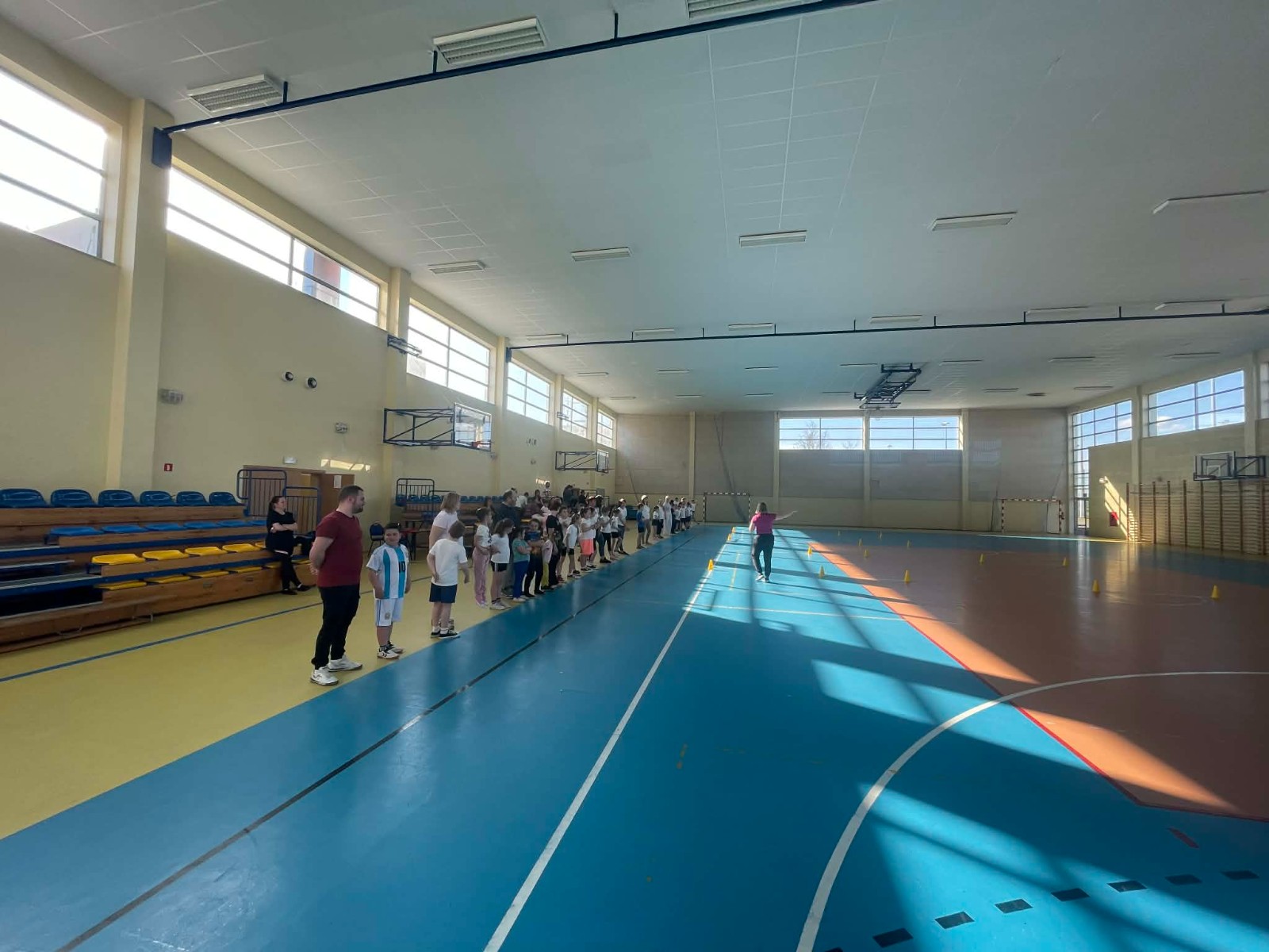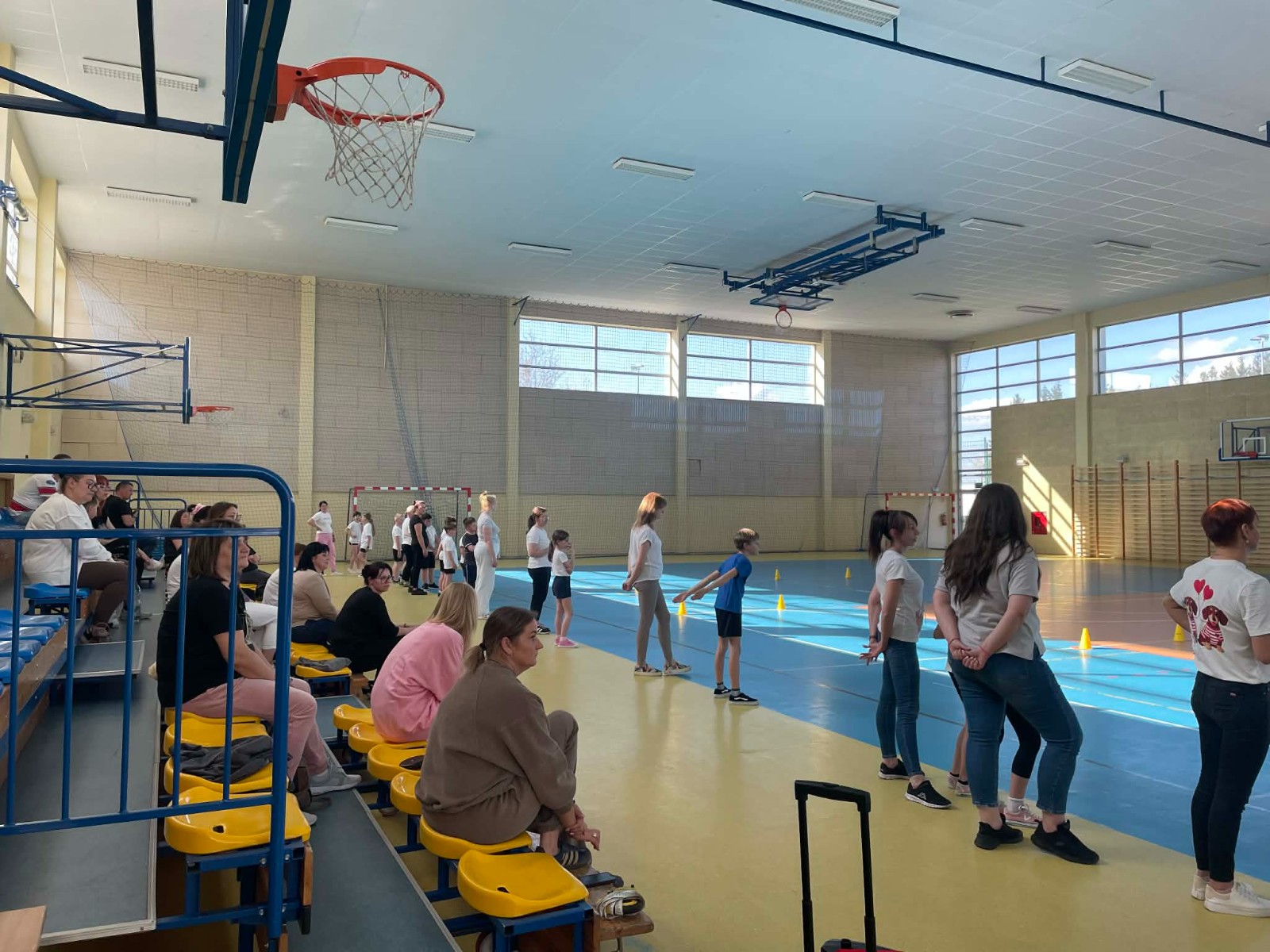 Druga część wywiadówki odbyła się w hali sportowej szkoły i miała charakter praktyczny. Po wspólnej rozgrzewce oraz zabawach ruchowych zaprezentowano rodzicom testy sprawnościowe omawiane wcześniej w części teoretycznej. Rodzice wraz z dziećmi aktywnie uczestniczyli w wykonywaniu ćwiczeń wchodzących w skład testów. Towarzyszyła temu radosna atmosfera, pełna śmiechu, zabawy i zdrowej rywalizacji. Dzięki temu rodzice mogli w praktyce zapoznać się z przebiegiem testów oraz porównać własne możliwości z wynikami swoich dzieci. Dzieci natomiast miały okazję obserwować aktywność fizyczną swoich rodziców.