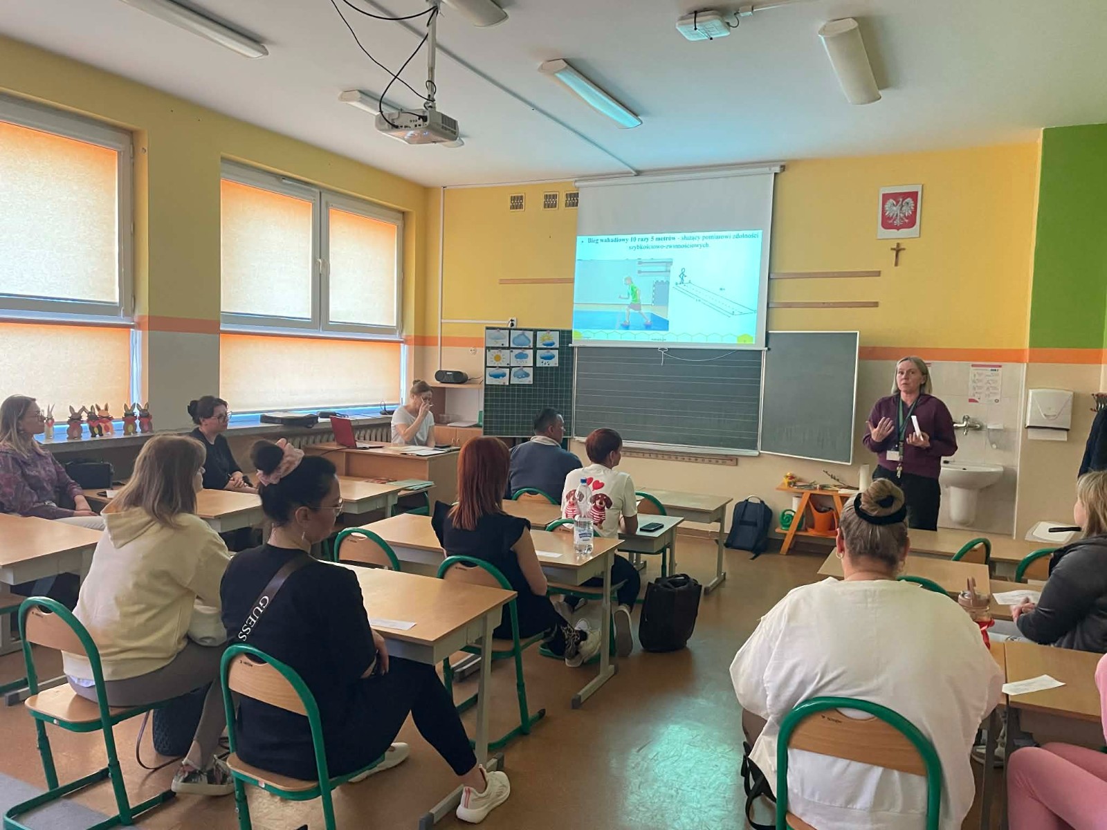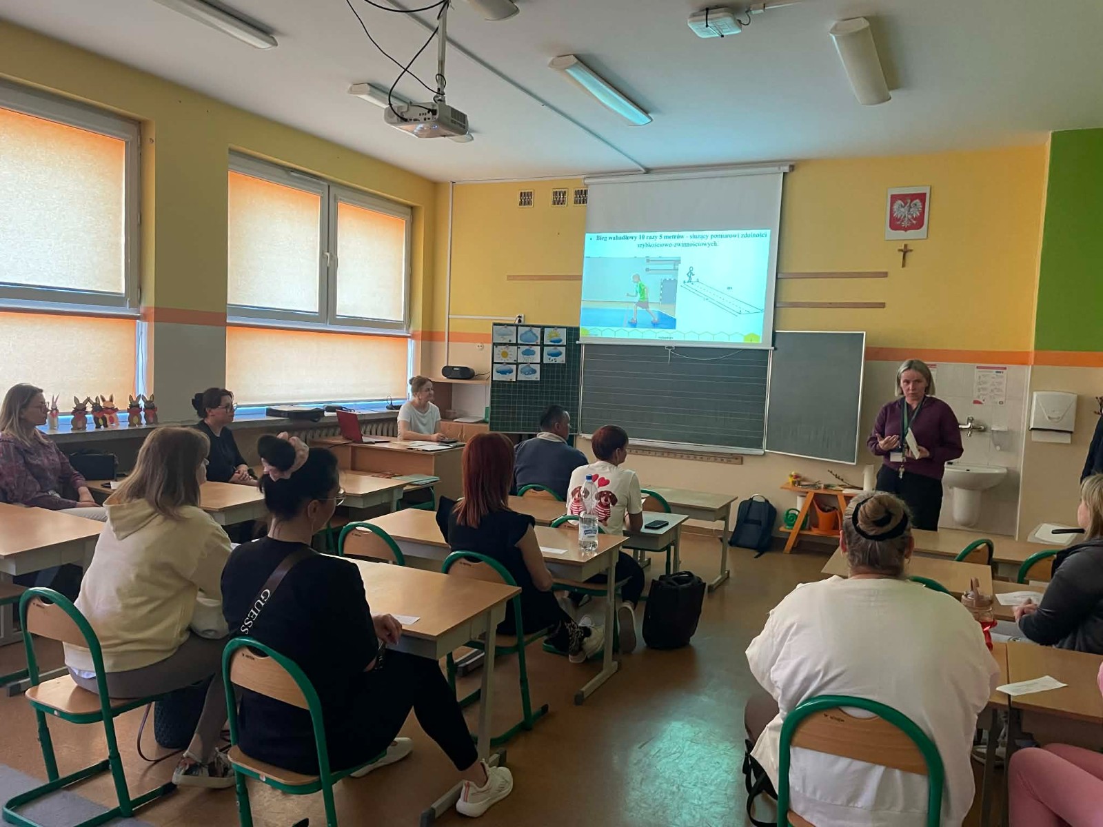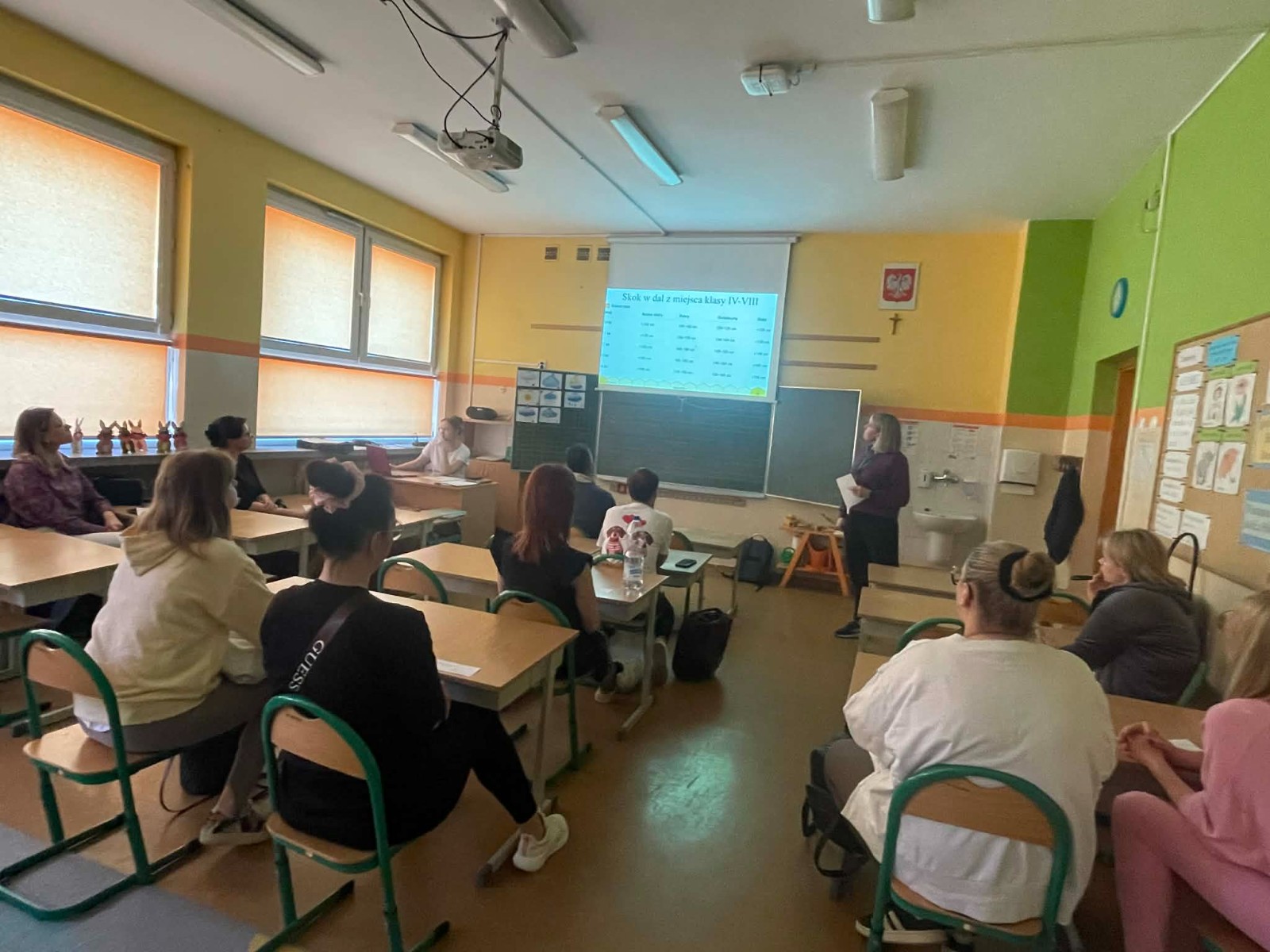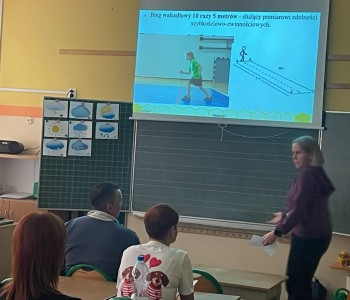Pierwsza część spotkania miała charakter teoretyczny i odbyła się w formie prezentacji. Przedstawiono wyniki testów sprawności fizycznej przeprowadzonych w klasach 2b i 2c. Rodzice uzyskali szczegółowe informacje dotyczące osiągnięć swoich dzieci. Omówiono zarówno mocne strony uczniów, jak i obszary wymagające poprawy oraz trudności, z jakimi borykają się dzieci. Zwrócono również uwagę na pozytywne aspekty rozwoju fizycznego uczniów. Ta część spotkania cieszyła się dużym zainteresowaniem ze strony rodziców.