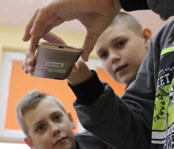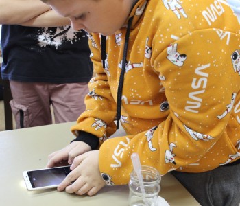 Doświadczenie „Soczewka z kropli wody” zawarte w module WODA programu LABORATORIA PRZYSZŁOŚCI wymagało skupienia uwagi. Utrzymanie kropli wody na telefonie odwróconym obiektywem do dołu było dużym wyzwaniem, a ustawienie ostrości obrazu jeszcze większym. Za pomocą smartfonowego mikroskopu uczniowie „zajrzeli” rozwielitce w oko oraz sprawdzili, czy liść żyworódki ma gładką powierzchnię.
