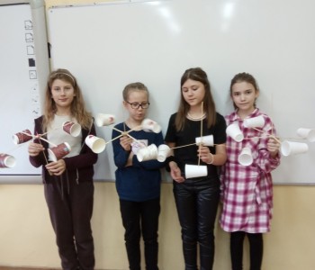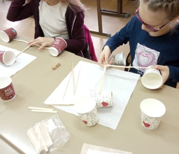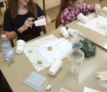Za pomocą gorącego kleju z kubeczków jednorazowych i mieszadeł do kawy uczniowie wykonali ramiona wiatraka. Jego podstawę stanowiła plastikowa butelka wypełniona piaskiem. Doskonałym źródłem strumienia powietrza wprawiającego w ruch wiatrak okazała się suszarka do włosów. Na prędkość obrotów wiatraka miała wpływ zarówno odległość źródła wiatru jak i moc nawiewu.