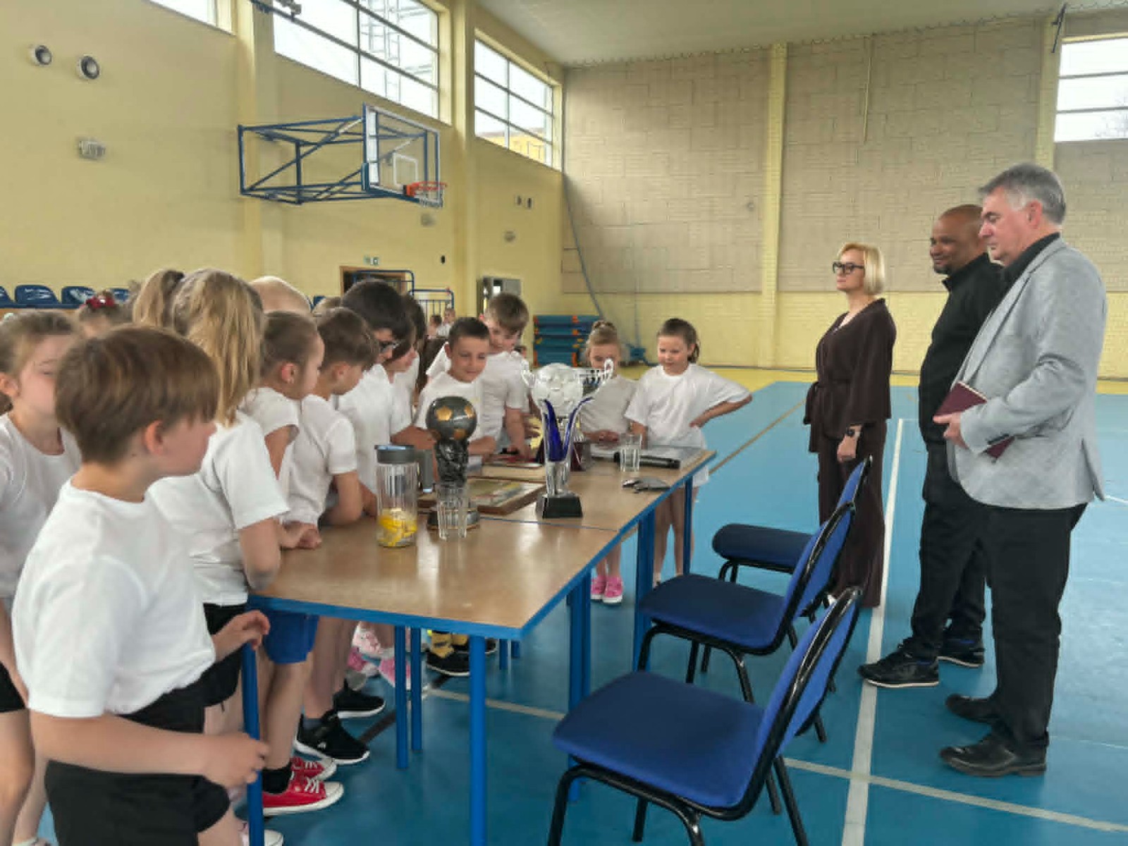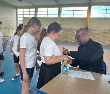 Na zakończenie spotkania nasz gość wręczył szkołom nagrody. Następnie złożono podziękowania Panu Ediemu za poświęcony czas, inspirujące spotkanie oraz motywację, jaką przekazał młodym uczestnikom programu.