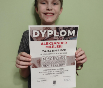 Uczeń naszej szkoły Aleksander Milejski z klasy VII b zdobył II miejsce w ogólnopolskim konkursie „Pamiątki kalejdoskopem przeszłości” organizowanym przez Muzeum Dom Rodziny Pileckich.
